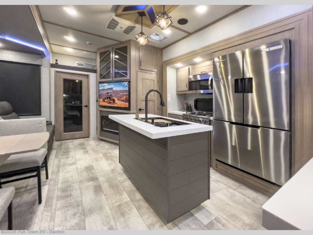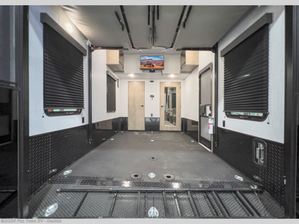 Load up your toys, your clothes and food and start your adventure as you smoothing tow this fifth wheel to your campsite. You will enjoy the Fast Ramp rear ramp door, the Ram-Air garage vents on both sides, and the 2,500 lb. rated flush-mount tie-downs to keep your toys secure. You will surely appreciate the full bathroom and LED TV, plus the option to add Happi-Jac rollover sofas/table with a top bed. The main area provides a living and kitchen area with a 49" LED TV and a fireplace, theatre seating and a free standing dinette, plus full kitchen amenities. There is also a new Smart Sink with a removable cutting board, produce strainer and glass rinser you are sure to love. Head up front to use the full bathroom with a one-piece fiberglass shower with a glass door and teak seat, and fall quickly to sleep on your own queen bed or choose a king option in the front bedroom.