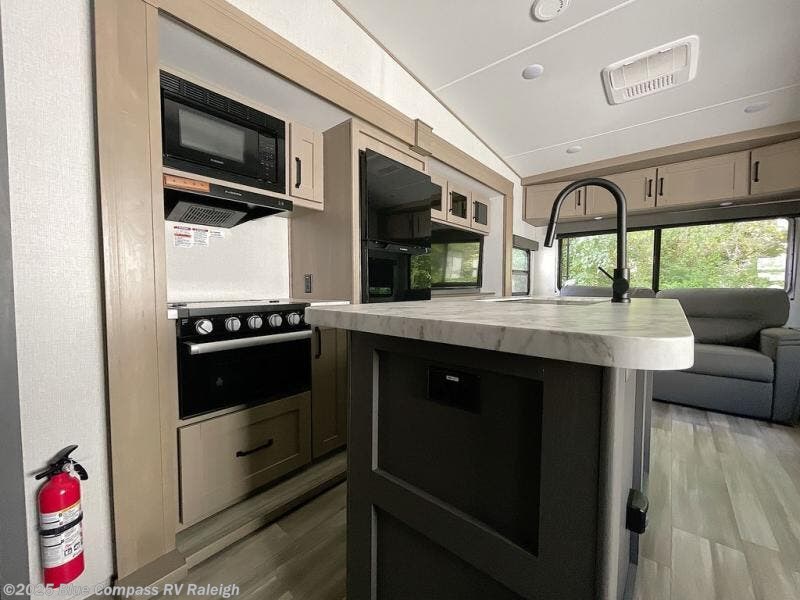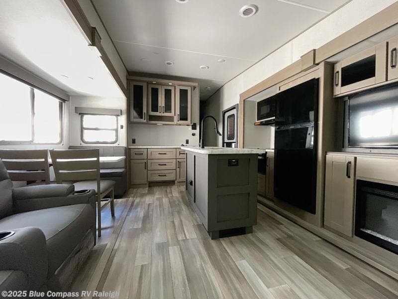 You'll love the amount of space you have in this fifth wheel thanks to the dual opposing slides in the rear living area/kitchen. Your friends and family can relax on the tri-fold sofa or theater seating across from the high-definition 40" LED TV. There is also a booth dinette or you can choose the optional swivel dinette if you prefer that seating. The chef of your group will appreciate having a kitchen island that will provide more counter space, plus there is a hutch with overhead cabinets for nice dishes. A full bath onboard lets you clean up each day and the front private bedroom includes a queen bed just like at home. You'll also love spending time outdoors under the electric awning, and there is an unobstructed pass-thru storage for fishing poles, hiking gear, and camp chairs!