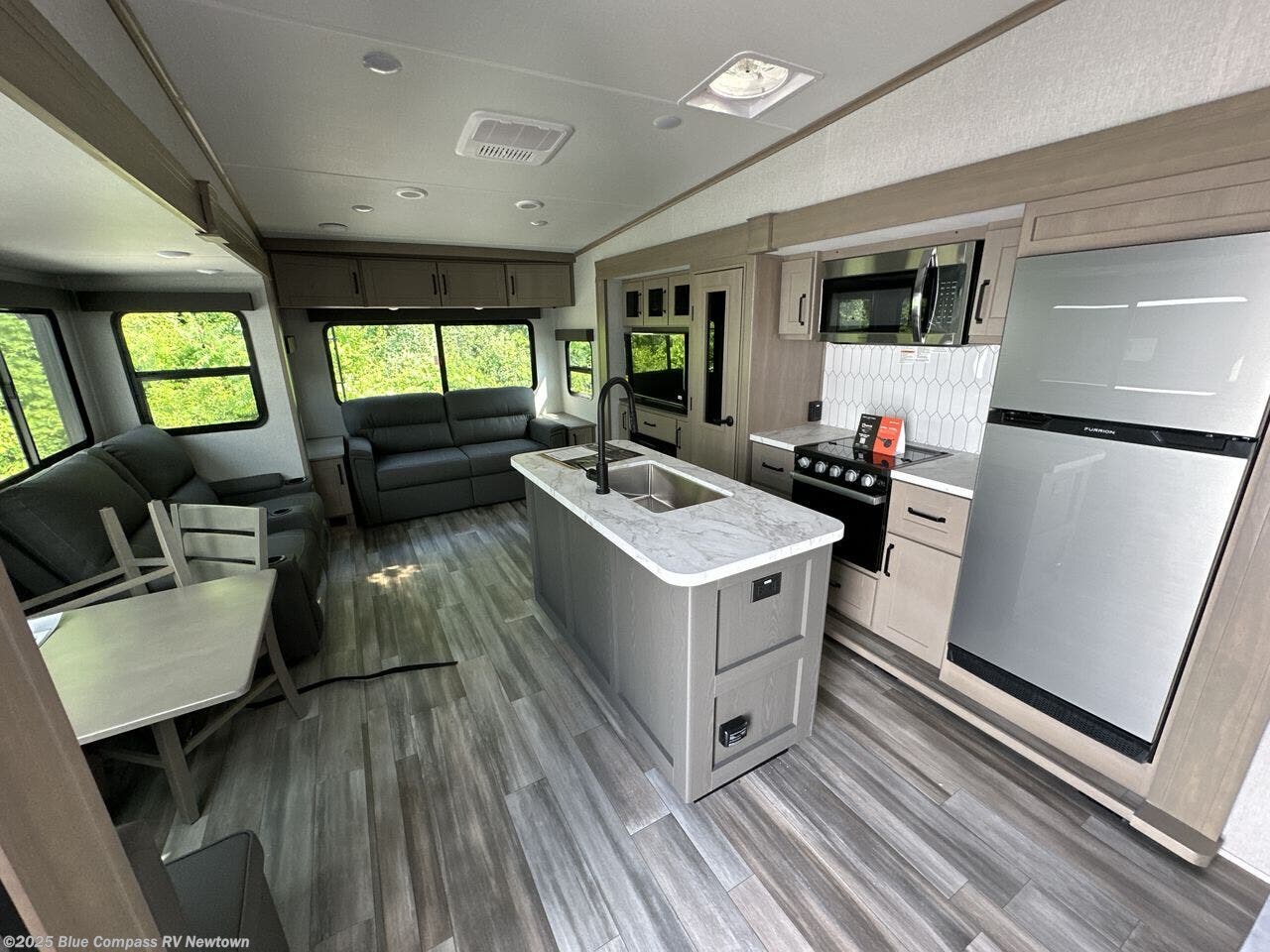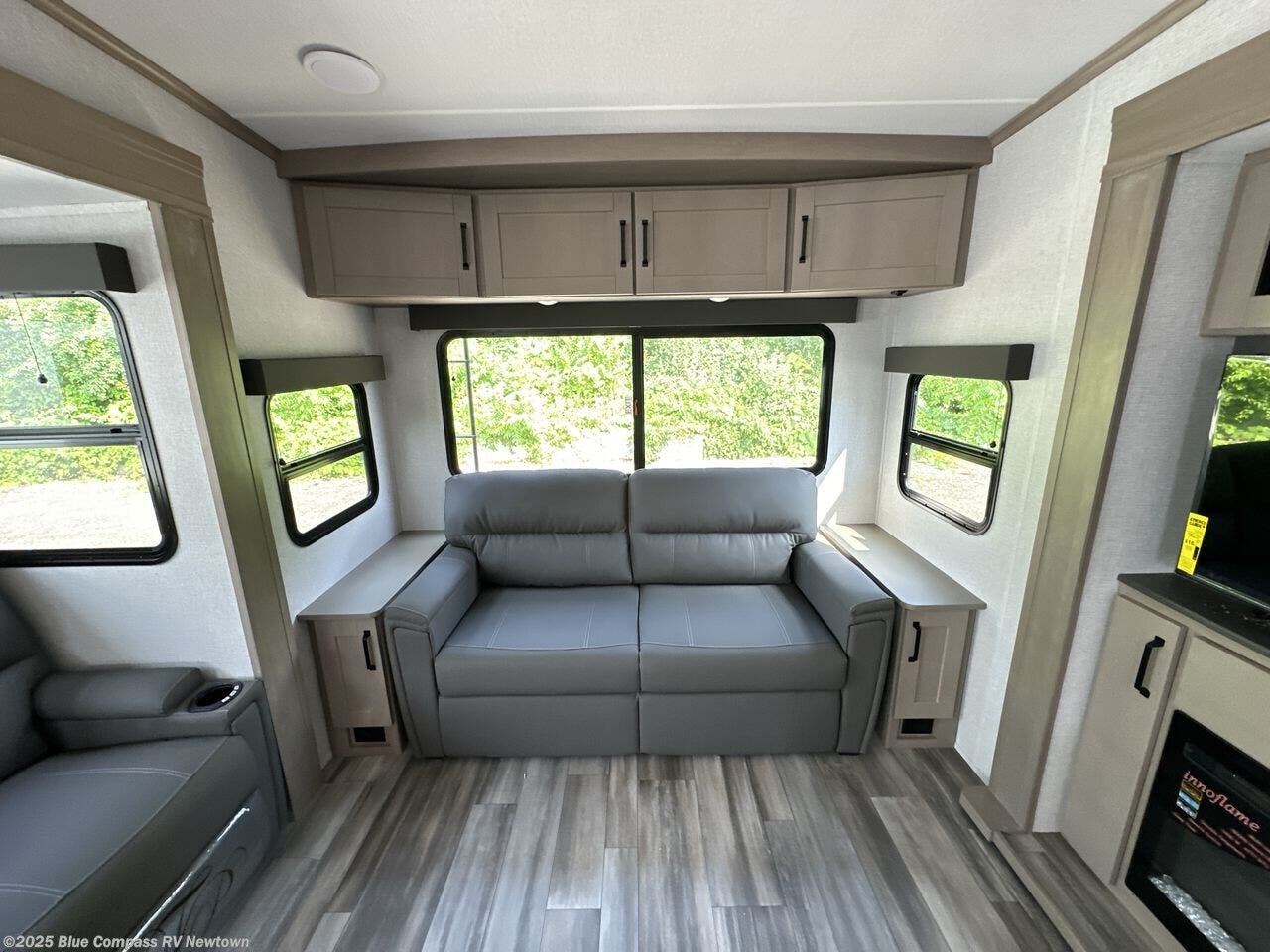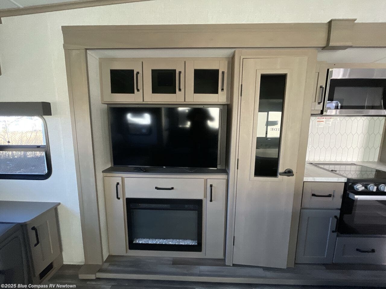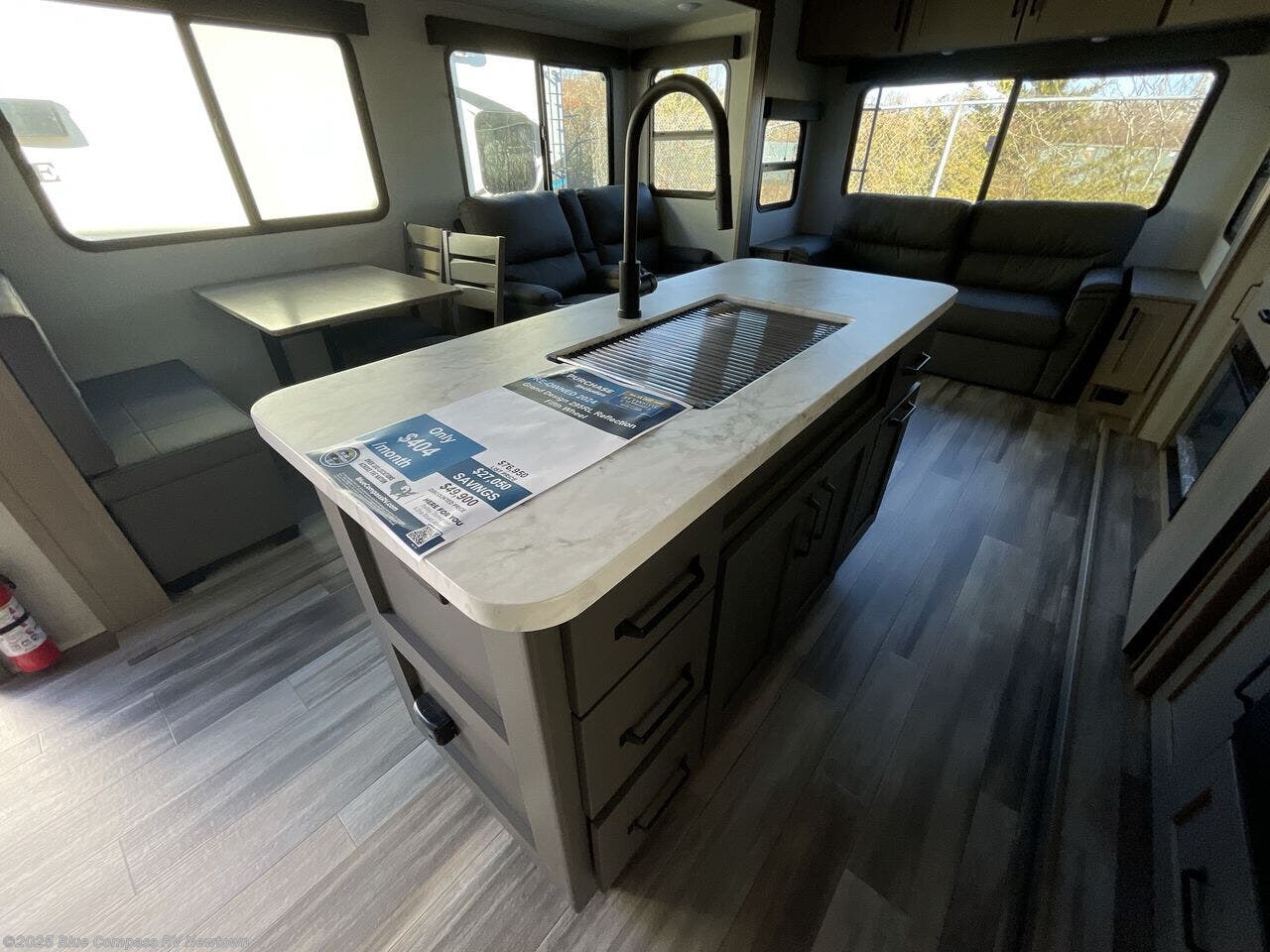 Get ready to enjoy everything the campgrounds and surrounding area has to offer when you are setup to camp in this fifth wheel! The two electric awnings offer protected areas creating outdoor living spaces, just grab your camping chairs from the unobstructed pass-through storage. And the interior offers a spacious living area and kitchen combination with two slide outs. You can sit on the tri-fold sofa or the booth dinette with an option for a swivel dinette. The hutch and kitchen island offer counter space to prepare and serve meals, and there is a large pantry for goodies. The 40" LED HDTV with fireplace below provides entertainment before bedtime or on a rainy day. And the front bedroom offers privacy, a walk-around queen bed, storage, and it is next to the full bathroom which is just a few steps down the hallway.