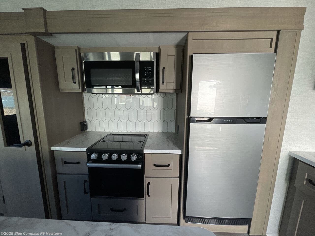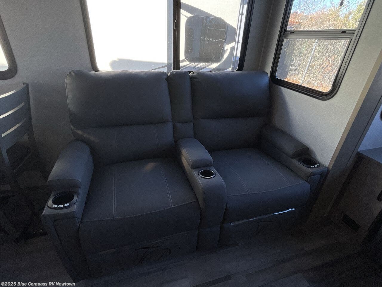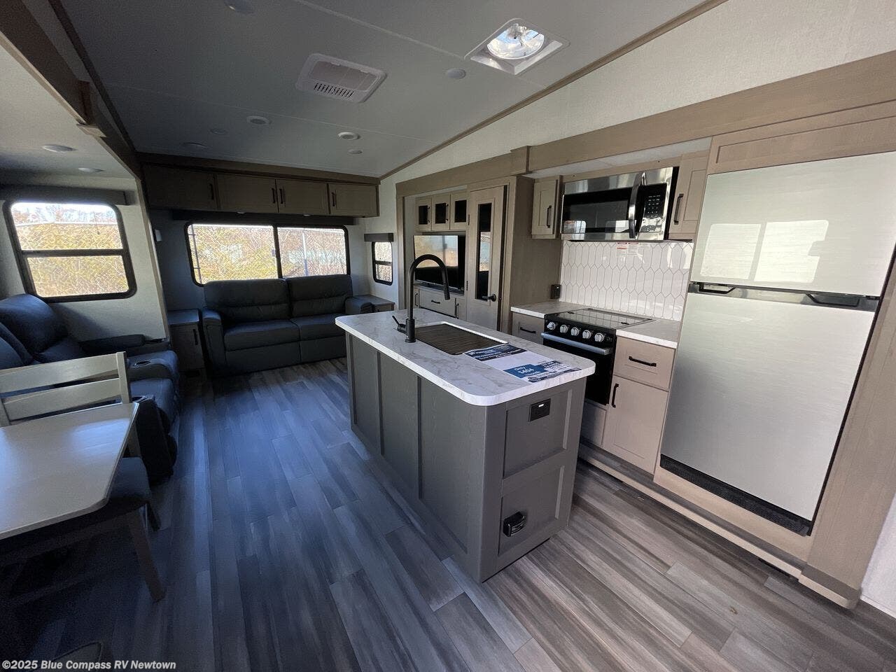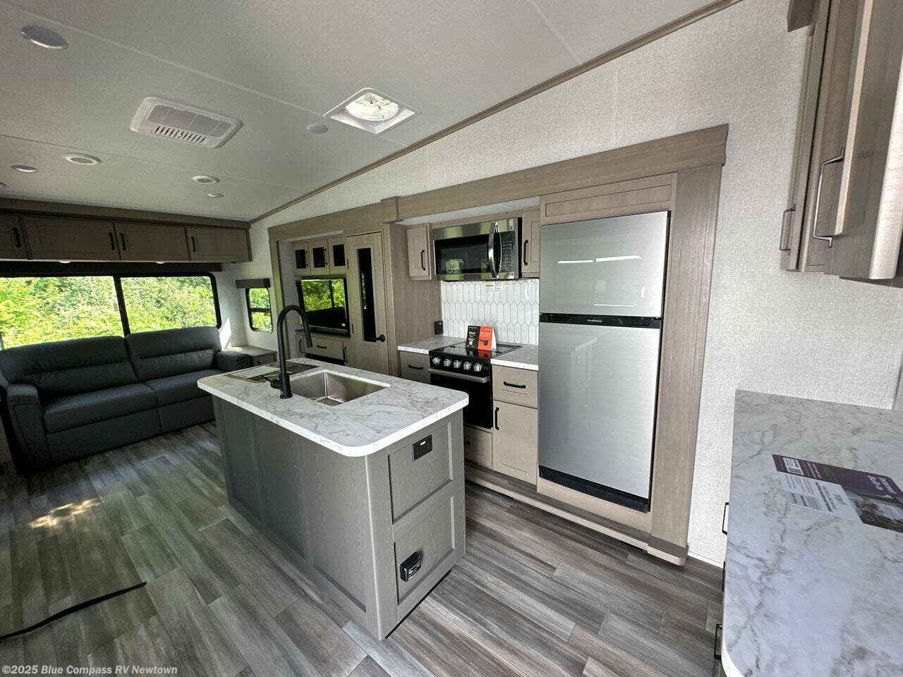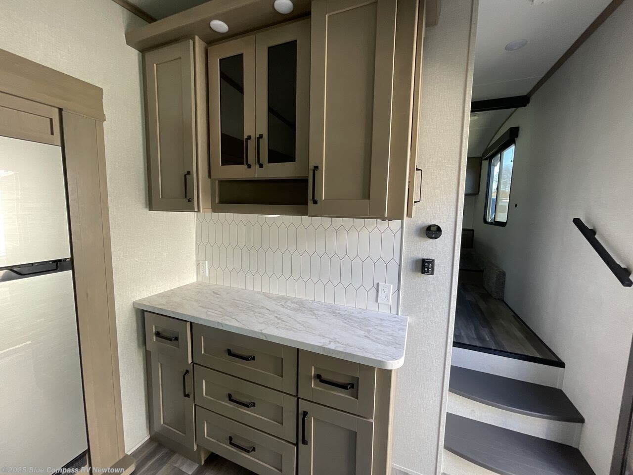 Get ready to enjoy everything the campgrounds and surrounding area has to offer when you are setup to camp in this fifth wheel! The two electric awnings offer protected areas creating outdoor living spaces, just grab your camping chairs from the unobstructed pass-through storage. And the interior offers a spacious living area and kitchen combination with two slide outs. You can sit on the tri-fold sofa or the booth dinette with an option for a swivel dinette. The hutch and kitchen island offer counter space to prepare and serve meals, and there is a large pantry for goodies. The 40" LED HDTV with fireplace below provides entertainment before bedtime or on a rainy day. And the front bedroom offers privacy, a walk-around queen bed, storage, and it is next to the full bathroom which is just a few steps down the hallway.