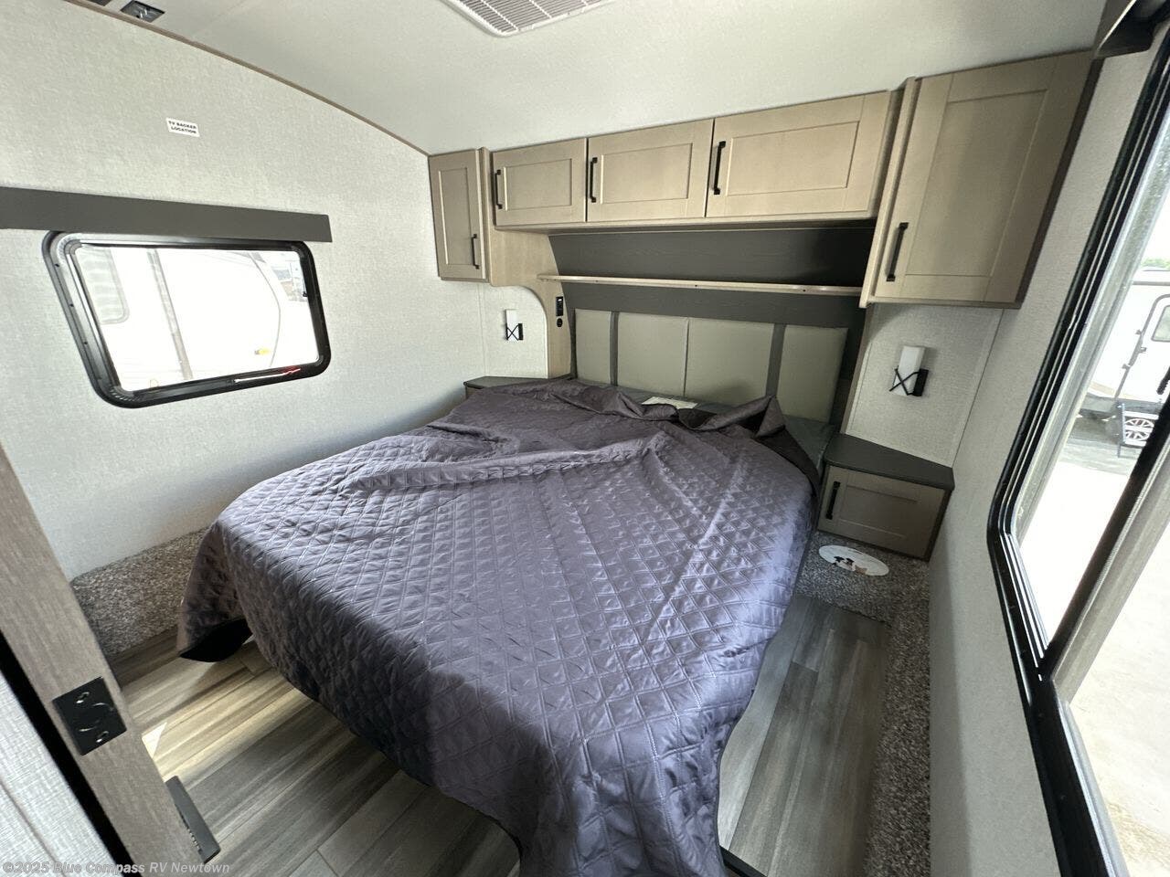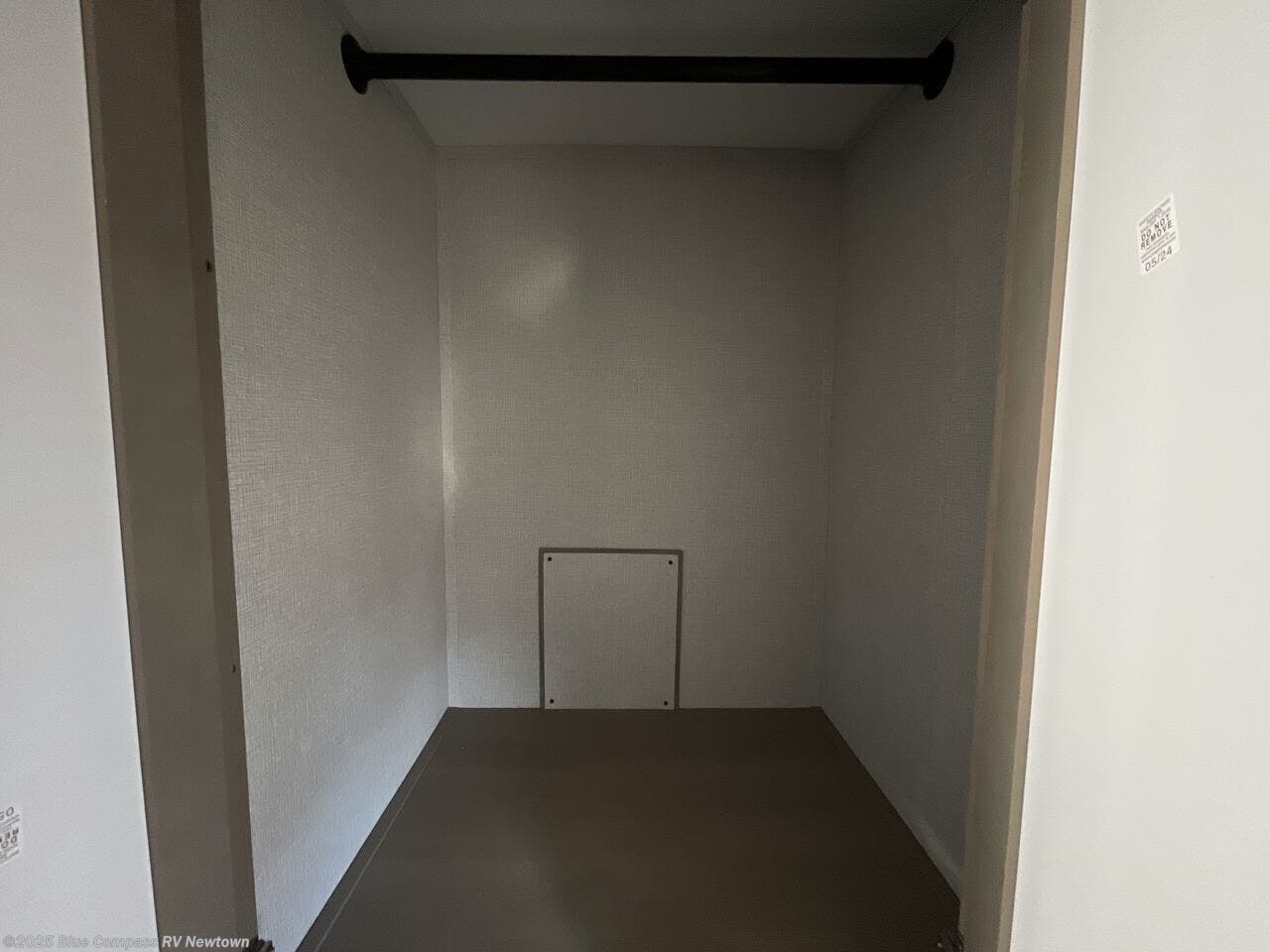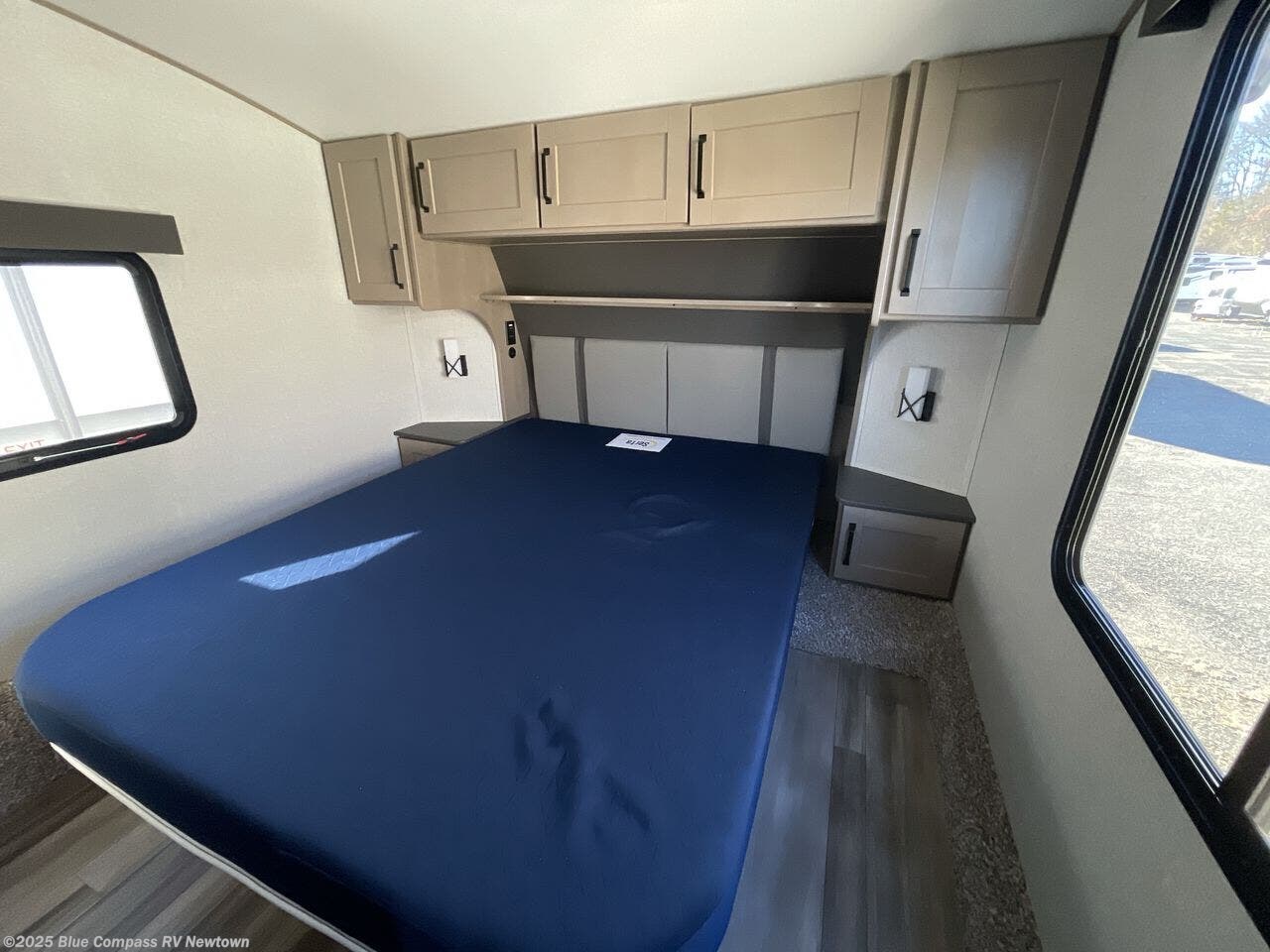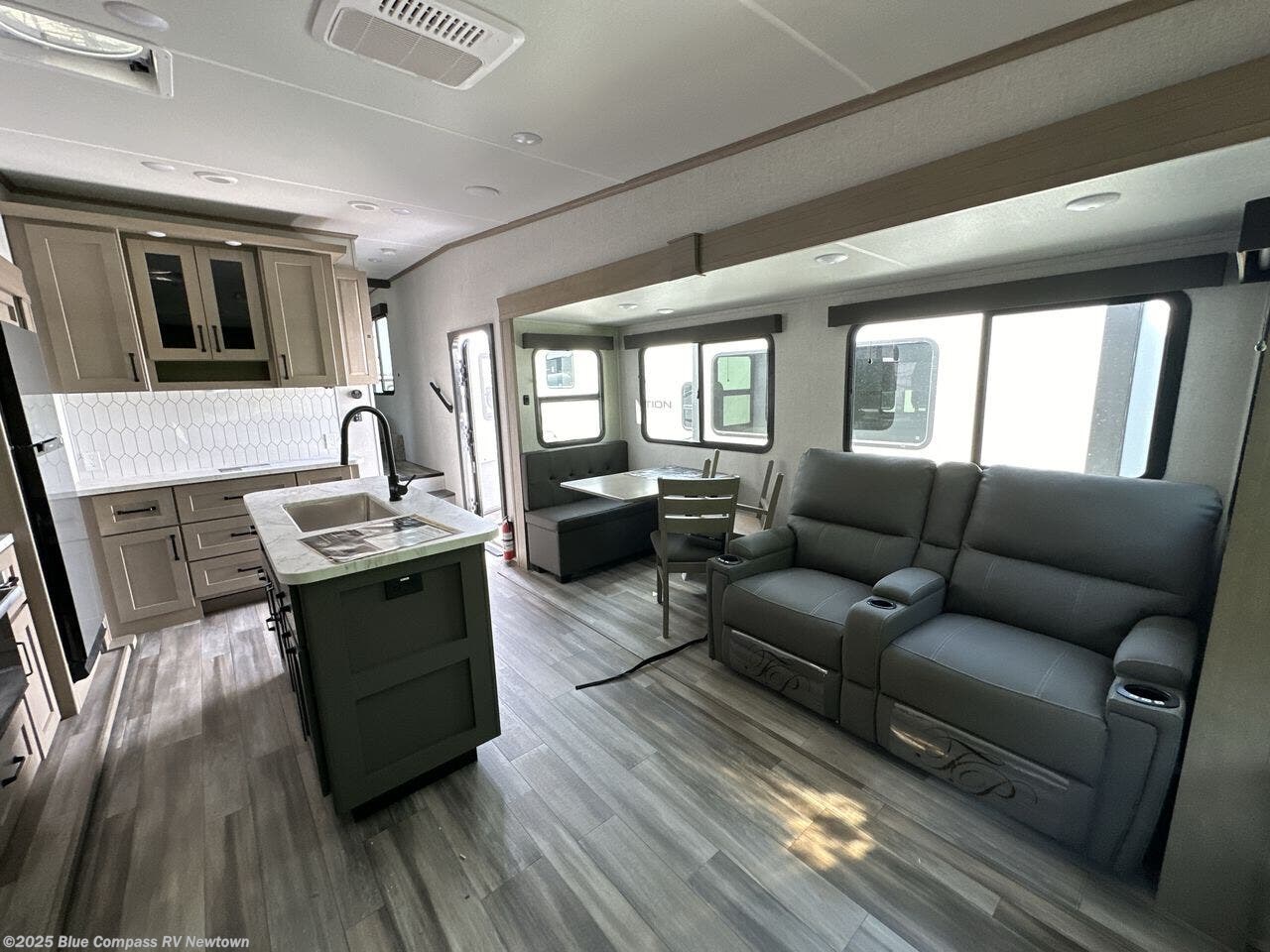 Get ready to enjoy everything the campgrounds and surrounding area has to offer when you are setup to camp in this fifth wheel! The two electric awnings offer protected areas creating outdoor living spaces, just grab your camping chairs from the unobstructed pass-through storage. And the interior offers a spacious living area and kitchen combination with two slide outs. You can sit on the tri-fold sofa or the booth dinette with an option for a swivel dinette. The hutch and kitchen island offer counter space to prepare and serve meals, and there is a large pantry for goodies. The 40" LED HDTV with fireplace below provides entertainment before bedtime or on a rainy day. And the front bedroom offers privacy, a walk-around queen bed, storage, and it is next to the full bathroom which is just a few steps down the hallway.