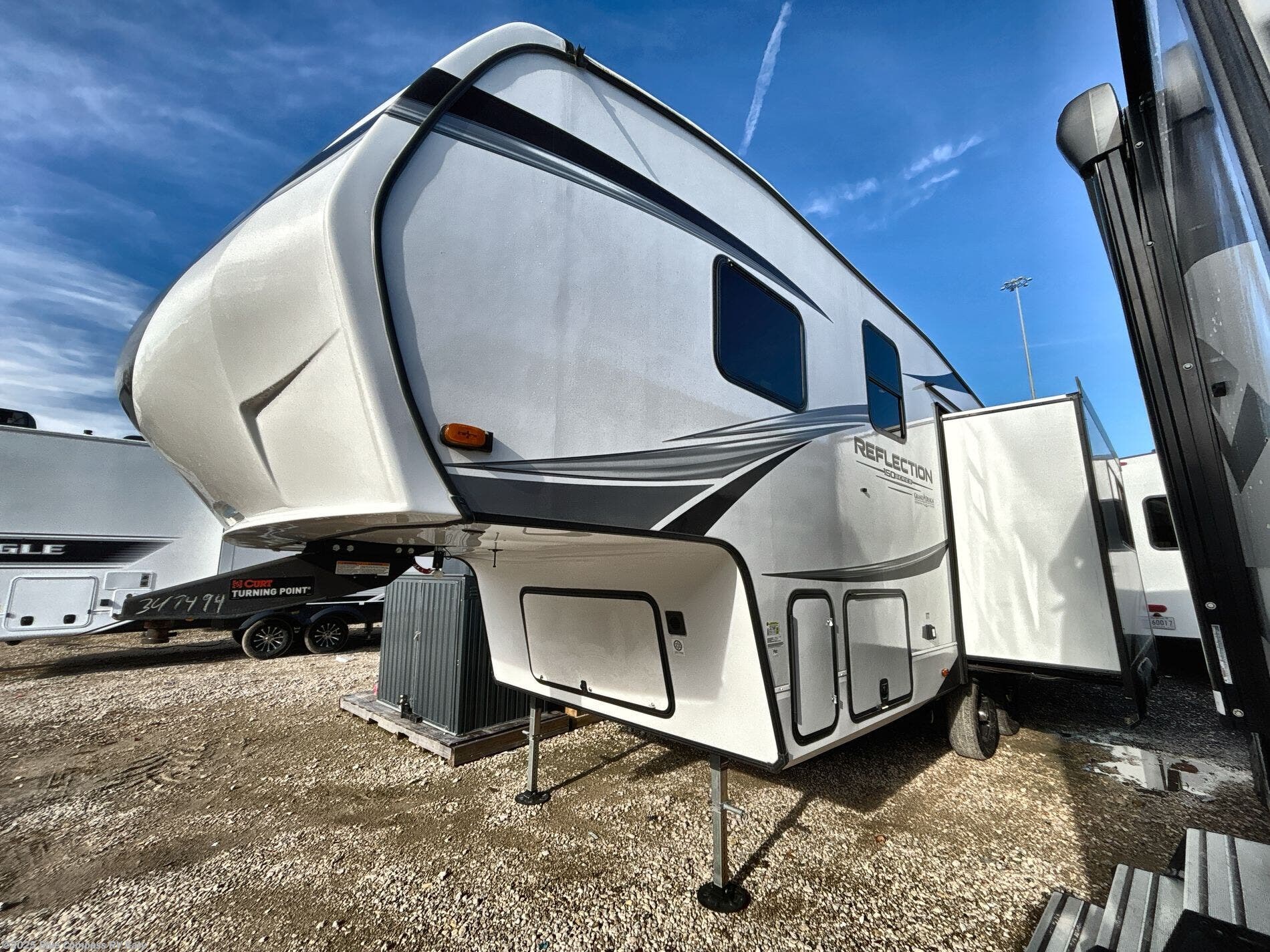 With any Reflection 150 Series fifth wheel by Grand Design, there is more available payload capacity and a broader range of half-ton trucks capable of towing this fifth wheel, and no slider hitch is needed thanks to the 90-degree turning radius which makes them short bed friendly and easier to tow. The mandatory Ultimate Power package provides a "One-Touch" automatic leveling system and a detachable power cord with LED light for easy setup, plus motion sensor pass-through lighting and entry lighting, and the Tire Linc TPMS will help you stay safe on the road. The interior offers residential luxury from the cabinetry and premium congoleum flooring, plus the booth dinette to the residential-style window treatment. Make your refined decision today!