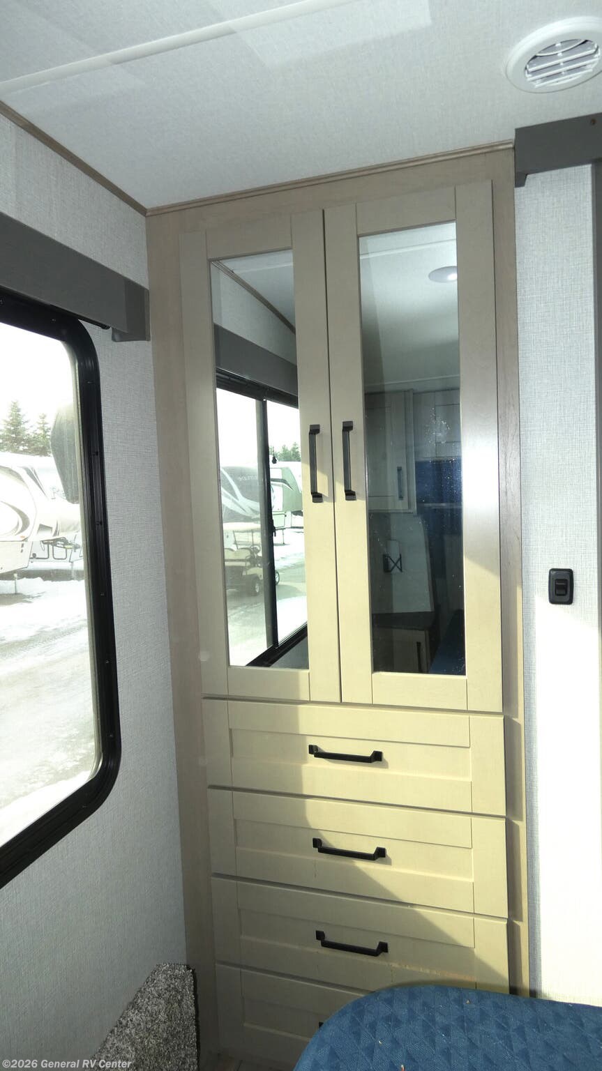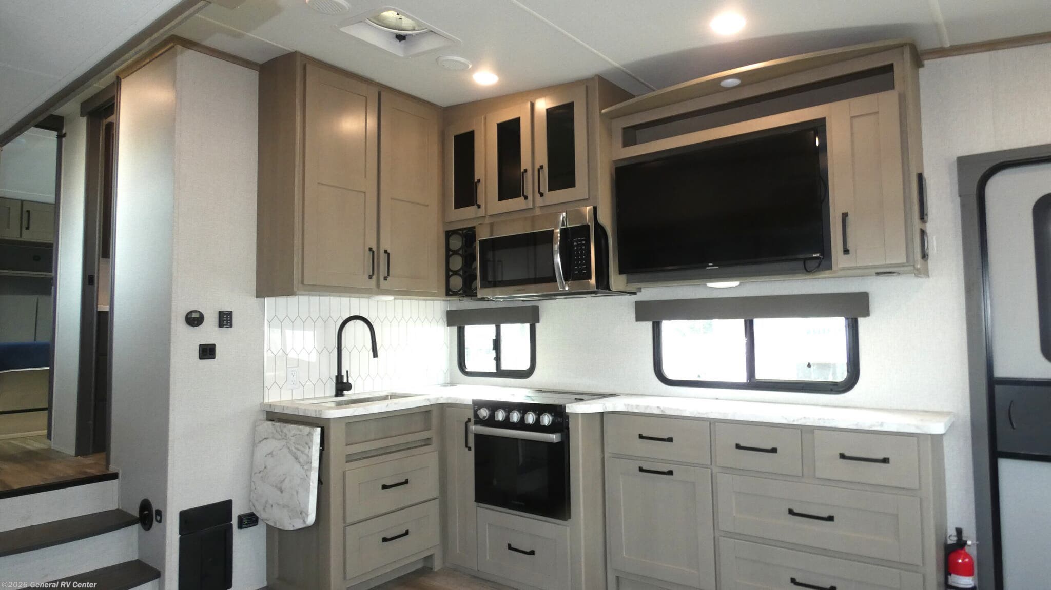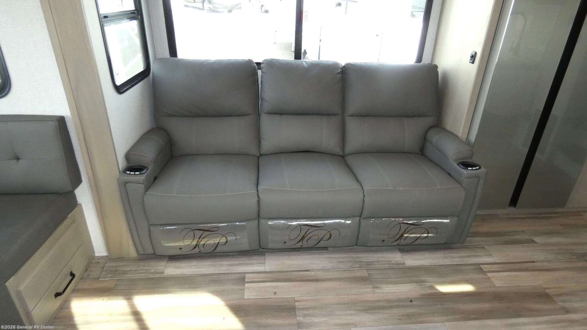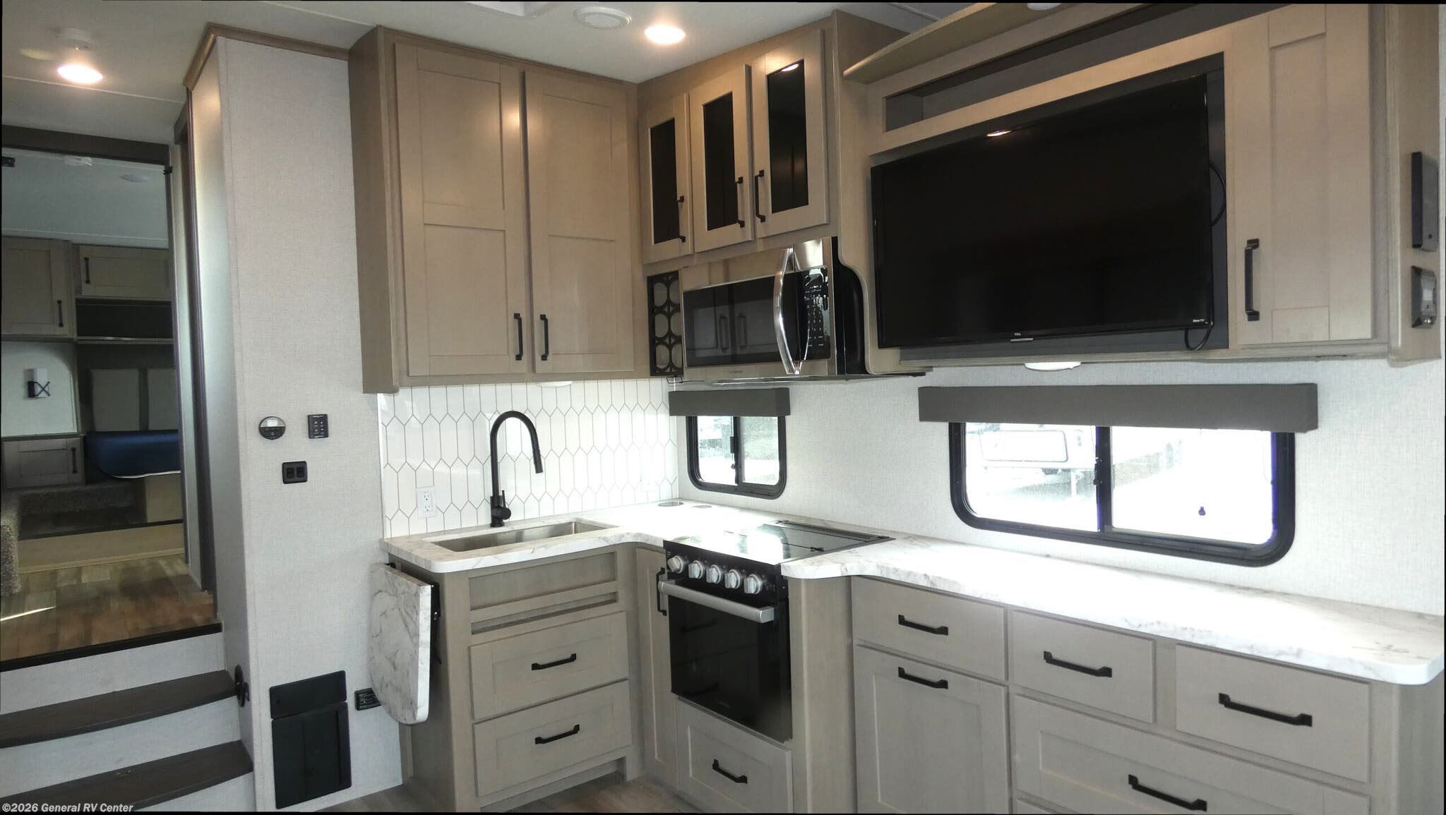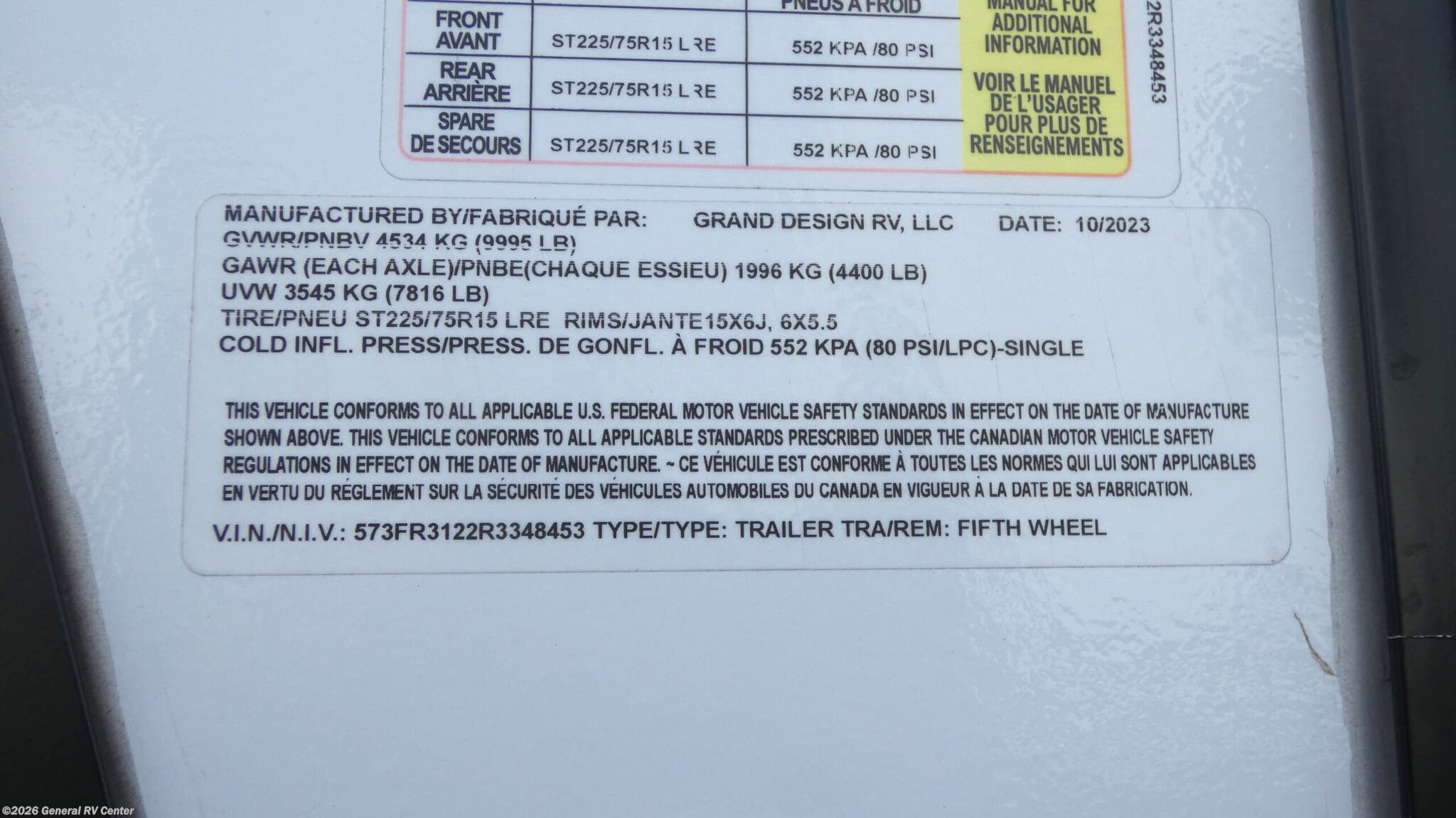 Step into the 2024 Grand Design Reflection 150 Series 260RD, where luxury meets practicality in a beautifully designed fifth wheel. This RV is perfect for couples or small families, offering a spacious and inviting interior that sleeps up to four. At the heart of this model is the center kitchen, featuring a three-burner cooktop and a full-size electric refrigerator, ensuring you have everything you need to whip up your favorite meals on the road. The rear living area boasts 78" theater seating and a U-shaped dinette, perfect for relaxing or entertaining guests. Enjoy movie nights with the entertainment center, complete with a 40" TV, all while basking in the natural light filtering through the large windows. The Reflection 260RD doesn't just stop at comfort; it excels in convenience and functionality. The front bedroom offers a restful retreat with a 60x80 queen bed and ample overhead cabinets for storage. The center bath, equipped with a shower featuring both plastic and glass elements, provides a refreshing space to start or end your day. Outside, the 18-foot powered retractable awning creates a perfect outdoor living area, whether you're sipping morning coffee or enjoying a sunset dinner. With generous tank capacities and a robust cargo capacity, this RV is ready for extended adventures. Visit your nearest General RV dealership to explore this remarkable fifth wheel in person!