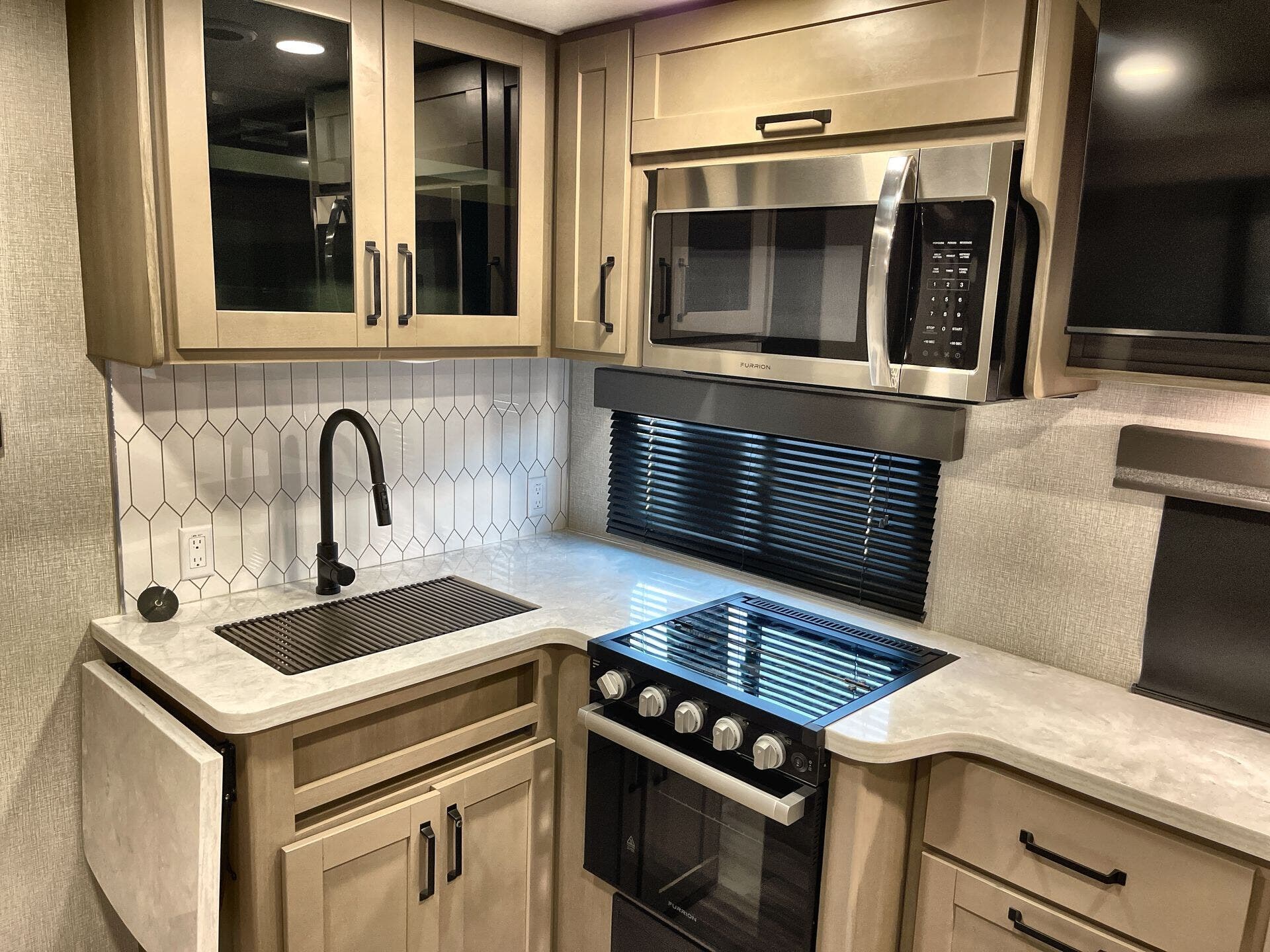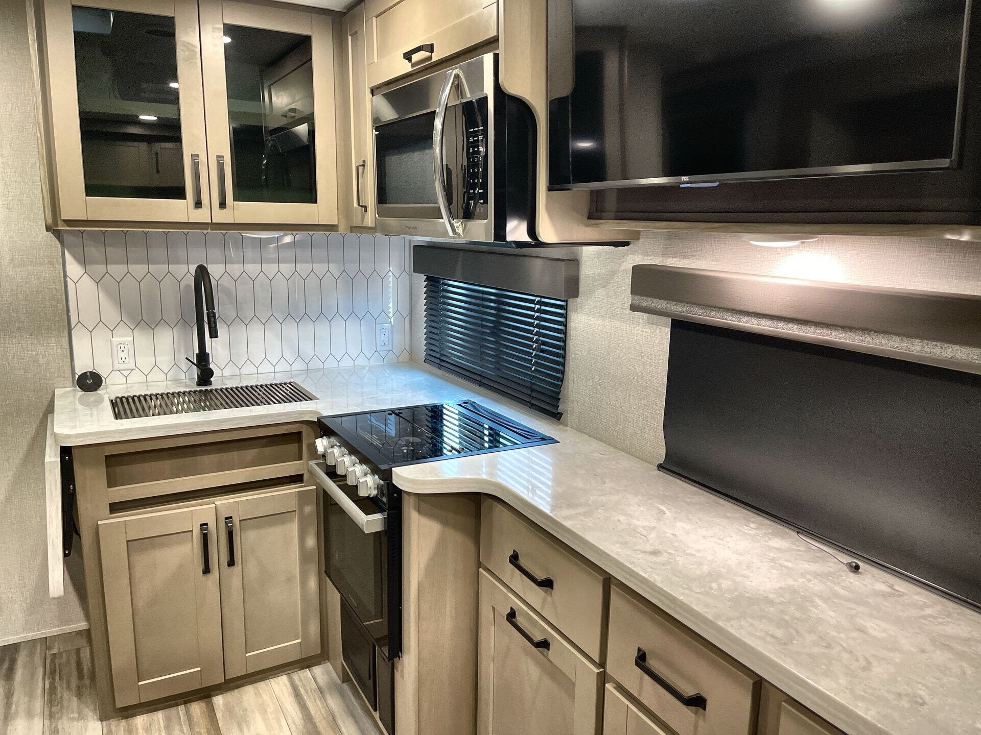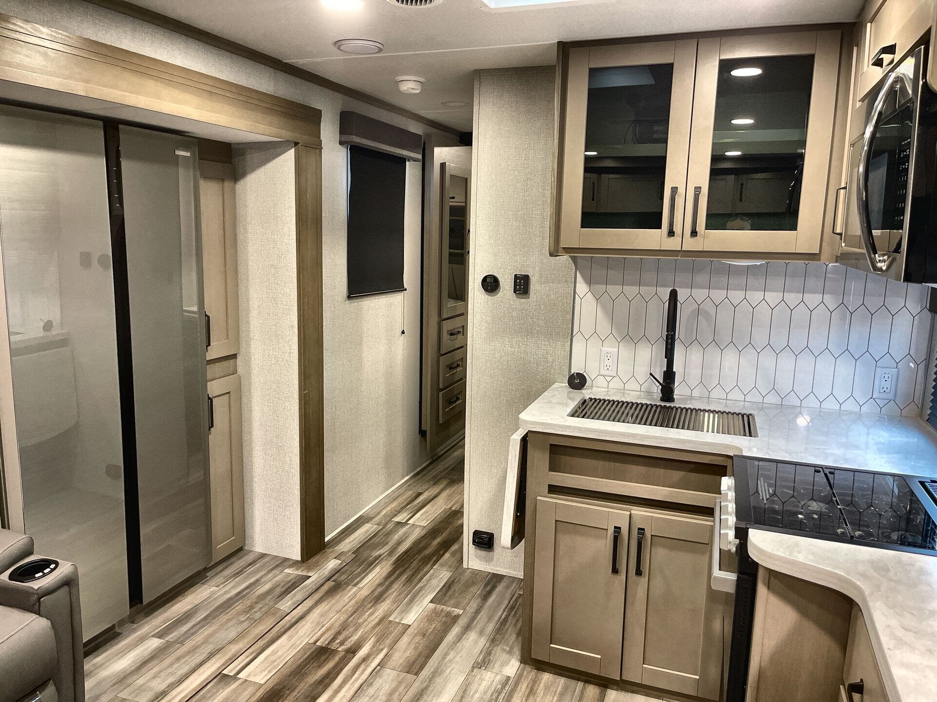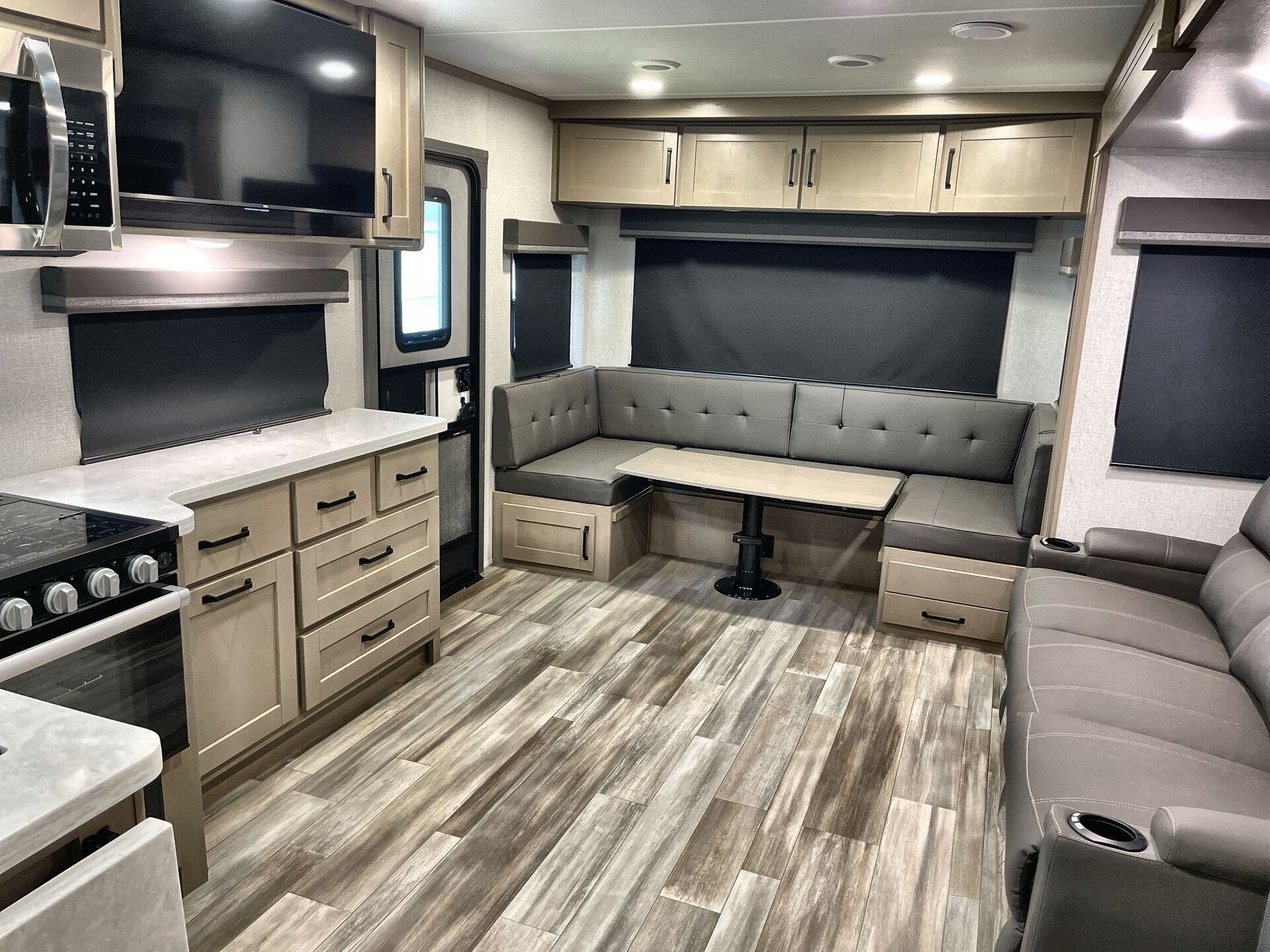 The Reflection offers versatile floorplan types to suit different travel styles, including Front Bedroom, Mid Bath, Mid Kitchen, Rear Entertainment, Rear Living Area, and a U-Shaped Dinette. Whether you prefer a cozy theater-style seating arrangement, a bright kitchen with a full suite of appliances, or a spacious living area for entertaining, this model adapts to your needs. The interior layout emphasizes easy flow between cooking, lounging, and sleeping zones, making it ideal for couples, families, and friends on the road.