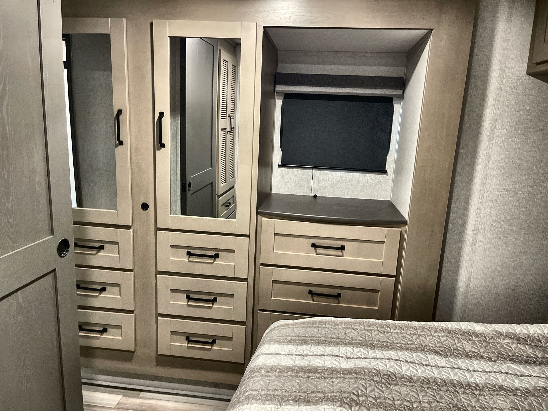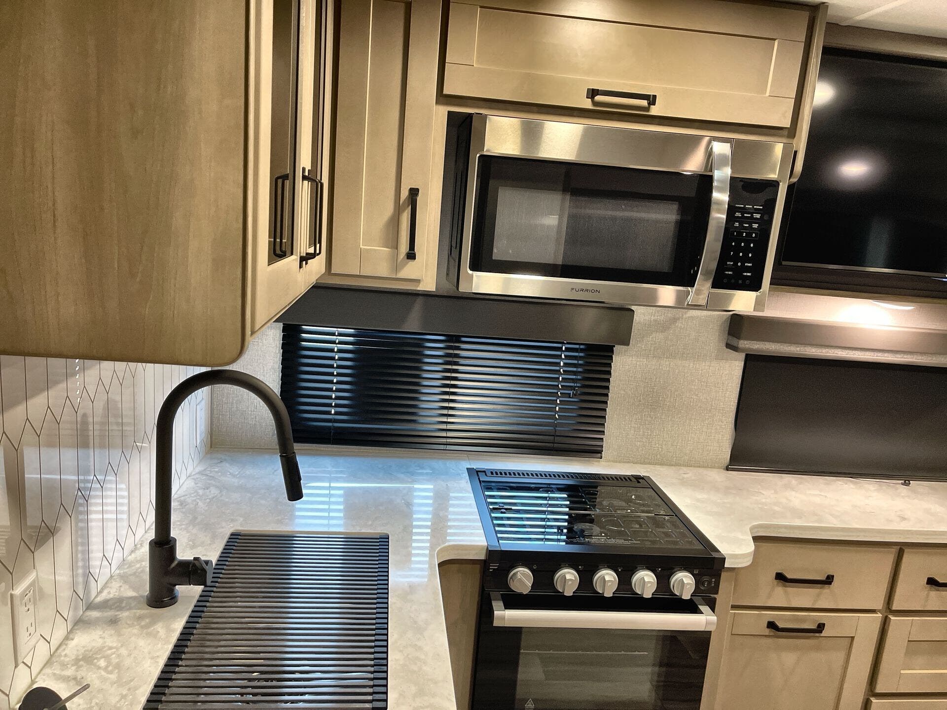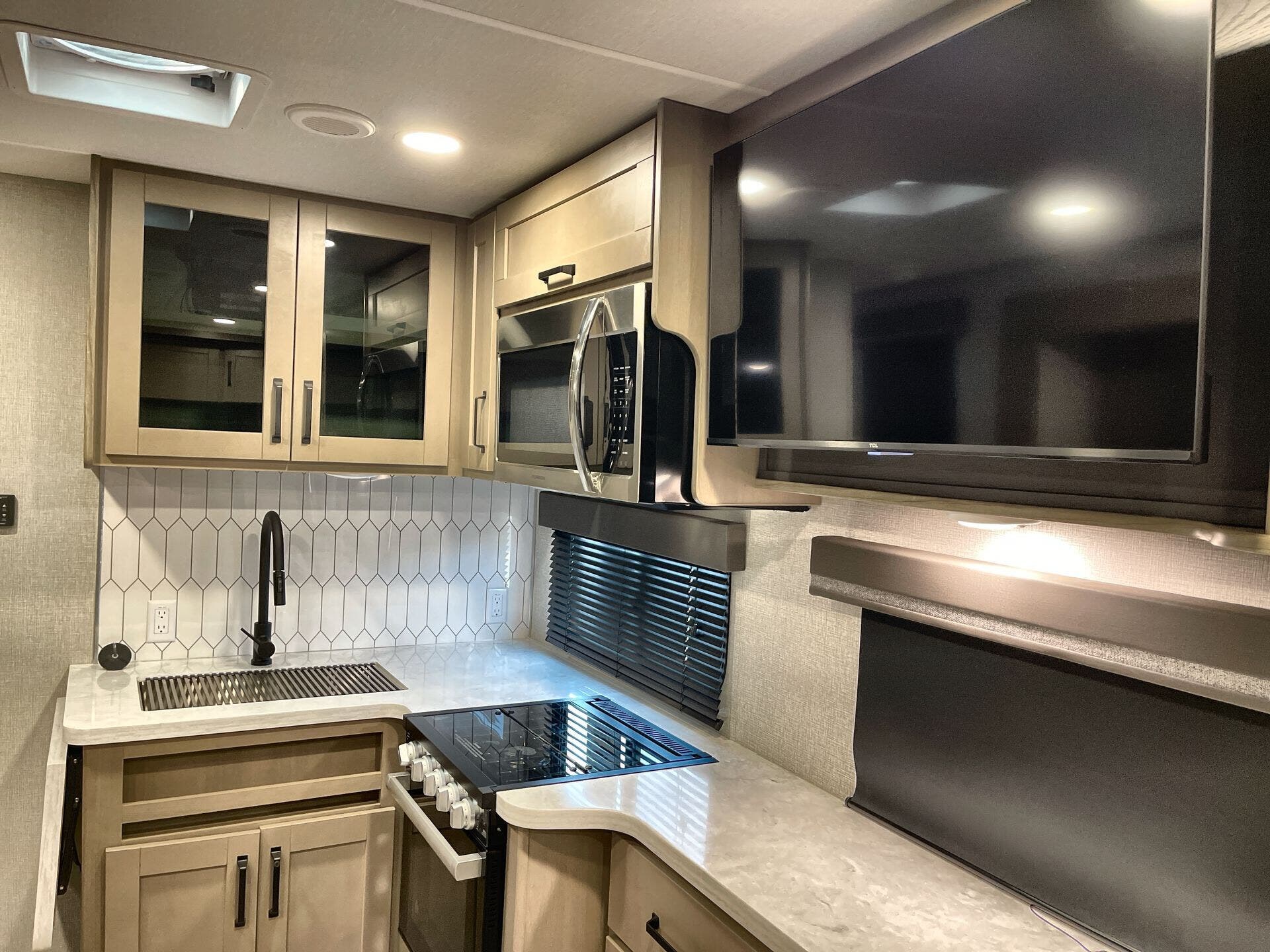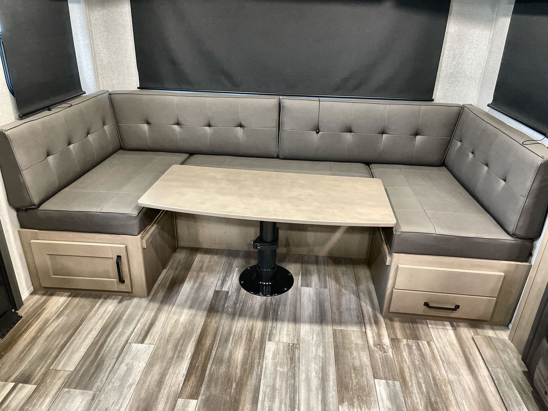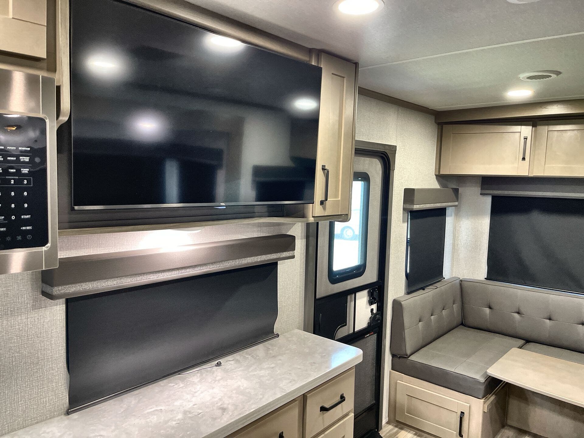 The Reflection offers versatile floorplan types to suit different travel styles, including Front Bedroom, Mid Bath, Mid Kitchen, Rear Entertainment, Rear Living Area, and a U-Shaped Dinette. Whether you prefer a cozy theater-style seating arrangement, a bright kitchen with a full suite of appliances, or a spacious living area for entertaining, this model adapts to your needs. The interior layout emphasizes easy flow between cooking, lounging, and sleeping zones, making it ideal for couples, families, and friends on the road.