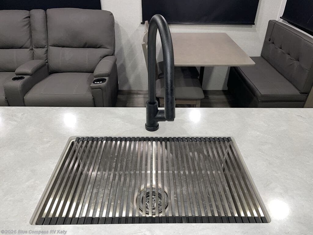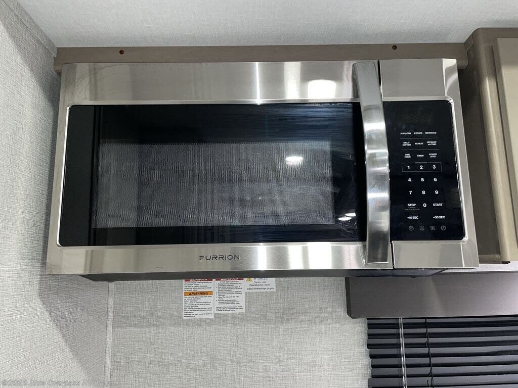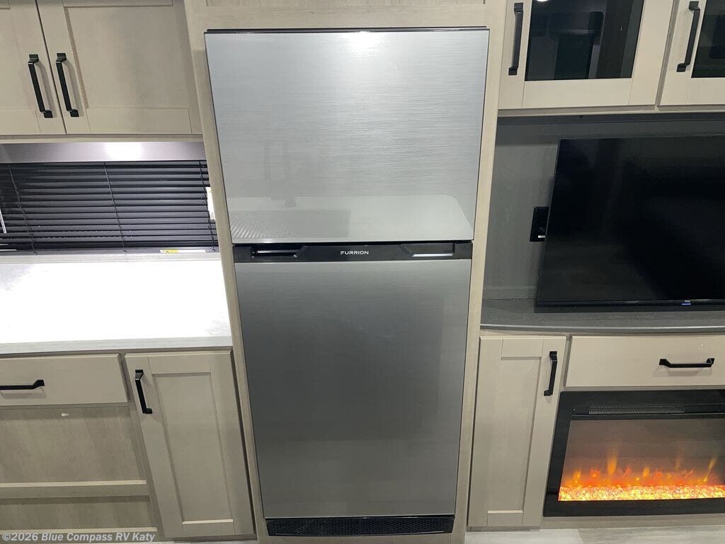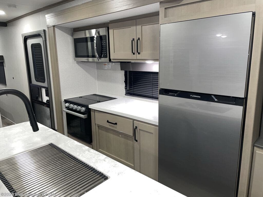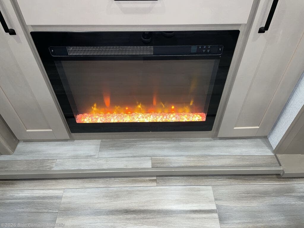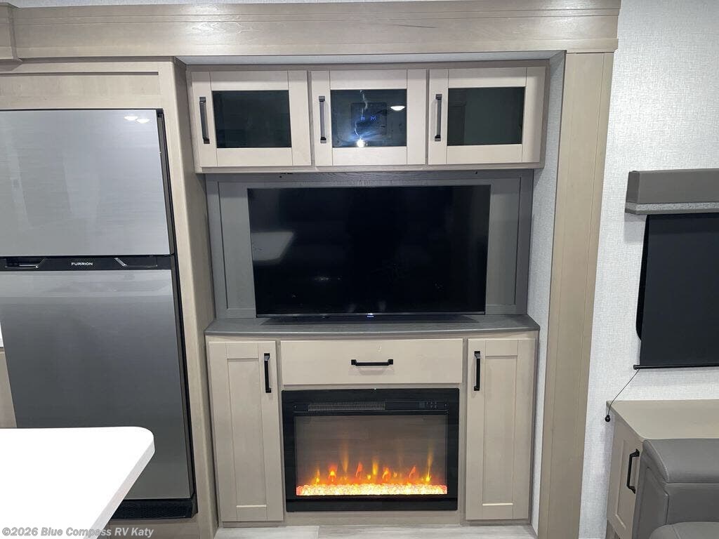 Whether you travel to explore or relax, this trailer will give you the choice depending where you park it! The outside kitchen provides another place to make meals when you want to be in the outdoors, and the inside kitchen amenities offer a gourmet kitchen including a 10 cu. ft. refrigerator, an island, and a hutch. You and your guests will find theater seating with cupholders, a booth dinette or choose a free standing dinette option, and a tri-fold sofa to sit on and visit while you watch the 40" LED HDTV with fireplace below. The full bathroom includes a space saving sliding door and linen storage, and the bedroom gives you a front walk-around queen bed with storage for your clothes on each side, plus there is an additional wardrobe with drawers and the option to add a washer/dryer to the prepped space.