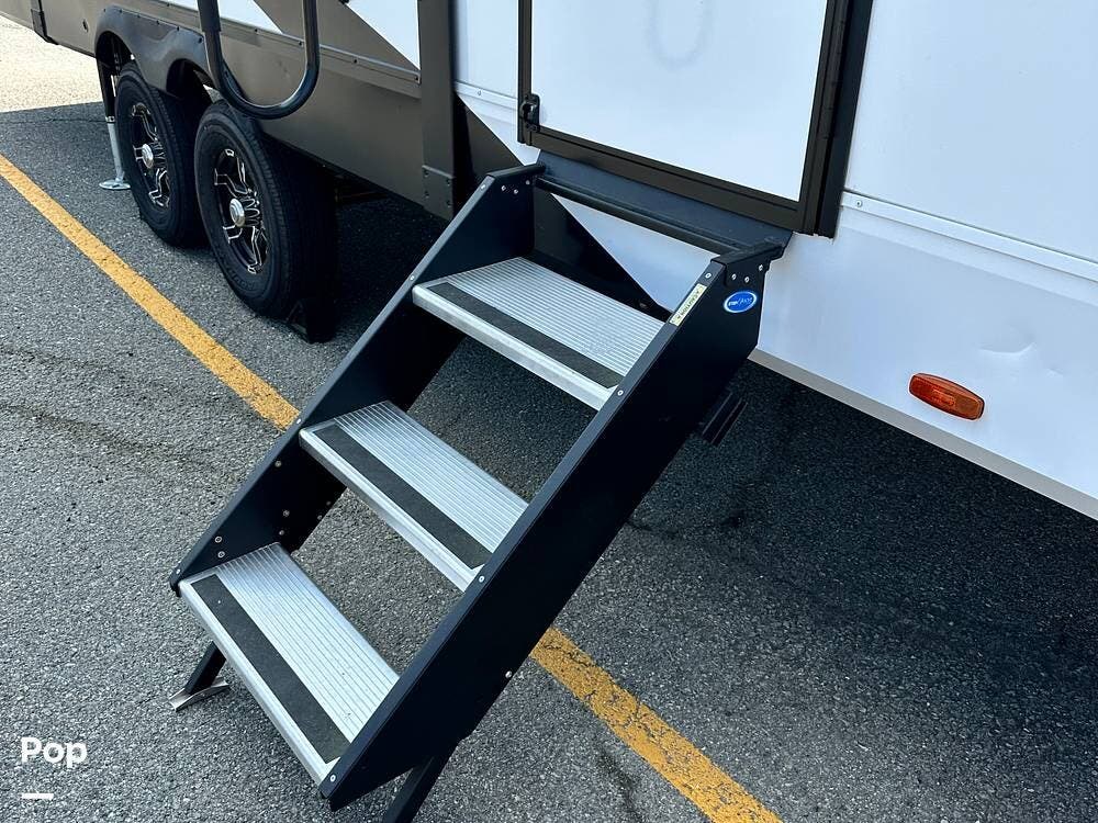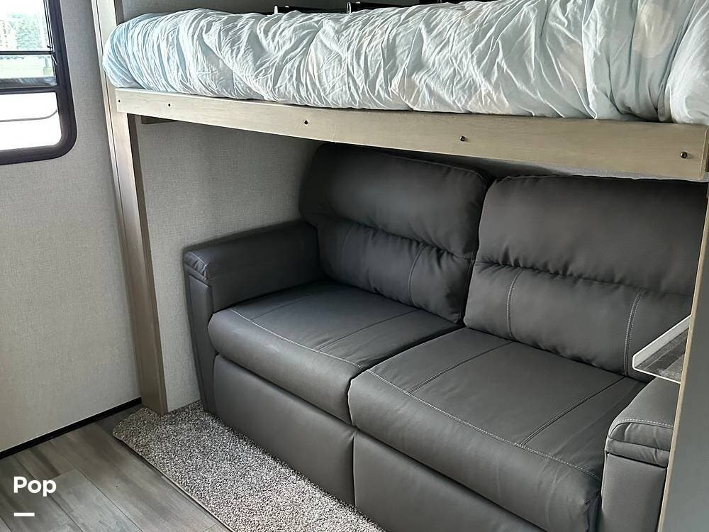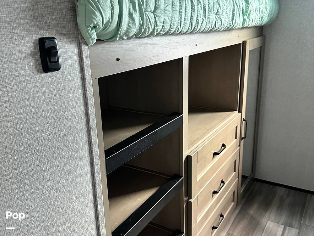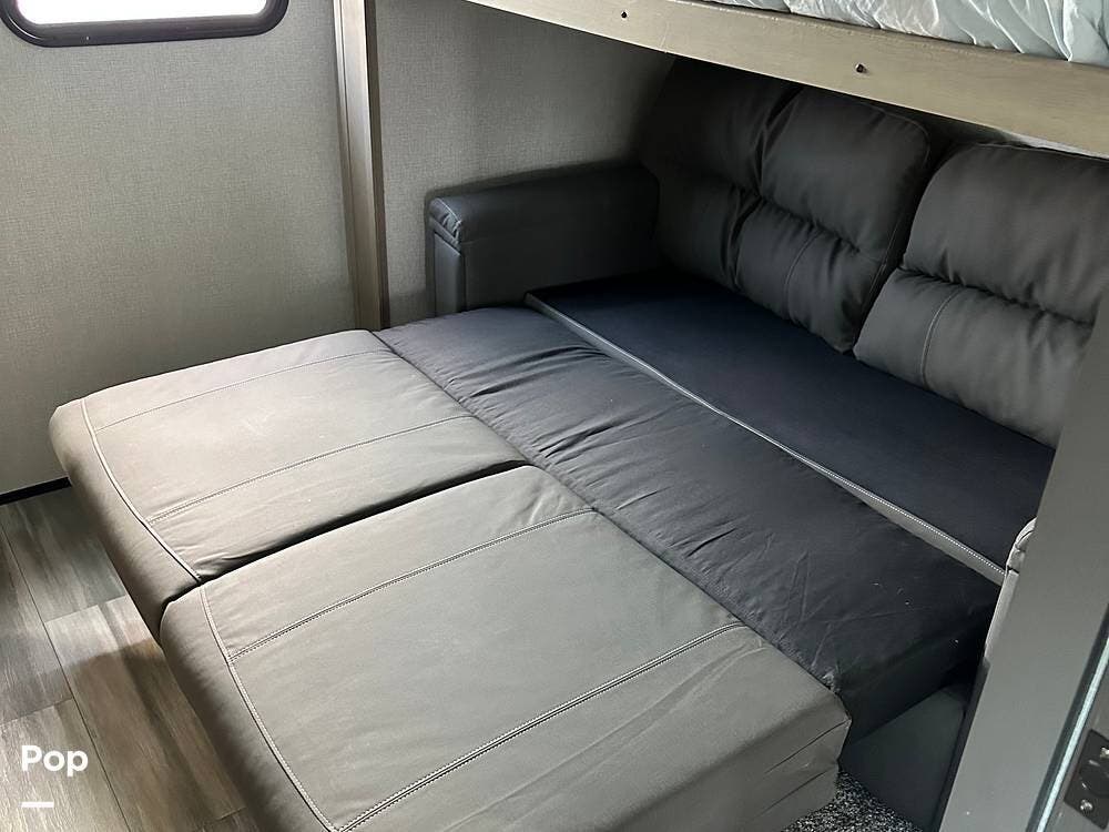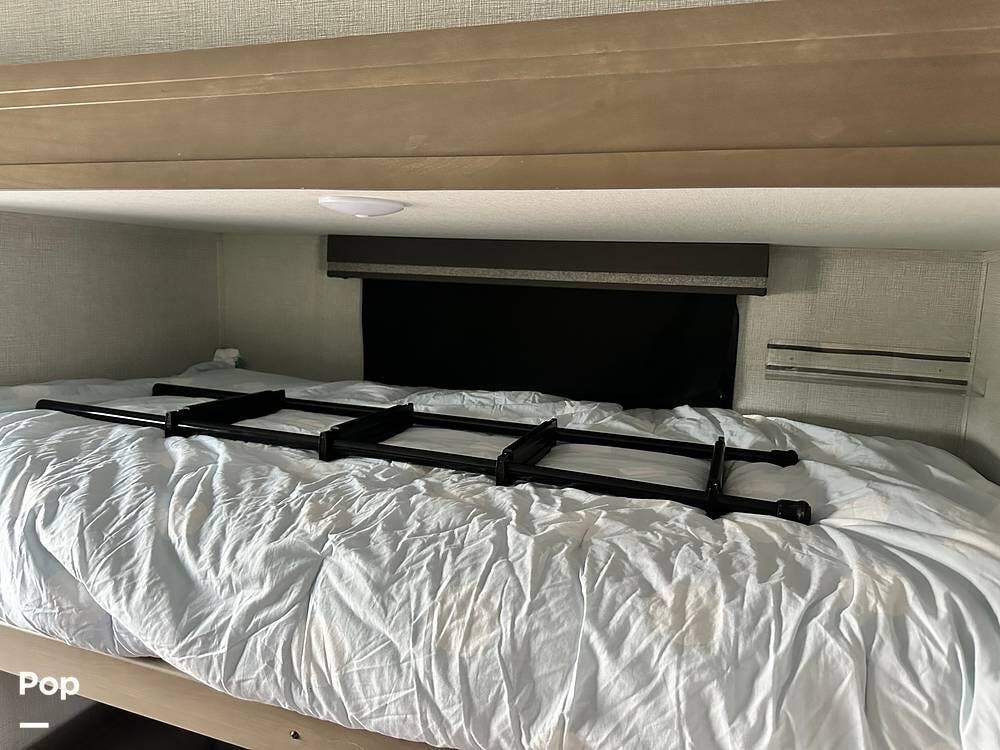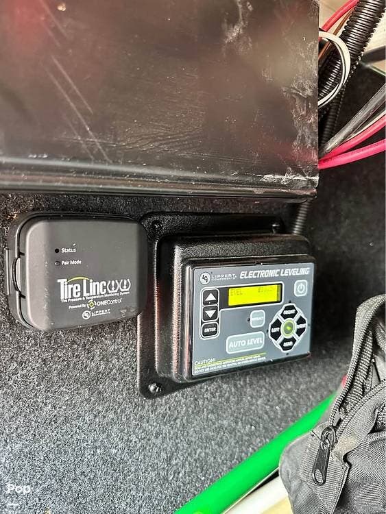 It is a fully equipped bunk house travel trailer that comes with a queen-sized bed and a washer/dryer! The leveling system makes it a breeze to set up.