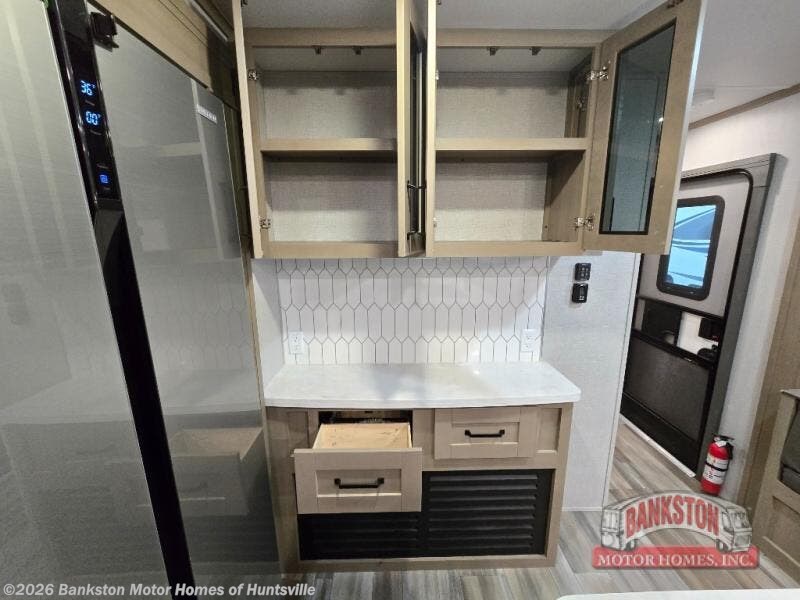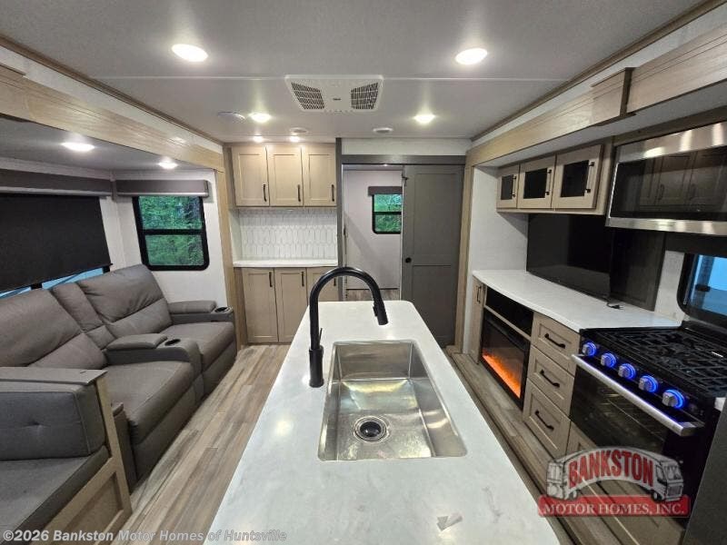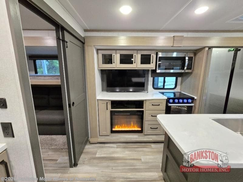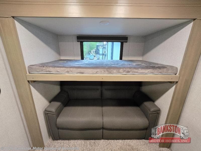 Finding the perfect trailer for a larger group is simple, take a look at this one for your next RV! The rear bunkhouse might be the first reason you fall in love because of the slide out with a flip bunk above a tri-fold sofa, the second bunk bed on the opposite side and storage below, and the large rear window for great views. The outside kitchen might be another reason allowing you to enjoy the outdoors while providing meals for everyone, and/or the inside gourmet kitchen with a 16 cu. ft. refrigerator, an island, and two hutches. Everyone can gather together and relax on the theater seating with cupholders and the booth dinette or choose a free standing dinette option, and to visit or watch the 40" LED HDTV with fireplace below. The full bathroom includes a space savings sliding door and linen storage, and the bedroom gives you a front walk-around queen bed with storage for your clothes on each side, plus there is an additional wardrobe with drawers and the option to add a washer/dryer to the prepped space.