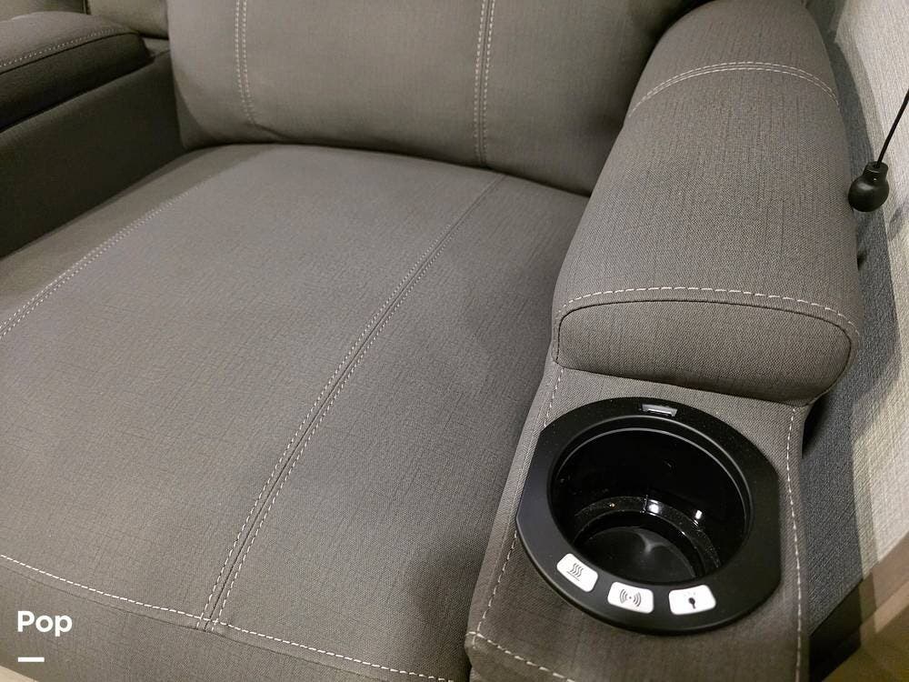 Inside, the rear living area is perfect for hanging out, with a tri-fold sofa and theater-style seats. The kitchen is centered around an oversized island, with a 16 cu ft fridge, a three-burner stove, an oven, and plenty of counter space for cooking. There's a hutch with extra cabinets, so you won't have any trouble storing all your kitchen stuff.