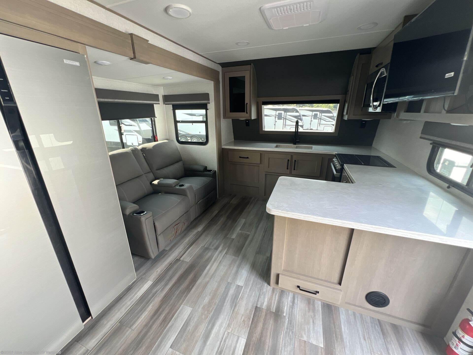 The 2025 Grand Design Reflection 322FKTS is a luxury fifth wheel designed with comfort and functionality in mind. It features a front kitchen layout, providing a spacious and well-equipped area for cooking, with plenty of counter space and storage. The living area includes a cozy setup with seating options and a large entertainment center, making it ideal for relaxing or entertaining guests. The master suite offers a comfortable sleeping area with ample storage, and the bathroom is designed with high-quality fixtures and a spacious shower.