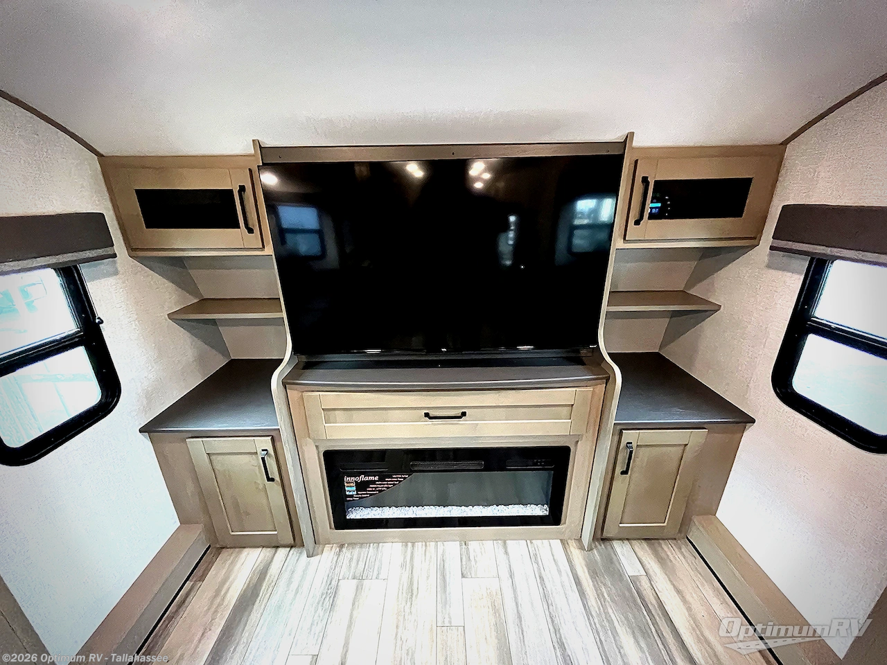 You and your spouse will love having this fifth wheel on your next camping adventure! Get a good night's rest each night on the queen bed slide in the rear private bedroom with TV prep across from the bed, and freshen up each morning in the full bathroom with the 30" x 48" fiberglass shower. You can enjoy home cooked meals made using the three burner cooktop and 16 cu. ft. refrigerator in the full kitchen, and eat them at the slide out free standing dinette table featuring two chairs and an ottoman with storage. You even have a hutch to store your dishes in, and a TV prep area so you can add a TV to watch a show while you cook. The front living area offers a comfortable place to wind down your nights by relaxing in front of the fireplace on either one of the opposing tri-fold sofa slides or the theater seating!
