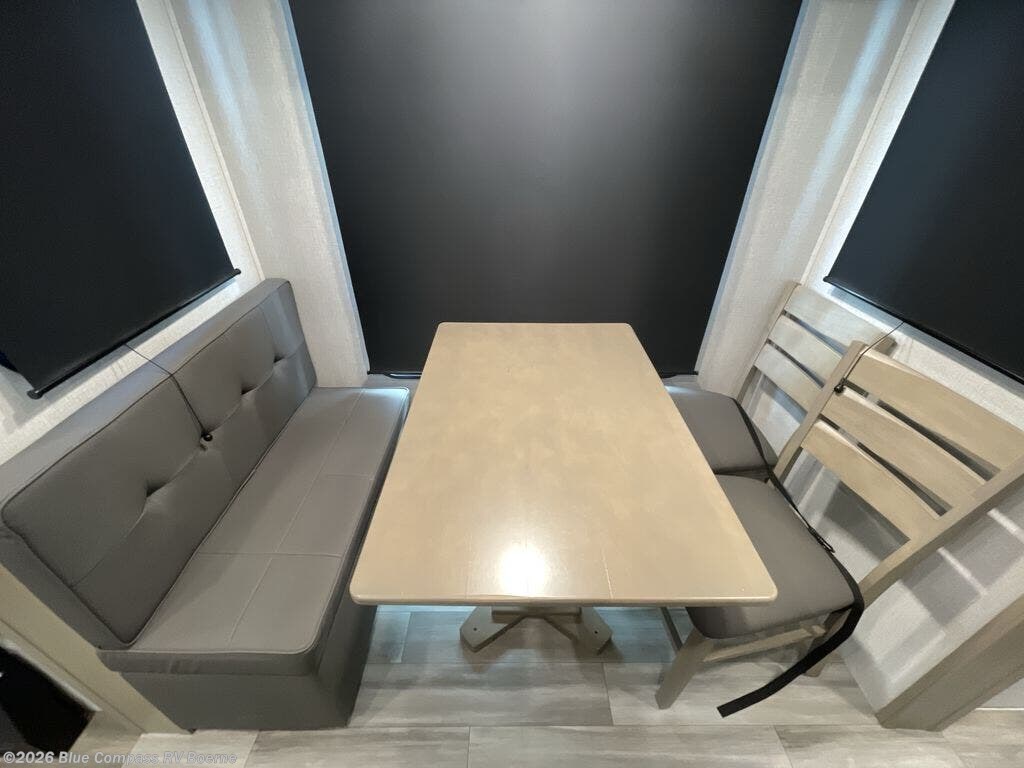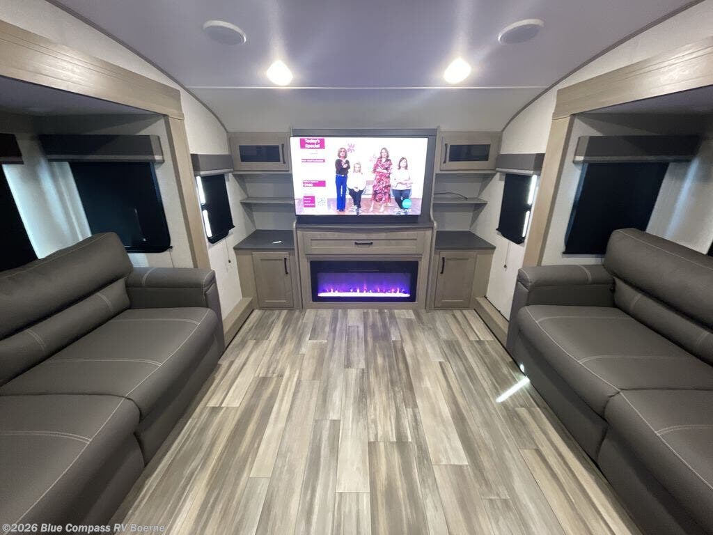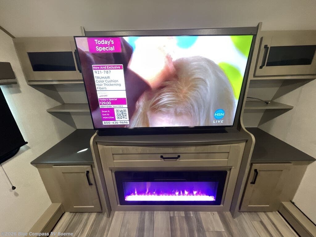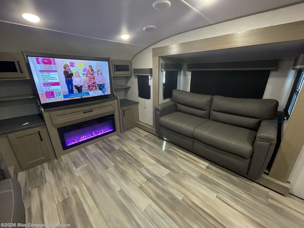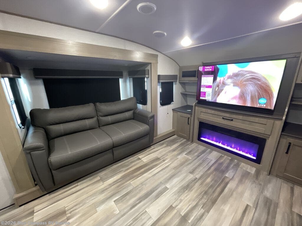 You and your spouse will love having this fifth wheel on your next camping adventure! Get a good night's rest each night on the queen bed slide in the rear private bedroom with TV prep across from the bed, and freshen up each morning in the full bathroom with the 30" x 48" fiberglass shower. You can enjoy home cooked meals made using the three burner cooktop and 16 cu. ft. refrigerator in the full kitchen, and eat them at the slide out free standing dinette table featuring two chairs and an ottoman with storage. You even have a hutch to store your dishes in, and a TV prep area so you can add a TV to watch a show while you cook. The front living area offers a comfortable place to wind down your nights by relaxing in front of the fireplace on either one of the opposing tri-fold sofa slides or the theater seating!
