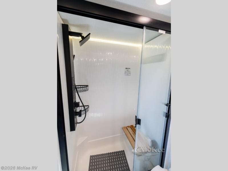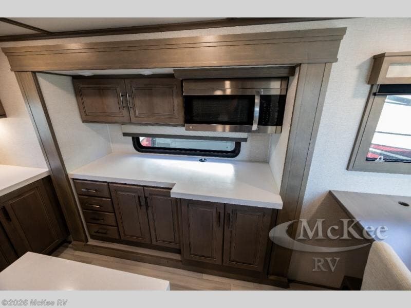 Enjoy each and every vacation, month-long trips, or even extended stays at an RV park in this spacious fifth wheel! The raised rear kitchen gives the cook plenty of room to whip up any type of meal using the stainless steel appliances including a 24" residential oven, an oversized pantry, and the raised bar top will provide you even more counter space on top of dining with two chairs that overlook the middle living area. Relaxing is made easy thanks to two tri-fold sofas and theatre seating while watching the big game on the LED Smart TV and enjoying the fireplace below. Dual sinks in the full bathroom allow two people to easily get ready at once, and the flip up teak seat in the shower is a nice convenience. At night, retire to your own queen bed which slides out to provide more floor space, and enjoy a show on the LED TV above the flip-top dresser once in bed.