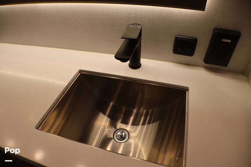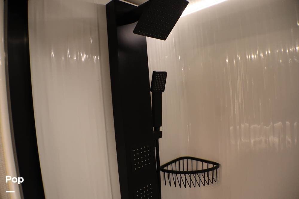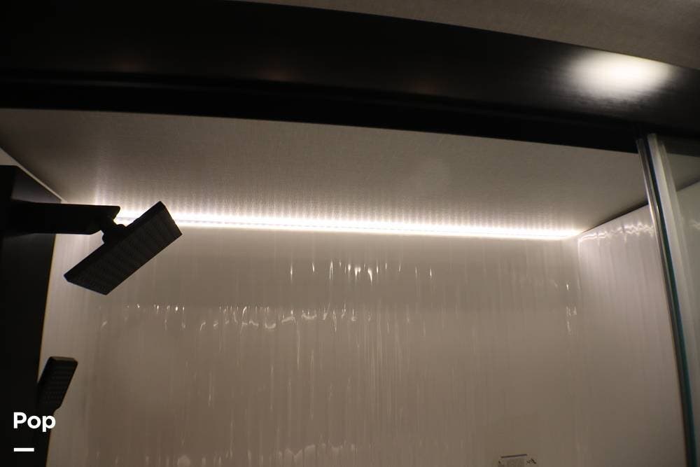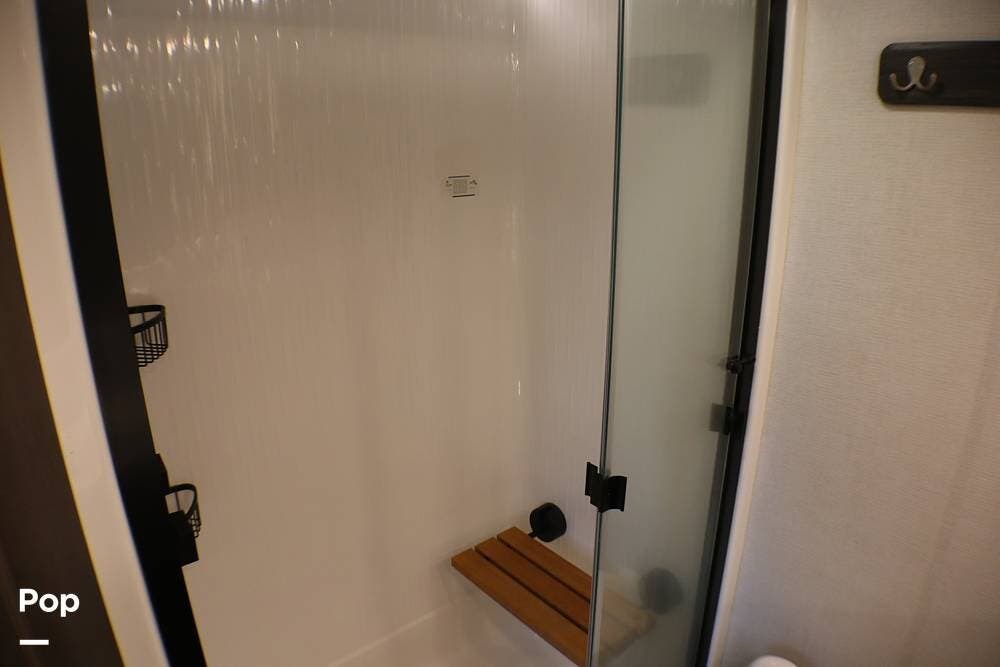 Ahead of the living area is a bath featuring a spacious shower with seat, dual sinks, and plenty of storage.