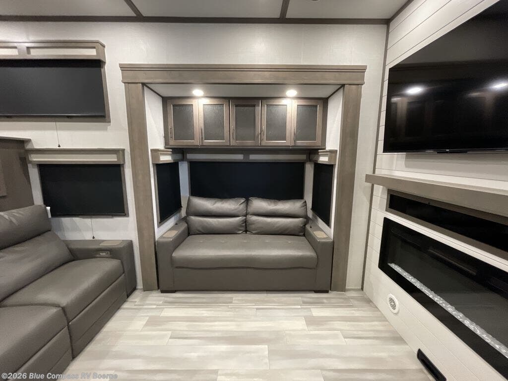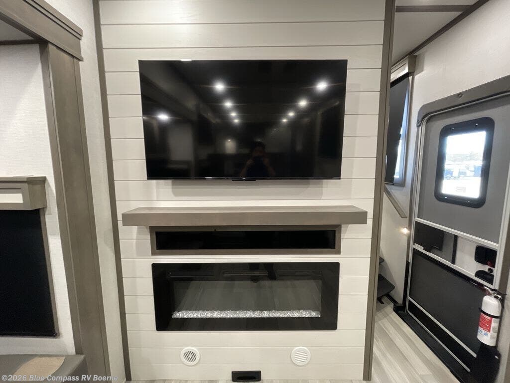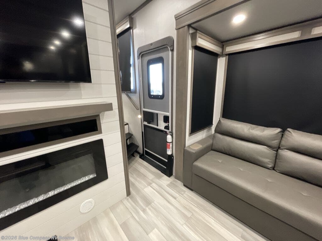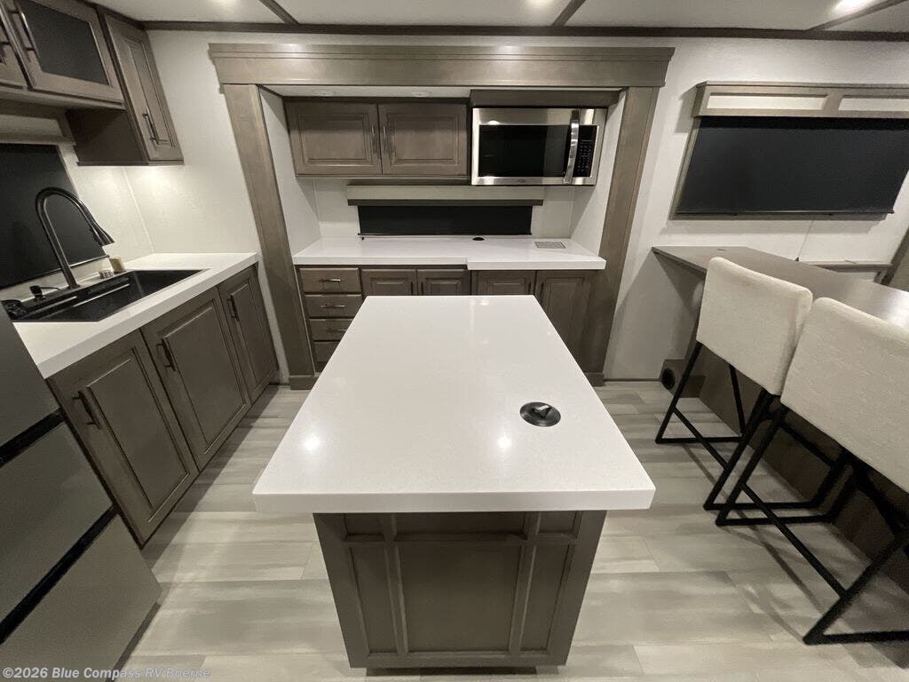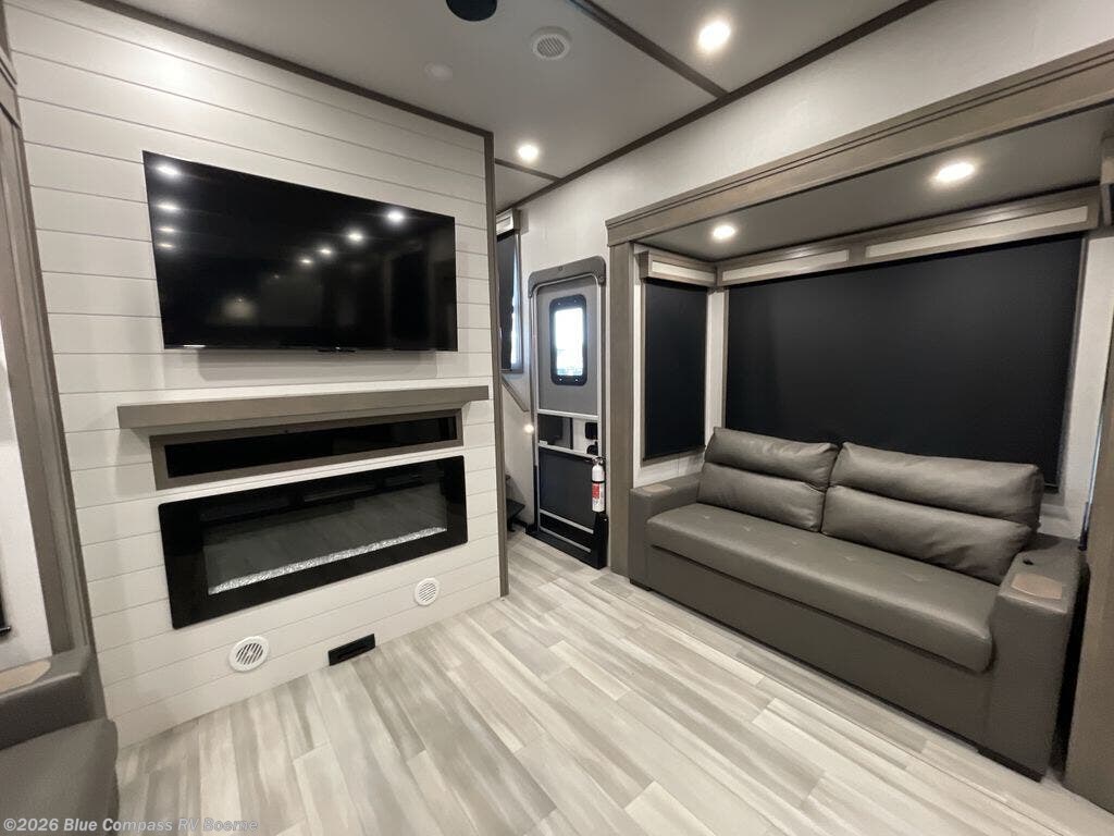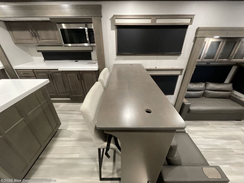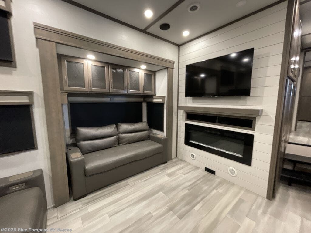 Enjoy each and every vacation, month-long trips, or even extended stays at an RV park in this spacious fifth wheel! The raised rear kitchen gives the cook plenty of room to whip up any type of meal using the stainless steel appliances including a 24" residential oven, an oversized pantry, and the raised bar top will provide you even more counter space on top of dining with two chairs that overlook the middle living area. Relaxing is made easy thanks to two tri-fold sofas and theatre seating while watching the big game on the LED Smart TV and enjoying the fireplace below. Dual sinks in the full bathroom allow two people to easily get ready at once, and the flip up teak seat in the shower is a nice convenience. At night, retire to your own queen bed which slides out to provide more floor space, and enjoy a show on the LED TV above the flip-top dresser once in bed.