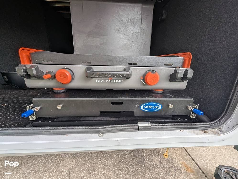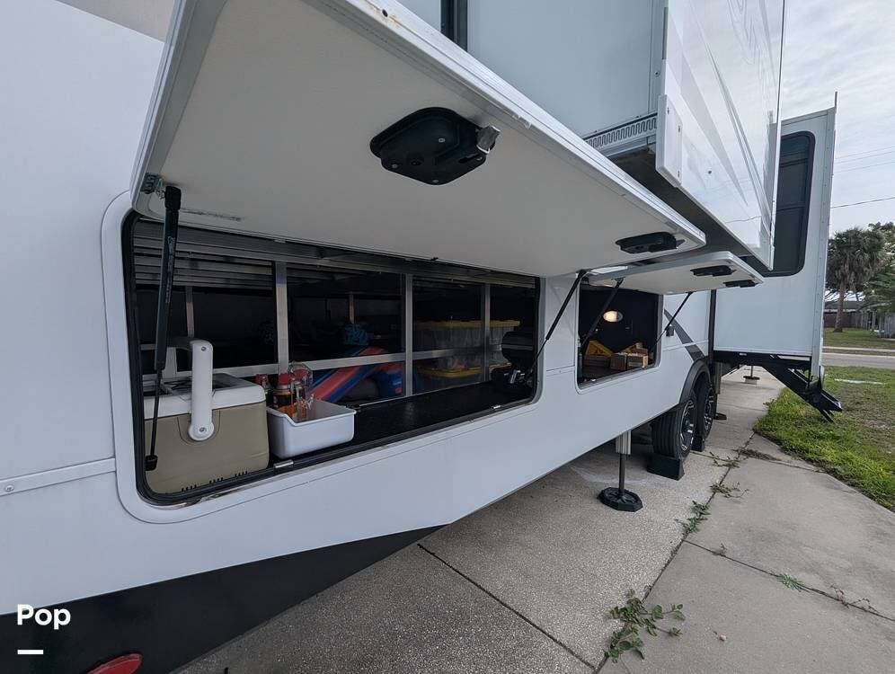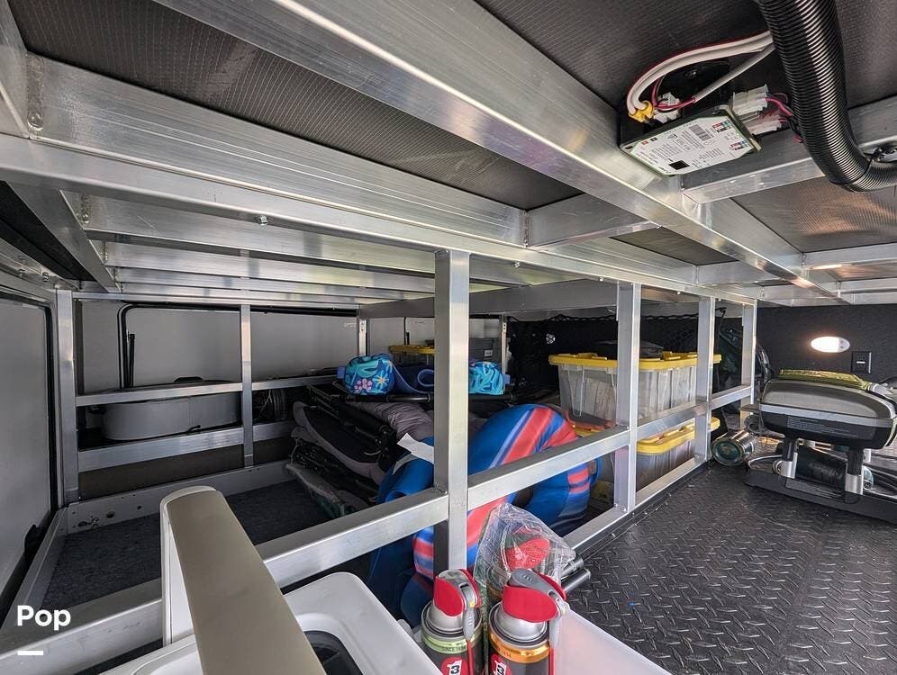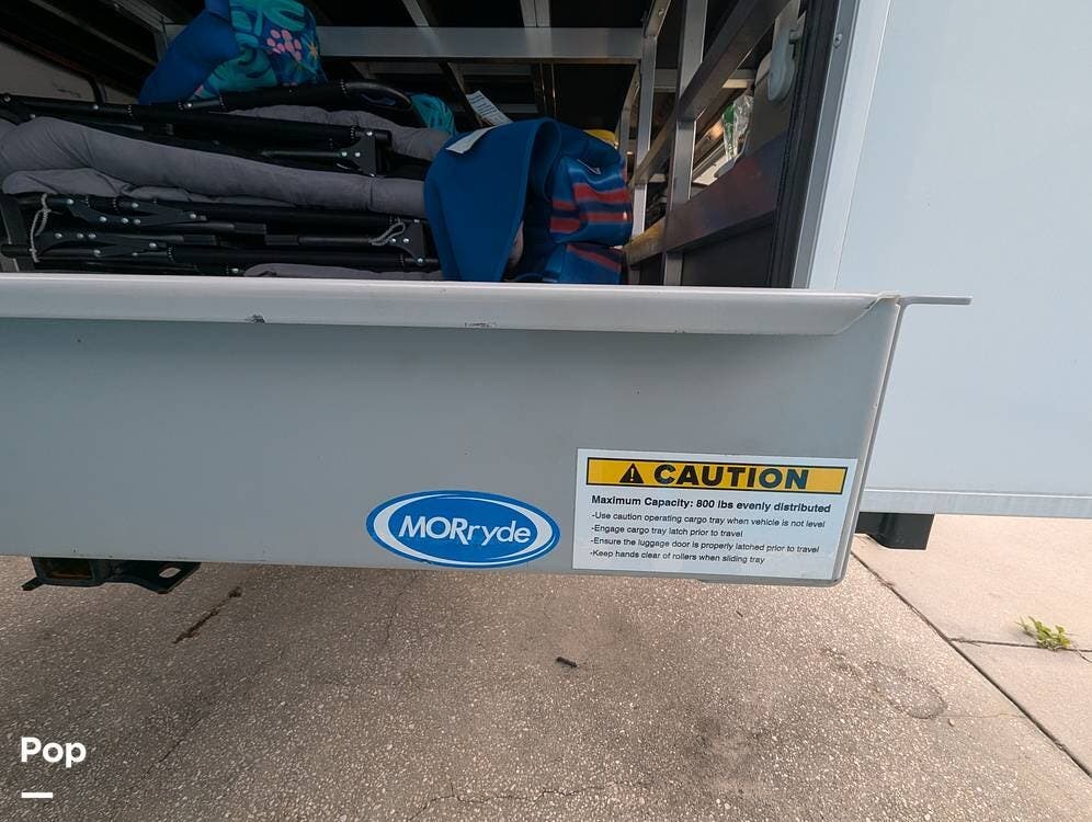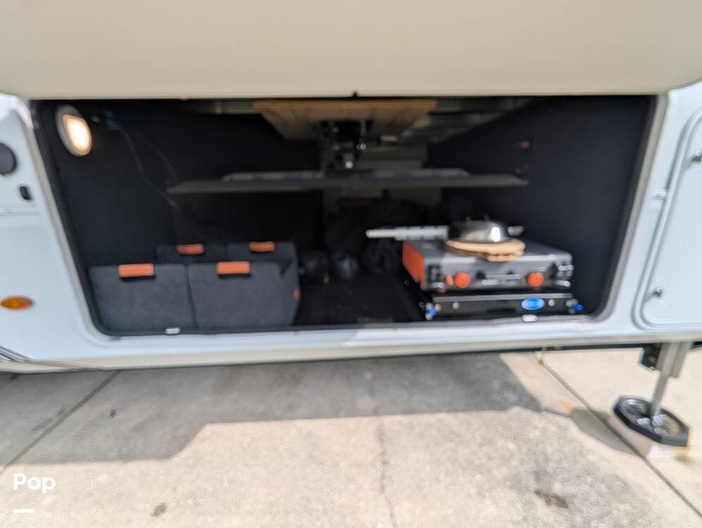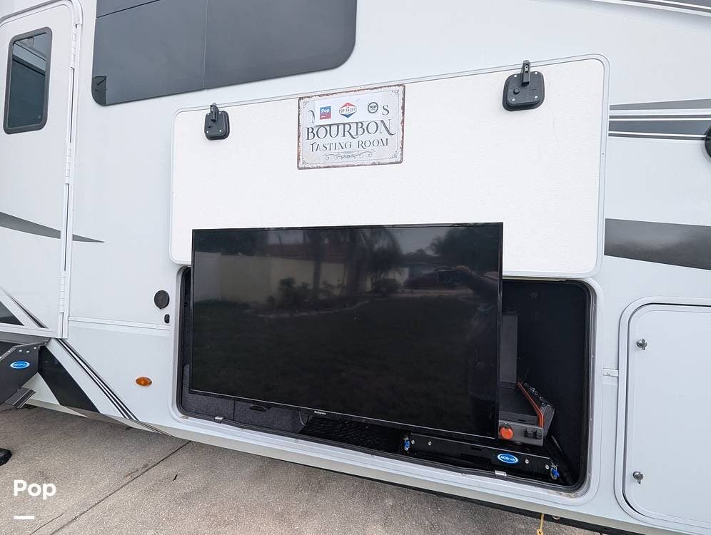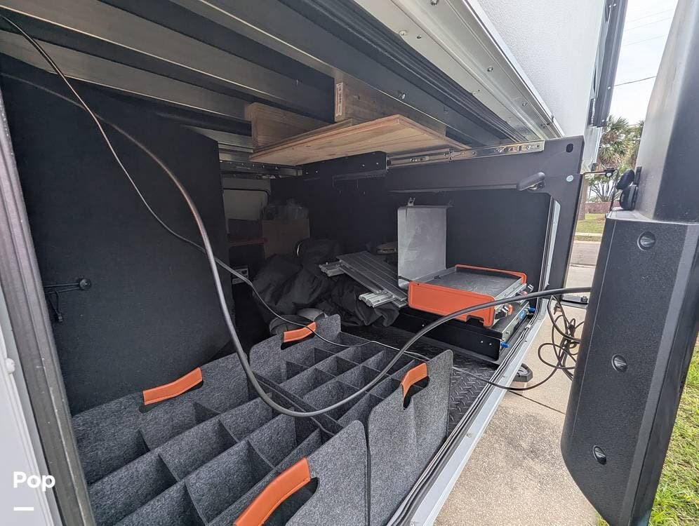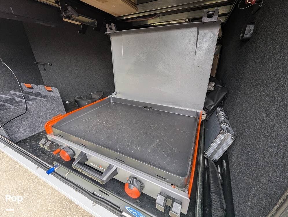 The exterior of the RV is just as impressive. There is a massive storage area with all-pass-through compartments and a rear slide-out tray. The front storage area houses a custom flip-down TV and a pull-out Blackstone griddle.