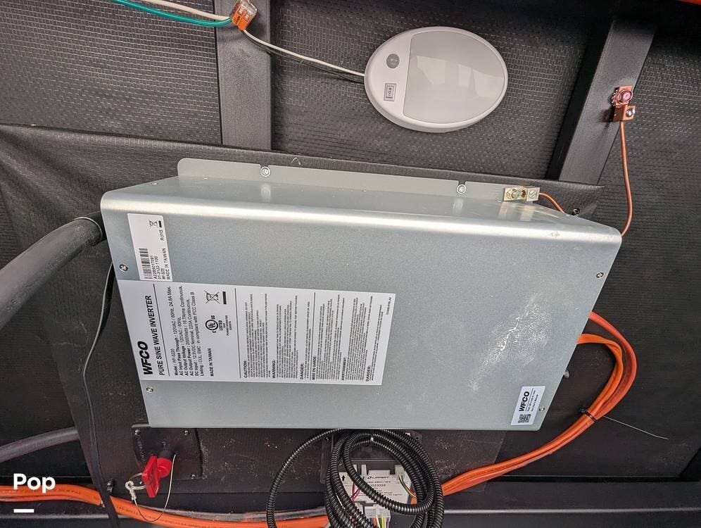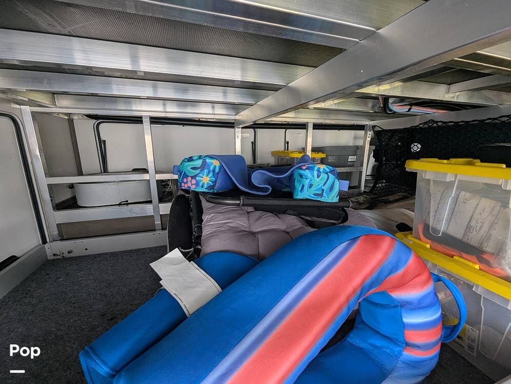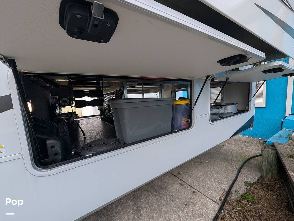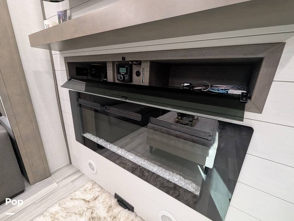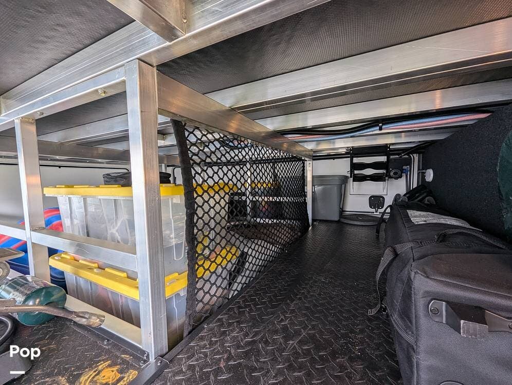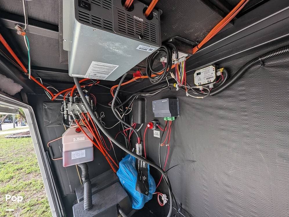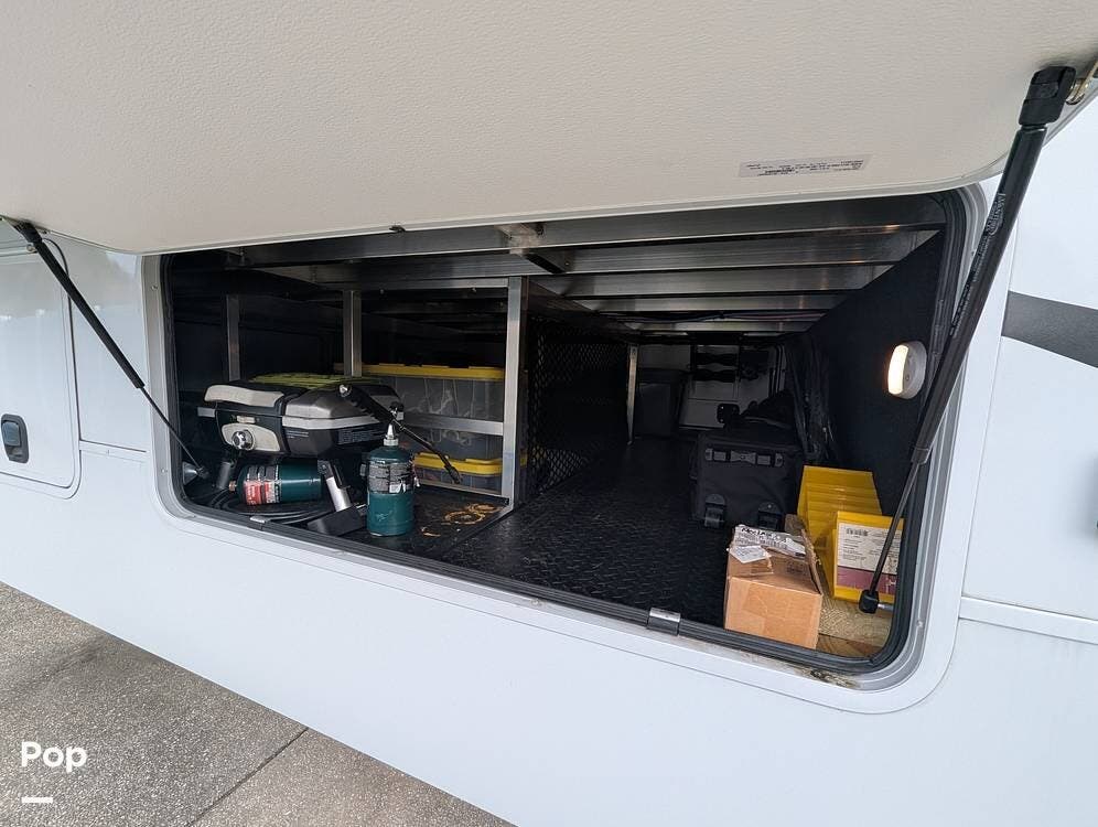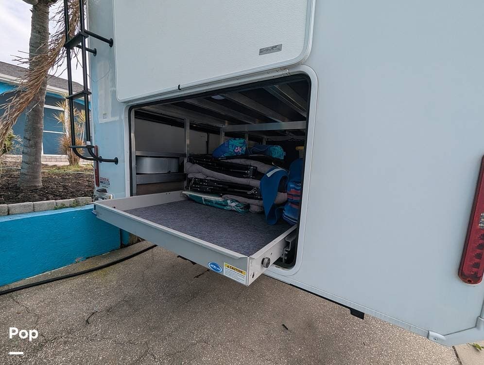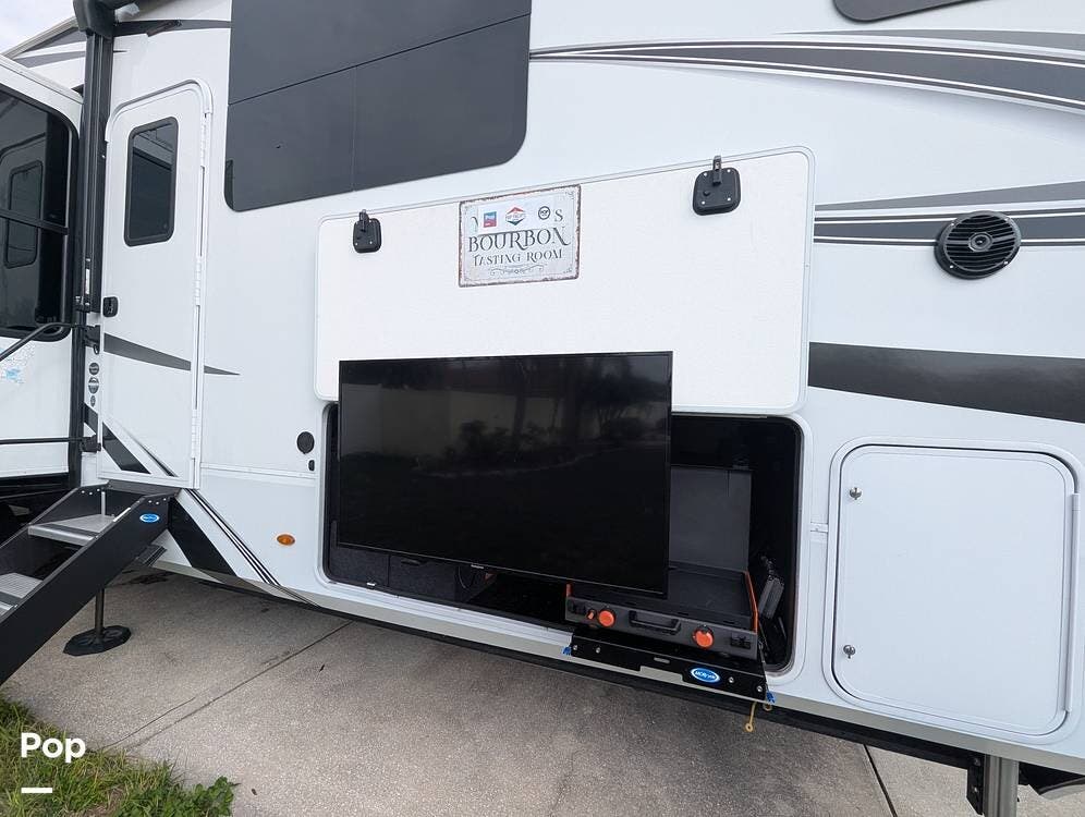 The exterior of the RV is just as impressive. There is a massive storage area with all-pass-through compartments and a rear slide-out tray. The front storage area houses a custom flip-down TV and a pull-out Blackstone griddle.