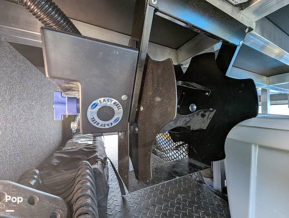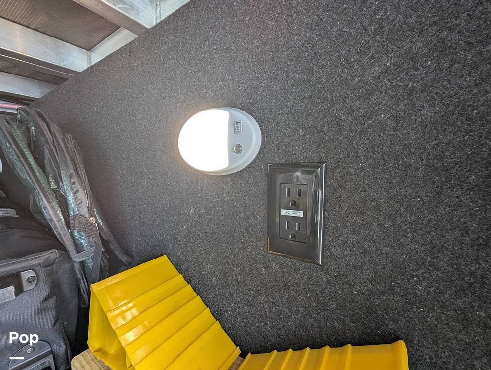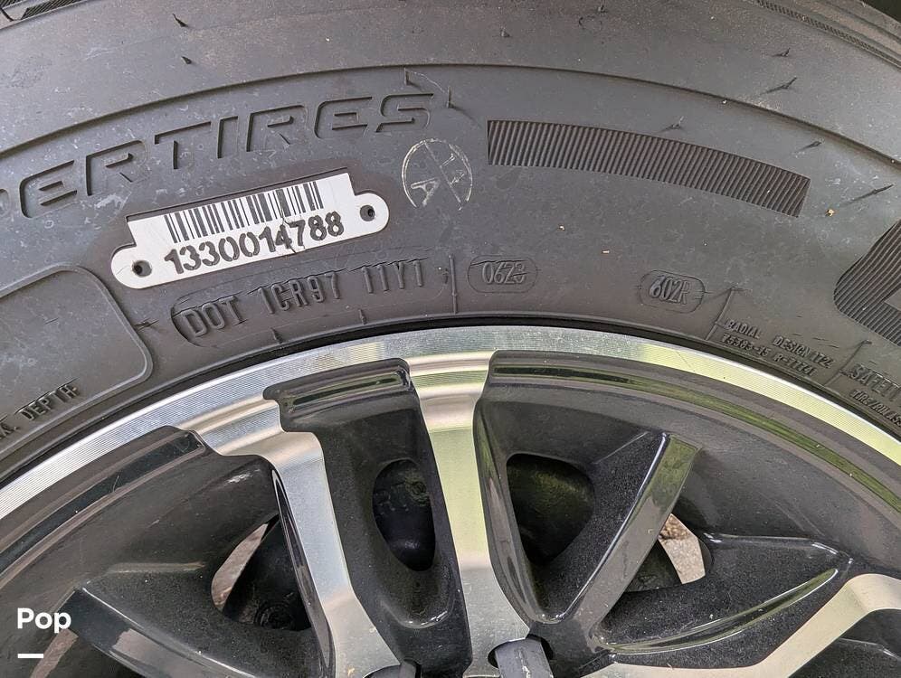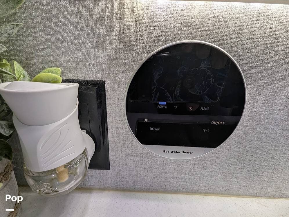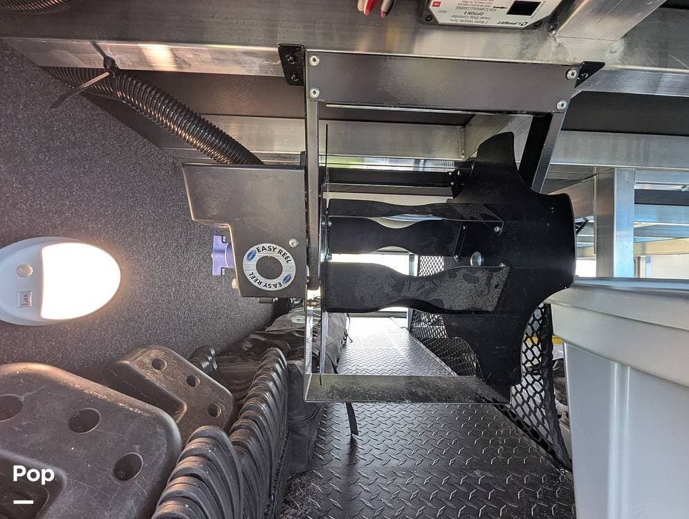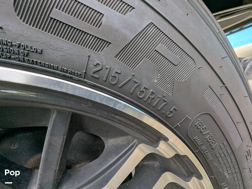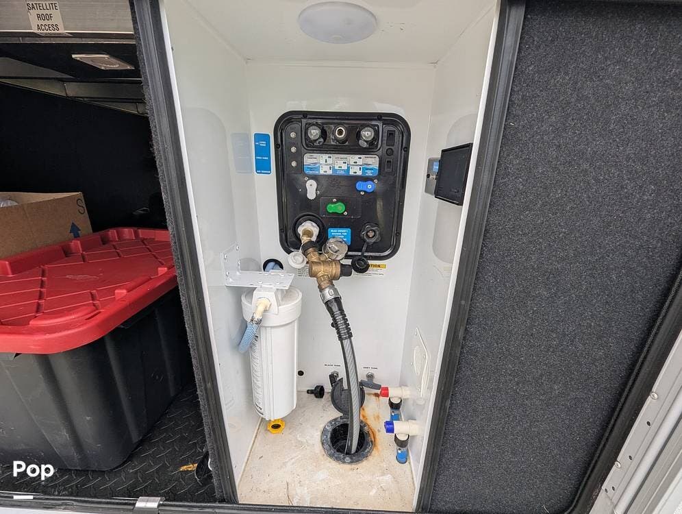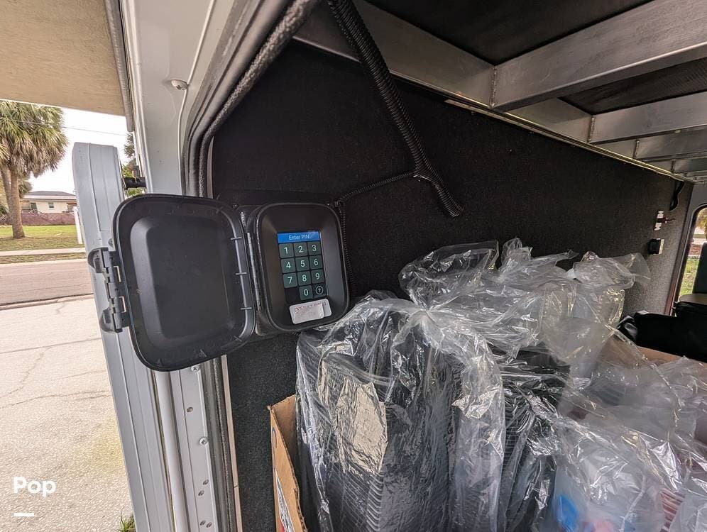 The exterior of the RV is just as impressive. There is a massive storage area with all-pass-through compartments and a rear slide-out tray. The front storage area houses a custom flip-down TV and a pull-out Blackstone griddle.