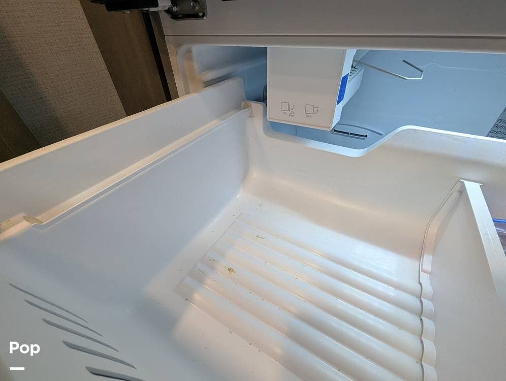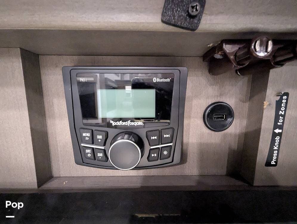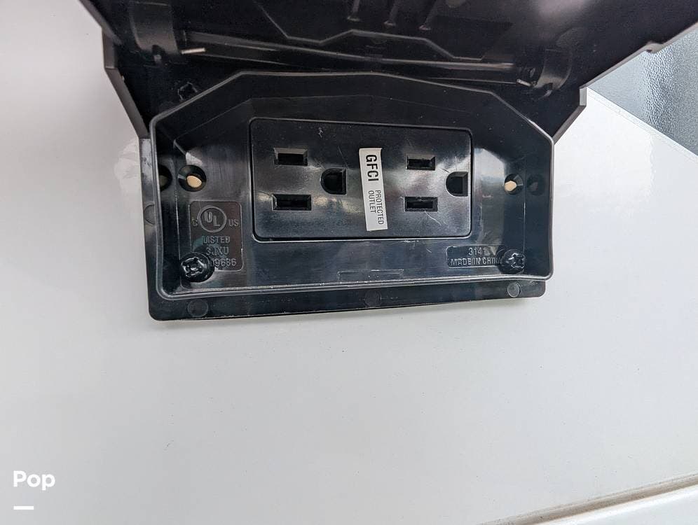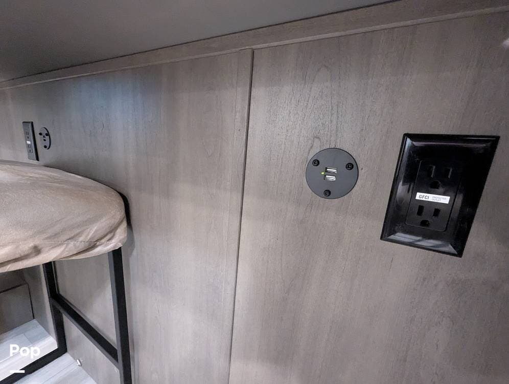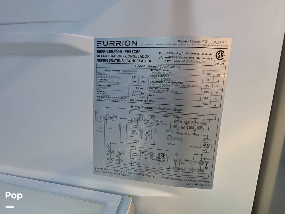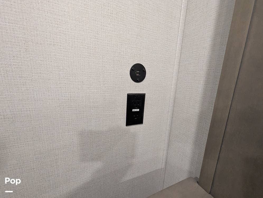 The rear galley is raised and has all residential appliances. The four-door refrigerator has an ice maker in the freezer, and the cabinetry is soft-close and solid wood. There is a breakfast nook that can be used as a desk if working remotely. There are USB ports and electrical outlets underneath, with openings for all your wiring to keep everything neat.