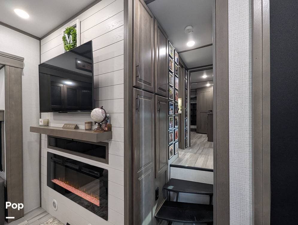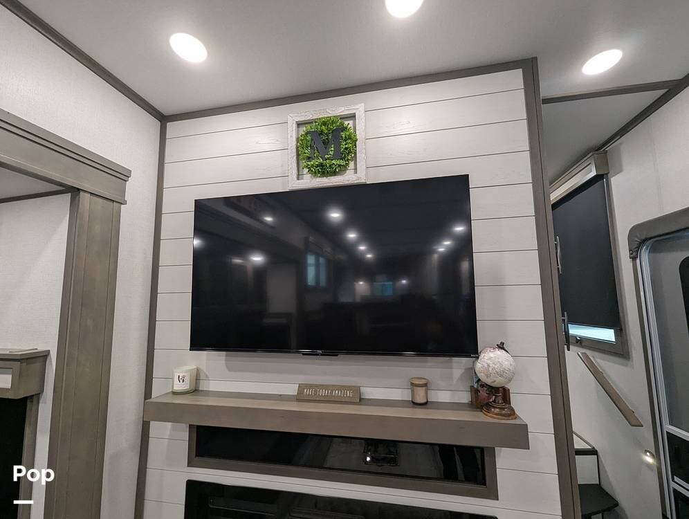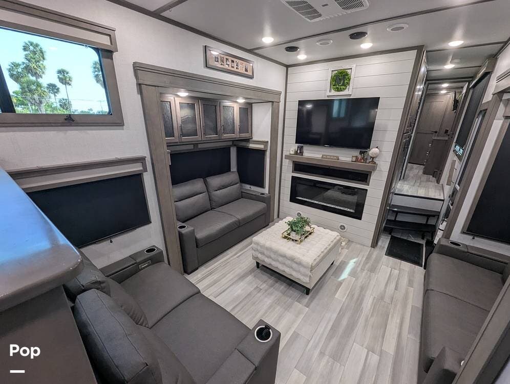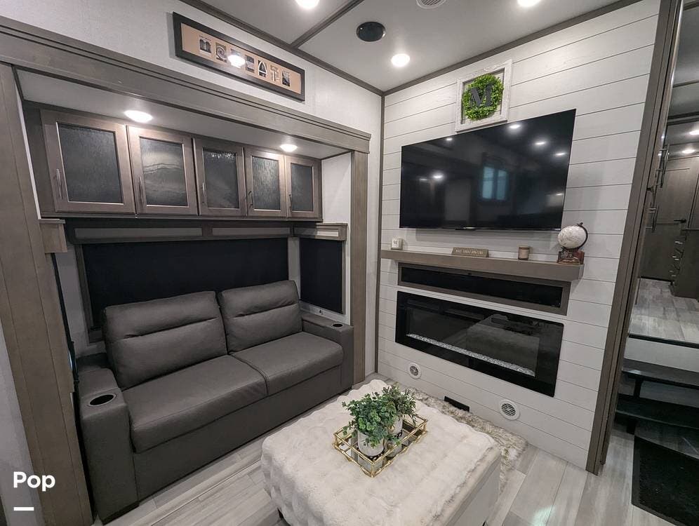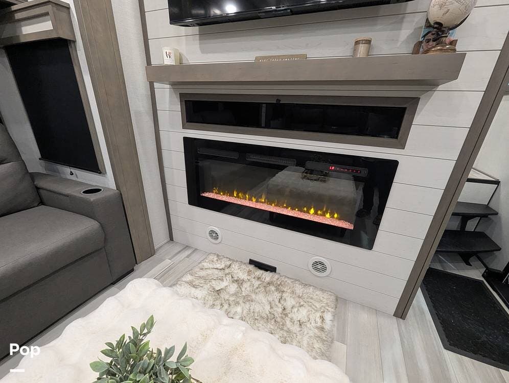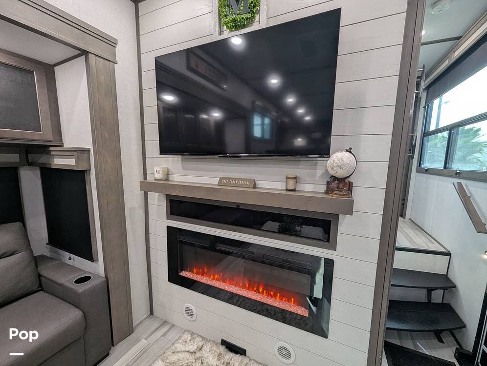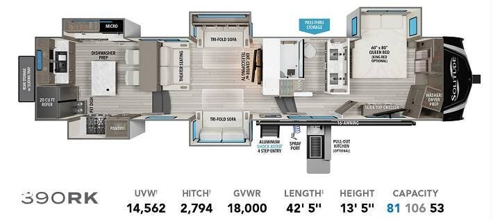 This beautiful 390RK Solitude has an excellent layout. The living area is comfortable with opposing slides. The dual recliners have USB ports. The two sofas both lay out into beds when extra sleeping space is needed. The TV has a cozy fireplace with a Rockford Fosgate stereo.