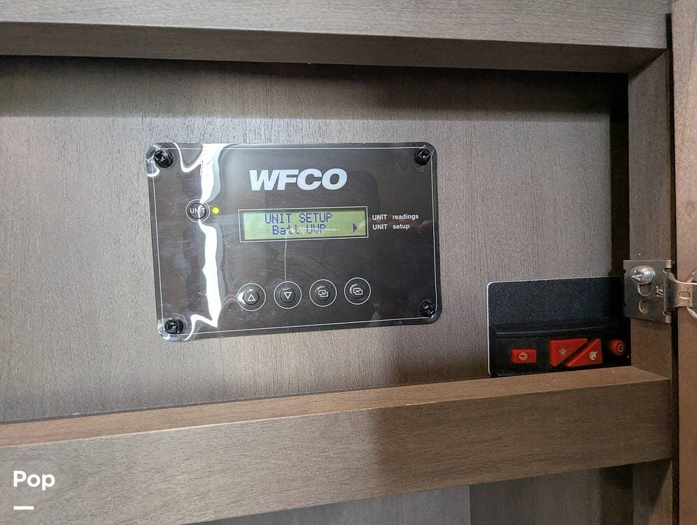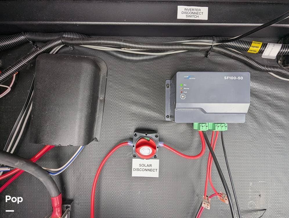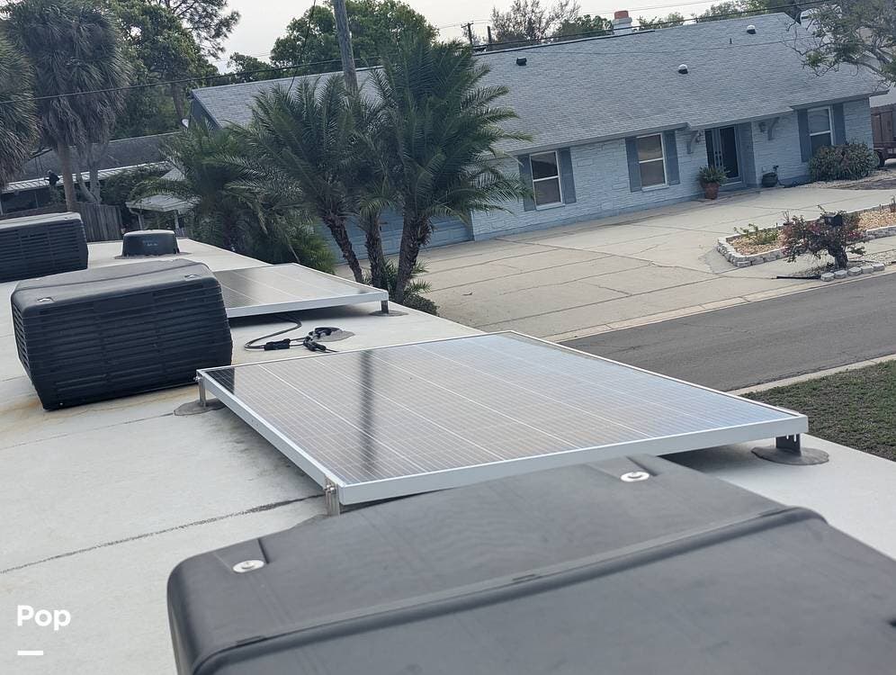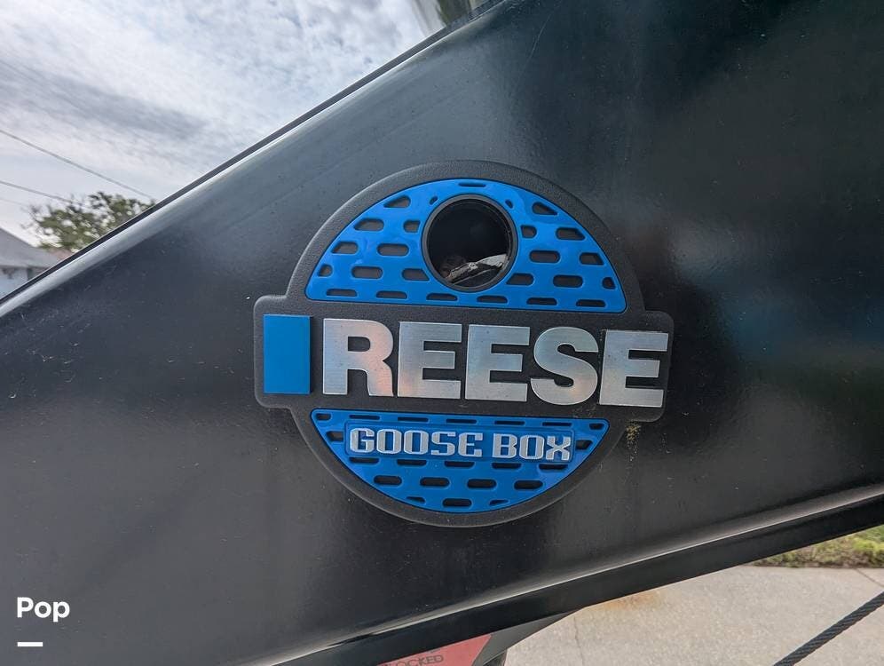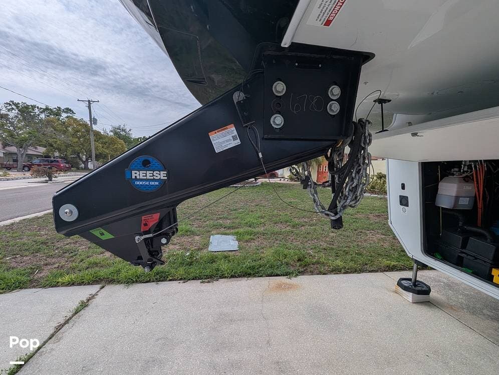 The gooseneck Reese hitch will quickly connect to your truck. Up on the roof, there are two large factory-installed solar panels for off-grid use. This Grand Design has side and rear cameras and an auto level for easy setup!