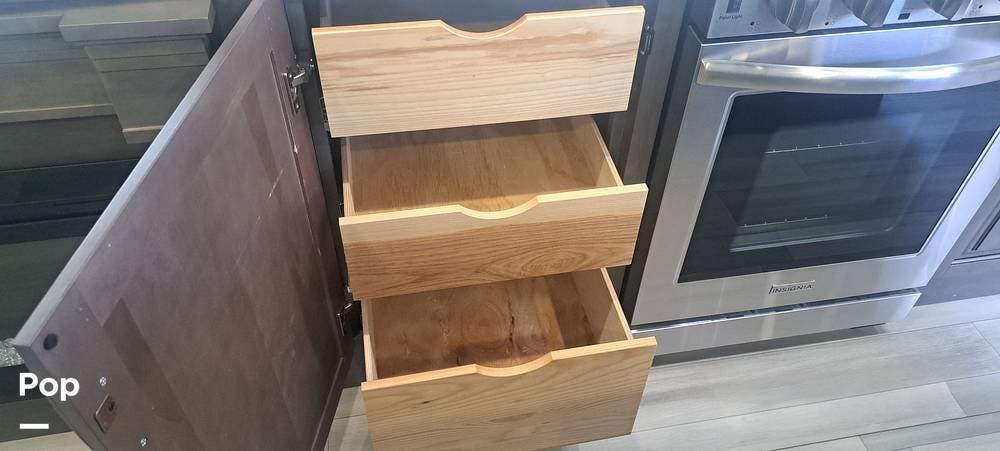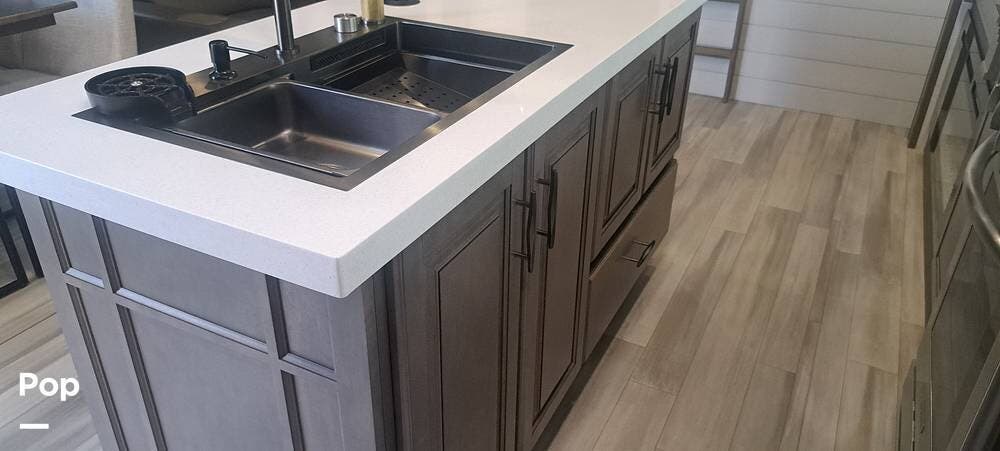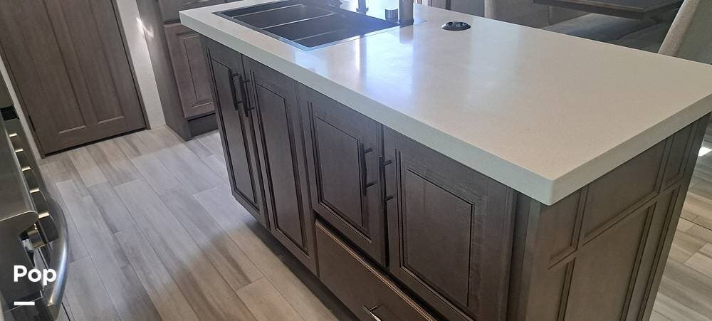The layout supports multiple occupants well. There are dual bedrooms, meaning people can have privacy; the bathrooms are placed and sized to serve them comfortably; and common areas -- including the living room and dining room -- are large enough to host guests. Slide‑outs are used in ways that expand the living space without compromising flow. The kitchen features an island, which serves as both a workspace and a gathering space, while maintaining efficiency.