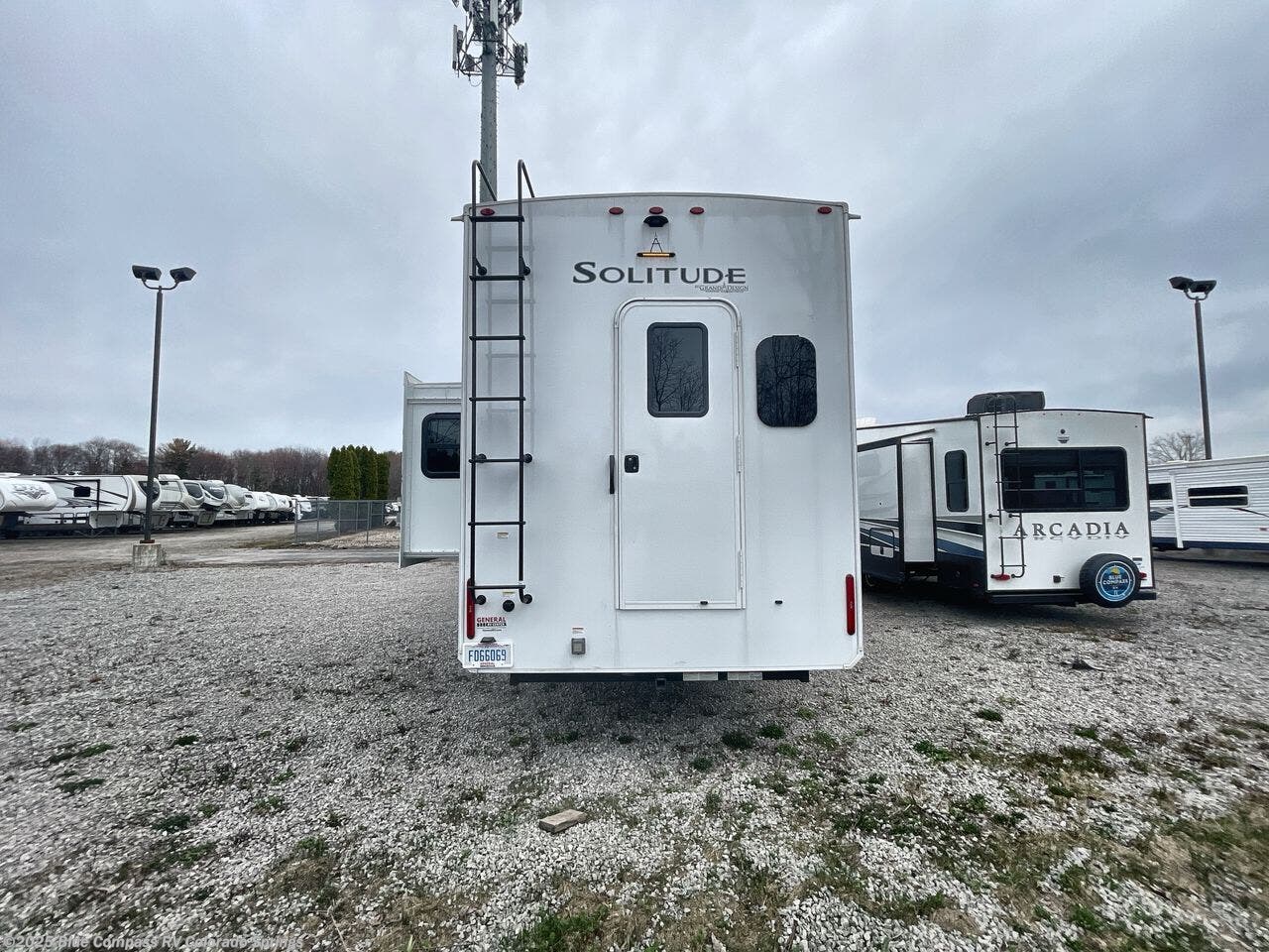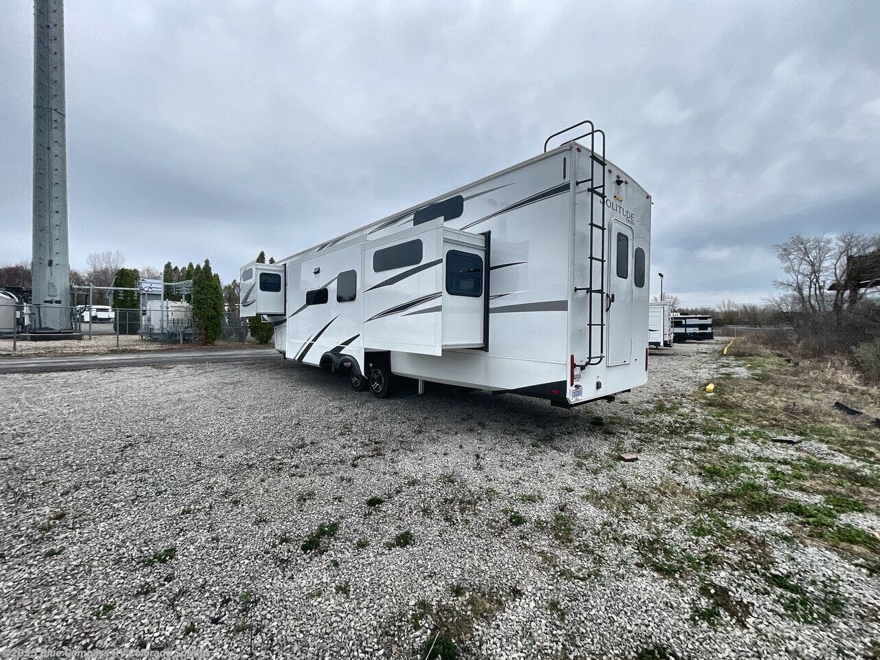 For an affordable luxury extended stay for your family, this Solitude is it! Two private bedrooms plus an overhead Sky Suite loft above the rear bedroom which also has it's own private rear entry/exit door is just the beginning of what is in store for your camping convenience. You will love the spacious feel that the Solitude provides with taller ceilings, larger scenic windows, and an interior width of 8' 5", not to mention FIVE slides in this unit alone. You may not even want to go home once you get a look inside. The upscale kitchen features an island with dishwasher prep, a large single bowl sink, a 12V 20 cu. ft. refrigerator for your perishables, and a 24" residential oven, not to mention you will also enjoy a microwave, pantry, and hutch for your dishes, plus a free standing dinette! You can easily take along extra family and friends with the second private bedroom featuring it's own private bath and entry which is great for another couple, and there is even loft space above this rear private bedroom for added storage or sleeping for children. Both bathrooms feature a shower with a skylight, vanity and sink, plus a toilet. And, you will find ample storage for clothing and belongings throughout with nice size closets, overhead cabinets, plus loads of outside storage. Speaking of outside, this unit features a spray port for rinsing off before heading inside, two awnings, a USB charging outlet, and four step aluminum shock assist entry steps at both entrances.