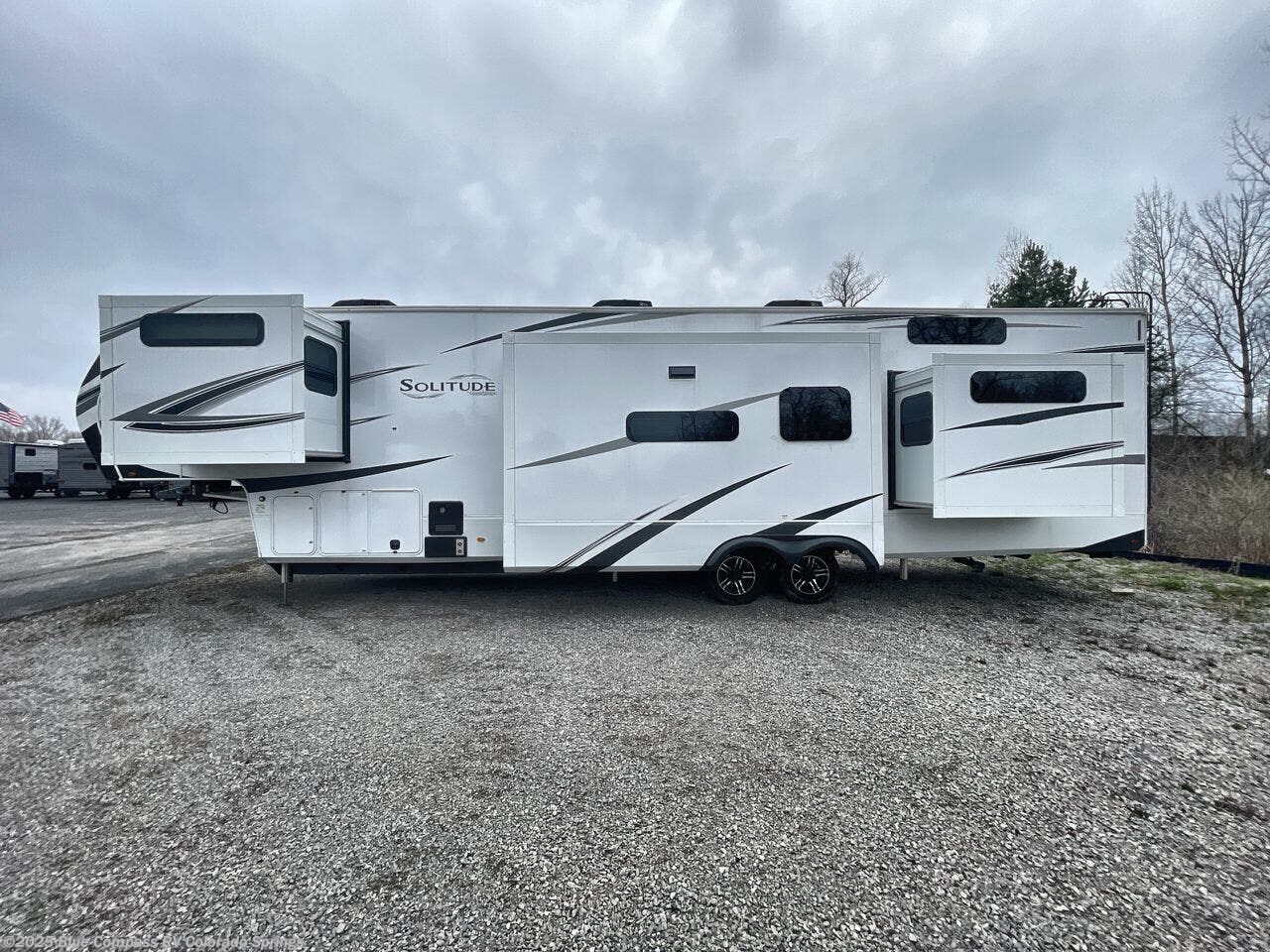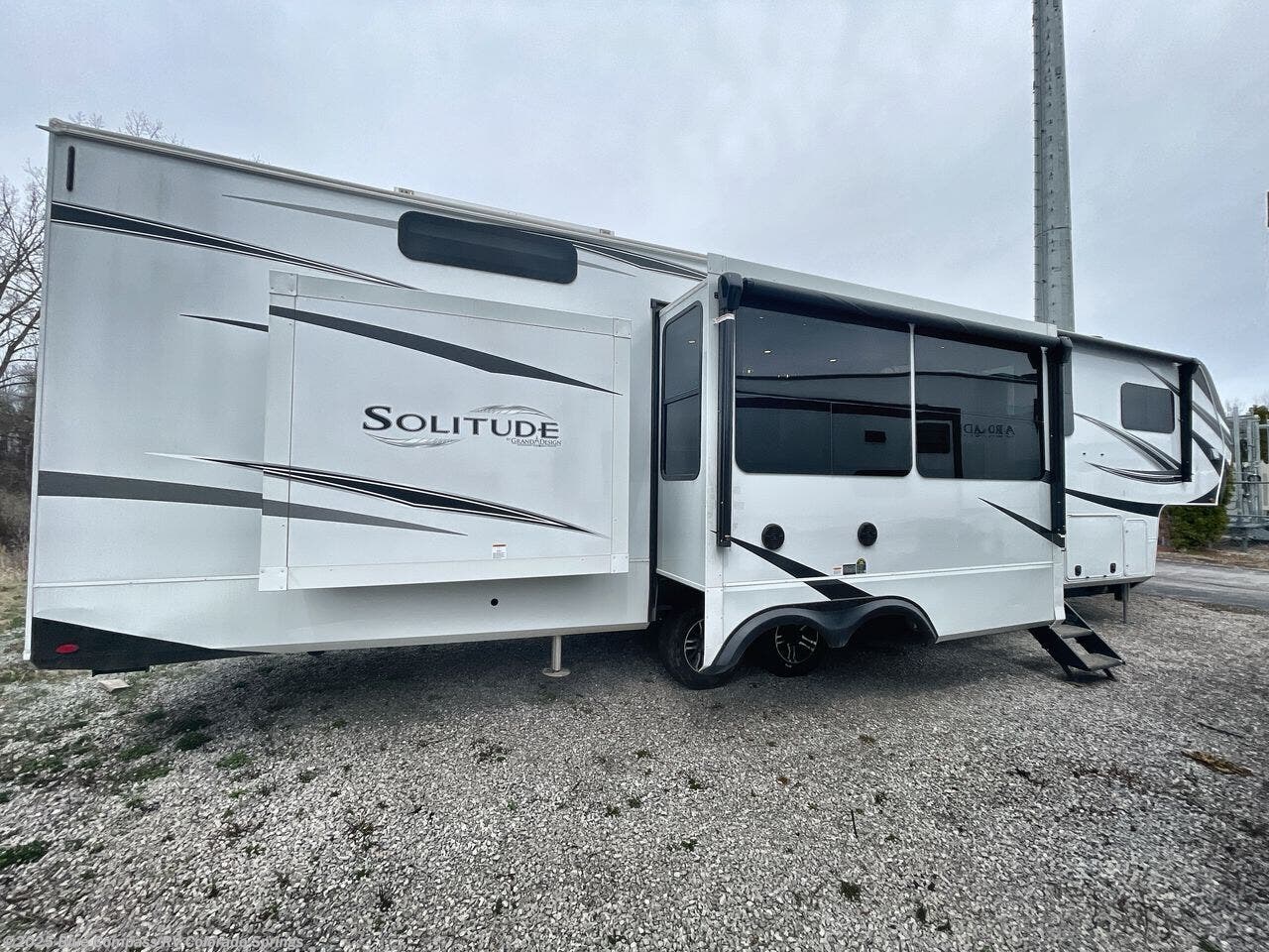 Each Solitude fifth wheel by Grand Design features a 101" wide-body construction, heavy duty 7,000 lb. axles, frameless tinted windows, and high-gloss gel coat sidewalls. You can camp year around thanks to the Weather-Tek Package that includes a 35K BTU high-capacity furnace, an all-in-one enclosed and heated utility center, and a fully enclosed underbelly with heated tanks and storage. Inside, you'll love the premium roller shades, hardwood cabinet doors, solid surface countertops and sinks, plus residential finishes throughout to make you truly feel at home. Each model also includes a MORryde CRE3000 suspension system, self adjusting brakes, and a MORryde pin box that will provide smooth towing from home to campground. Affordable luxury is possible with the Solitude fifth wheels; choose yours today!