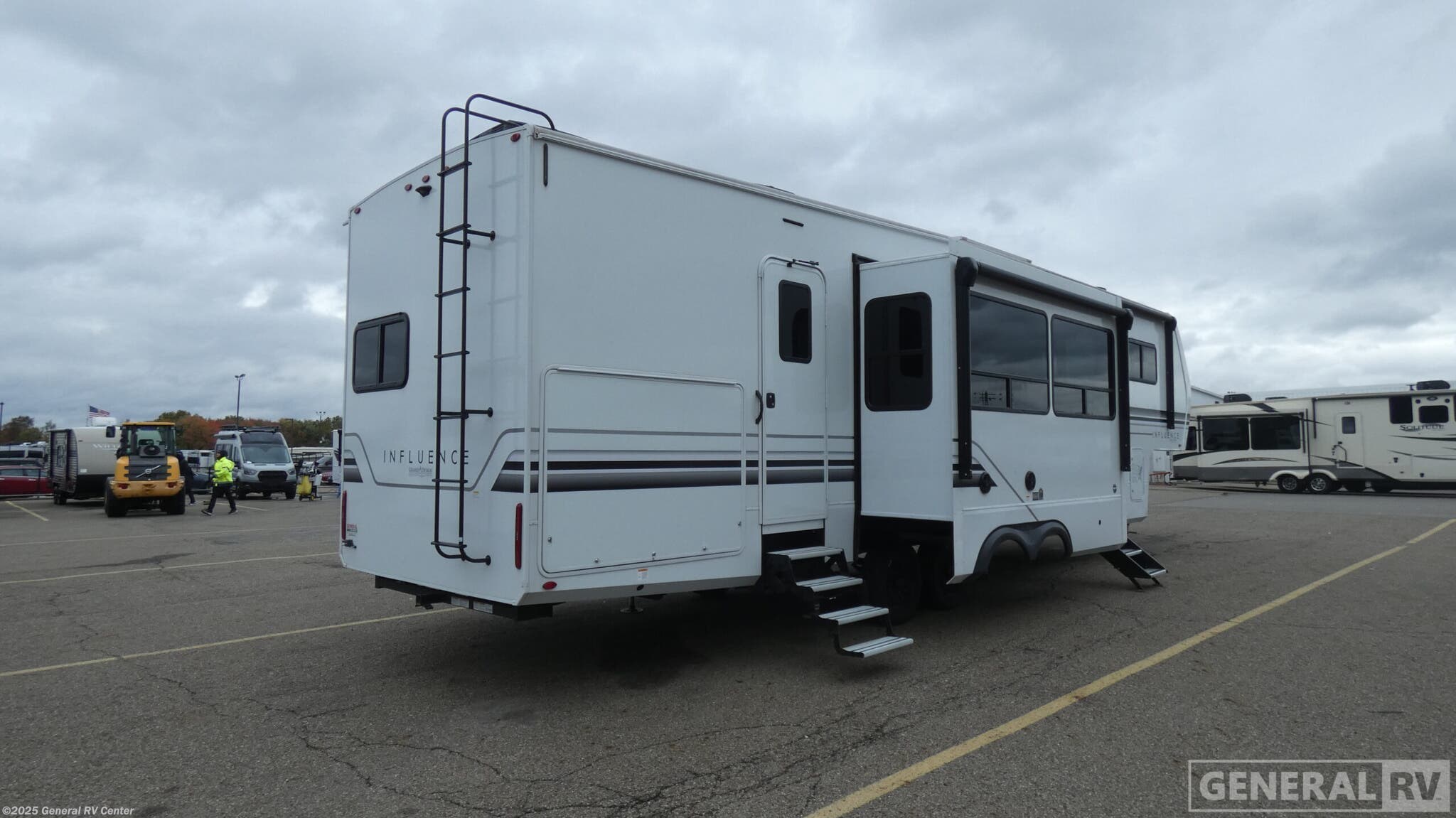 The 2024 Grand Design Influence 3704BH is a luxurious haven on wheels, perfect for those who crave comfort and adventure. Stretching 40 feet in length, this RV is designed to accommodate up to eight sleepers comfortably, making it ideal for family getaways or a road trip with friends. The spacious interior boasts four slide-outs, creating a roomy atmosphere where everyone can relax. The bunkhouse offers two bunks and a tri-fold sofa, ensuring ample sleeping space for the kids or guests. Meanwhile, the master suite, with its optional king bed, provides a serene retreat for a restful night's sleep. Inside, the 3704BH is a marvel of modern convenience and style. The kitchen is equipped with a 16 cu ft 12-volt refrigerator and a three-burner cooktop, perfect for whipping up delicious meals on the go. Enjoy your culinary creations at the free-standing dinette or relax in the theater seating while watching the LED smart TV. The entertainment center, complete with a fireplace, offers a cozy ambiance for those chillier nights. With two power awnings featuring LED lighting, you can extend your living space outdoors and enjoy the scenery, no matter the weather. Plus, the RV is prepped for a washer and dryer, making long-term travel even more convenient. For more information or to experience this RV firsthand, visit your nearest General RV dealership.