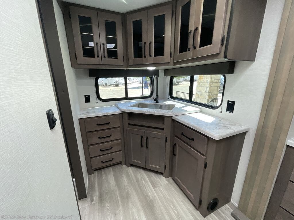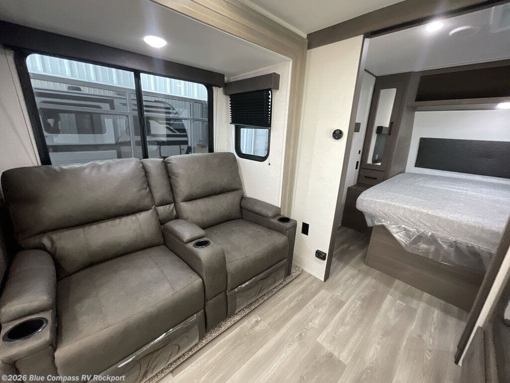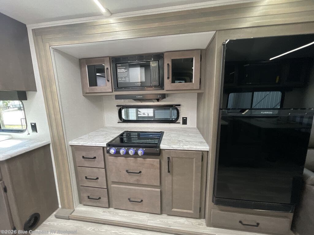 Relaxing weekends to the lake just got sweeter in this spacious travel trailer. Prepare lunch on the three-burner cooktop, and you can enjoy it at the booth dinette. There is also a 60" sleeper sofa, or you can choose the optional theater seating in place of the sofa if you don't need the extra sleeping space. This model includes plenty of storage space, including a pantry/wardrobe just as you enter the unit, overhead compartments, and even a pet dish for food and water!