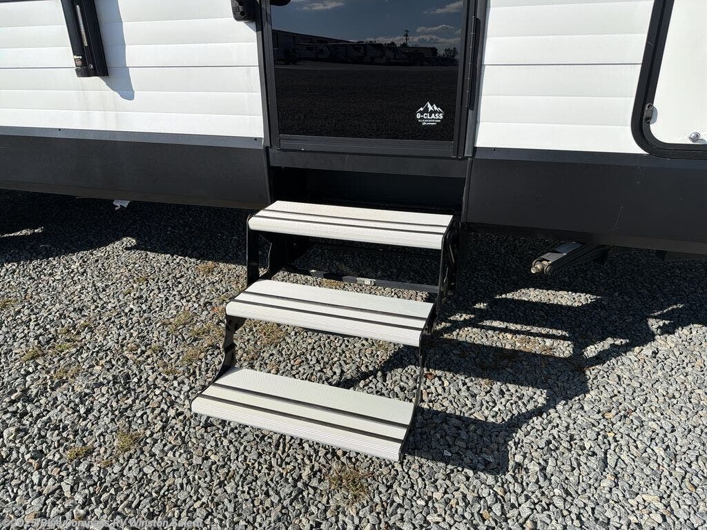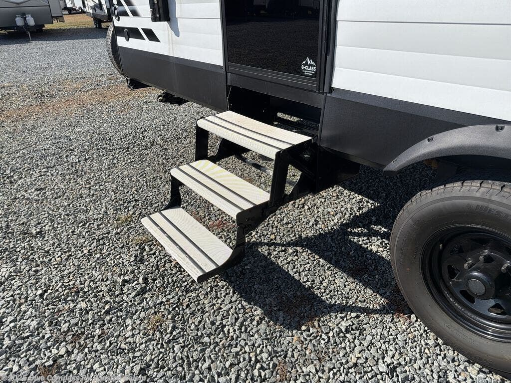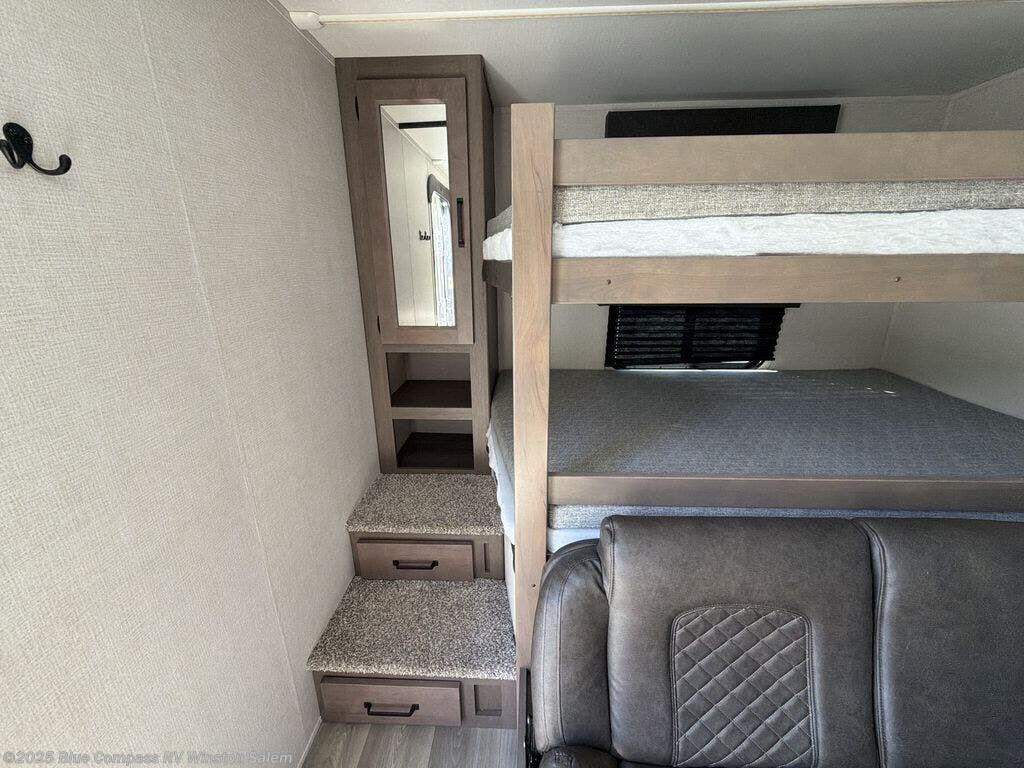 Are you ready to camp in comfort with your family or friends? This travel trailer allows you to do just that! There are double-size bunks in the back with step storage for books or board games. There is also a closet here to keep clothes wrinkle-free. The large slide features a U-Shaped dinette which is perfect for everyone to gather for a meal or games, and there is also theater seating adjacent to the slide. This model features a walk-through bath that leads to the front master bedroom. You'll love the queen bed here, overhead storage, and your own exterior entry door for convenience.