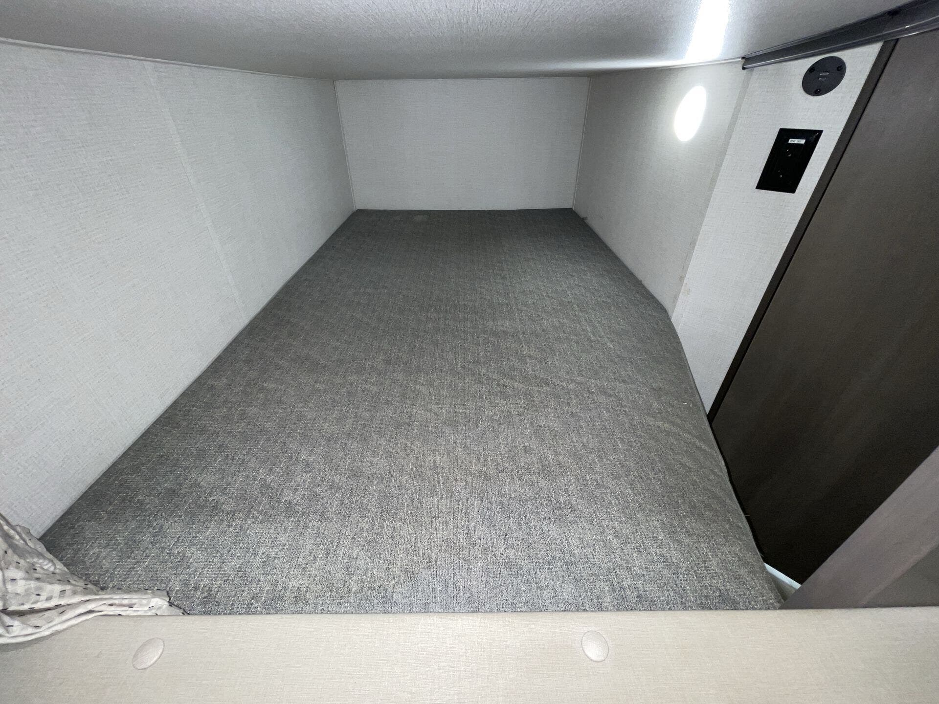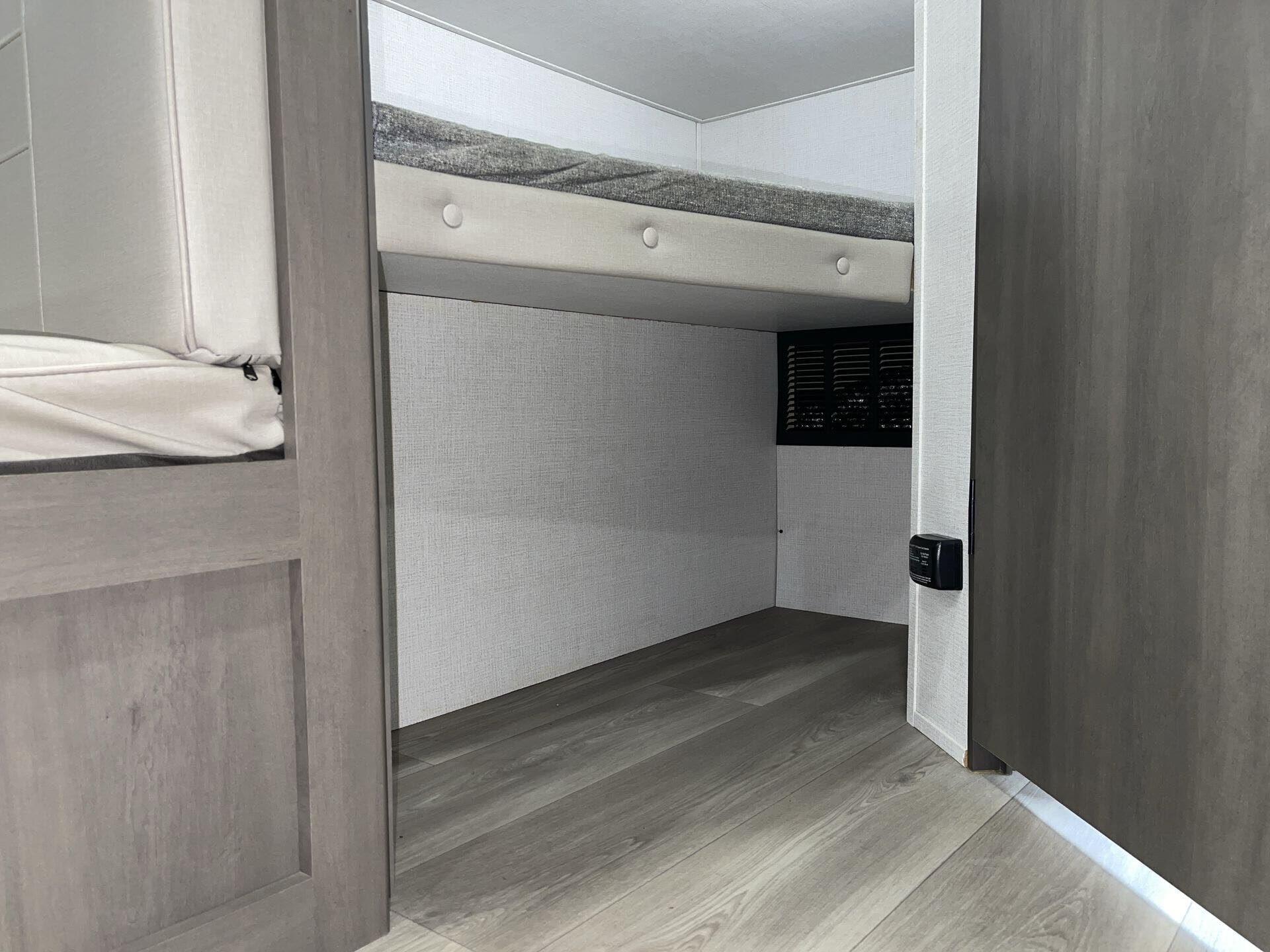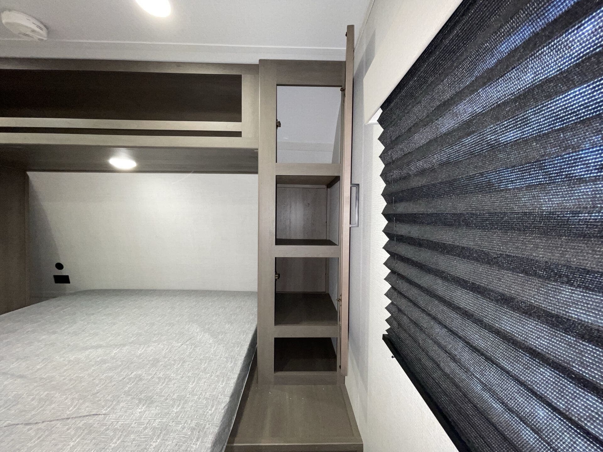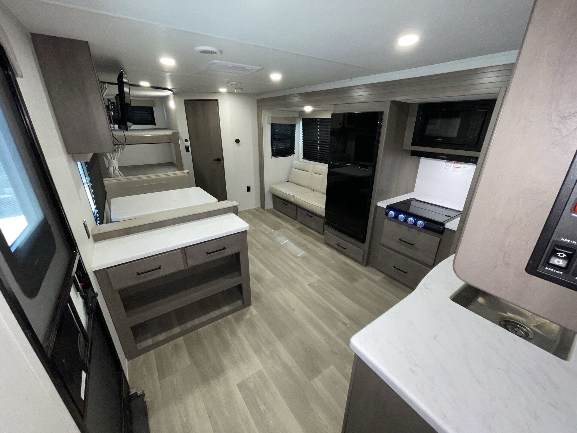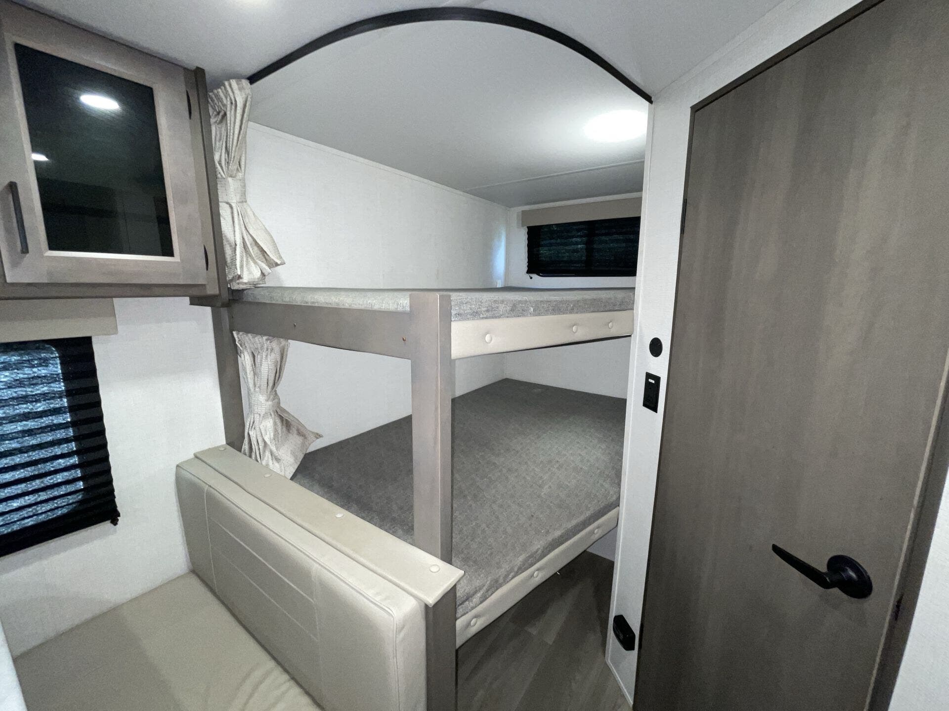 Inside, the layout maximizes sleeping capacity with double-over-double bunks, a private queen bedroom, and convertible seating areas—making it easy to bring along family and friends. The slide-out opens up the main living area, creating a comfortable space to relax, dine, or entertain.
