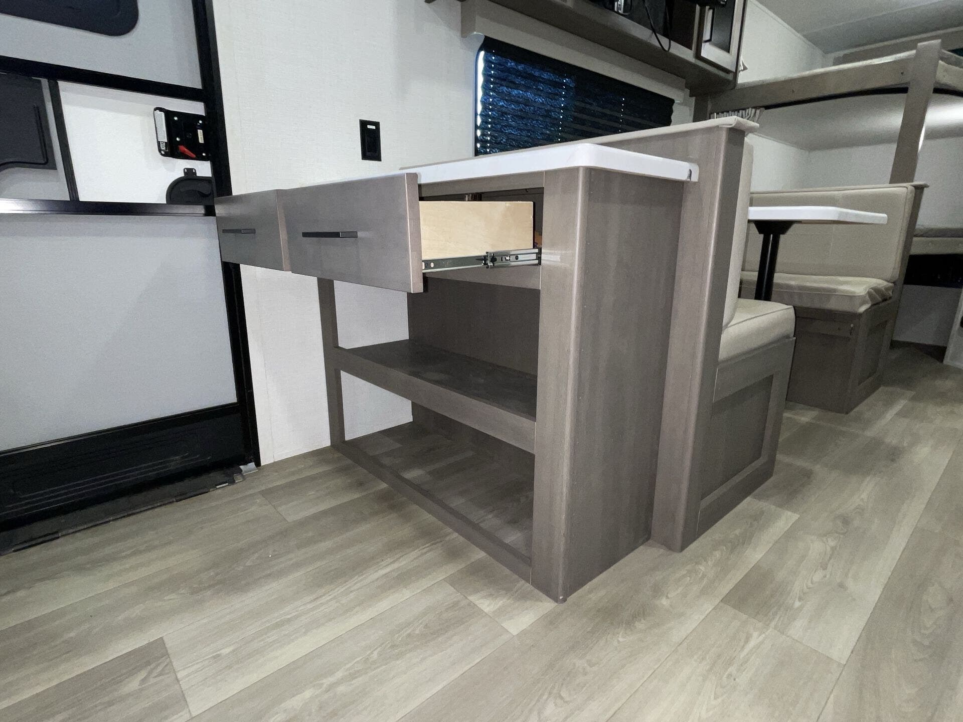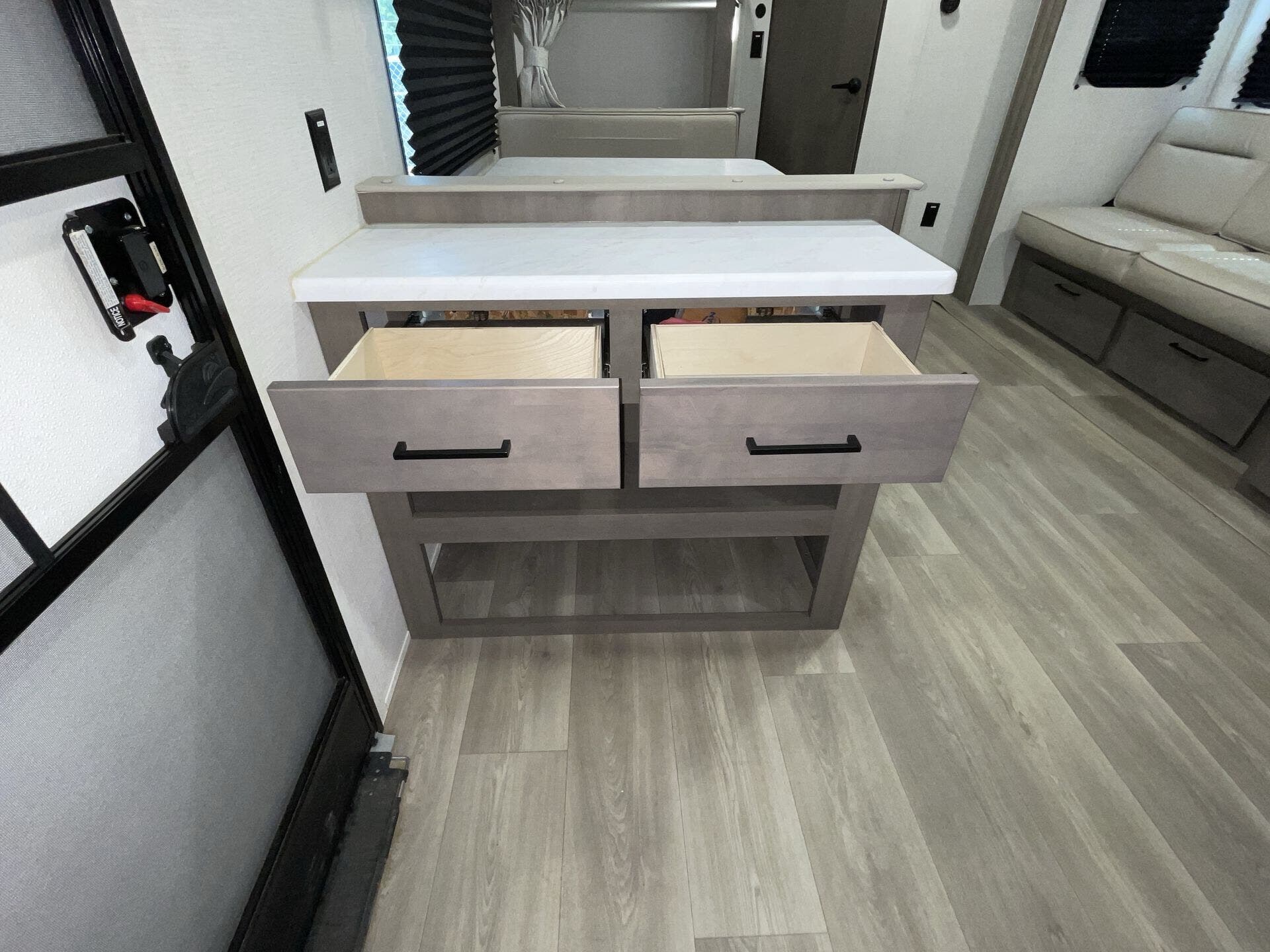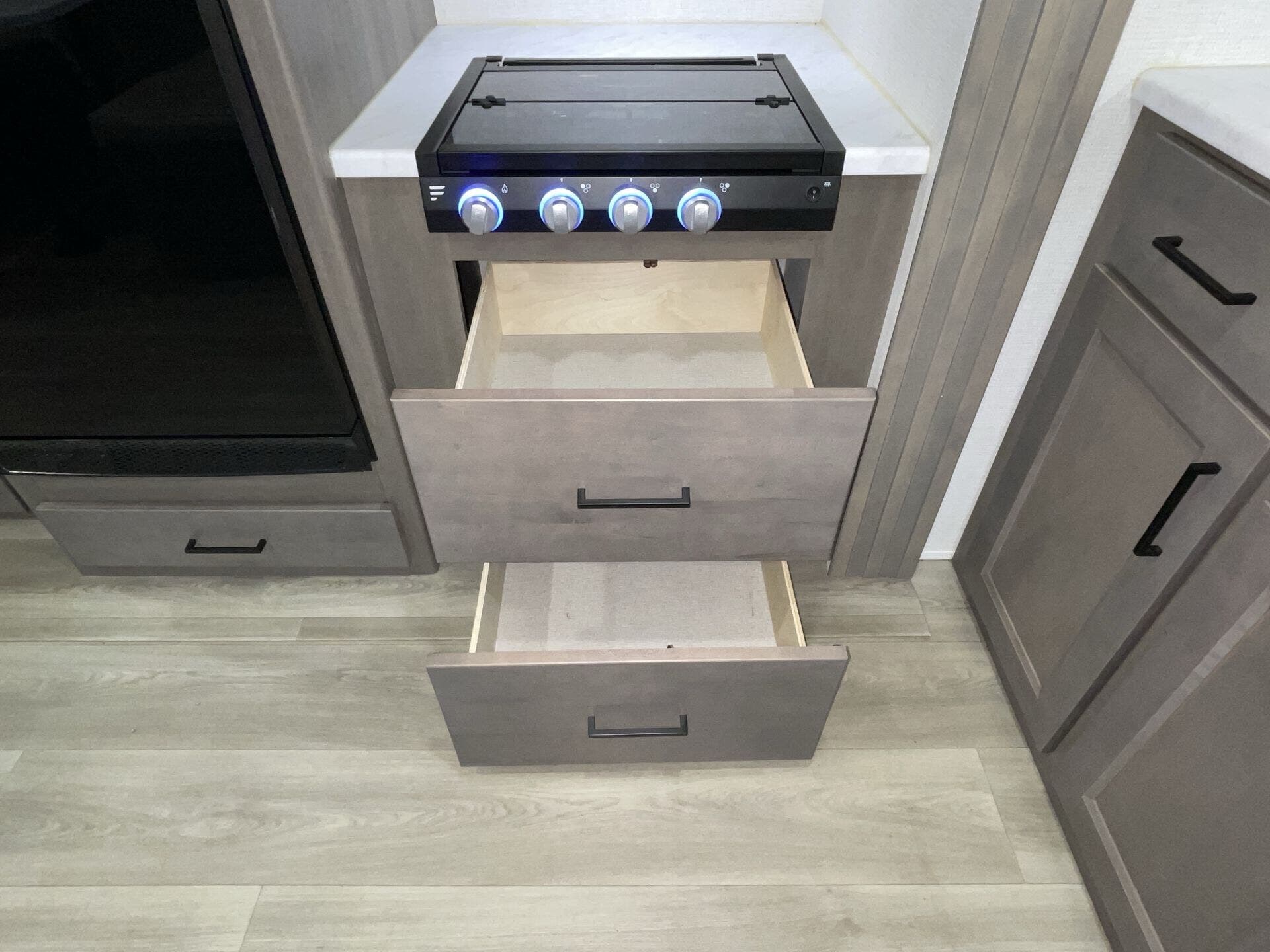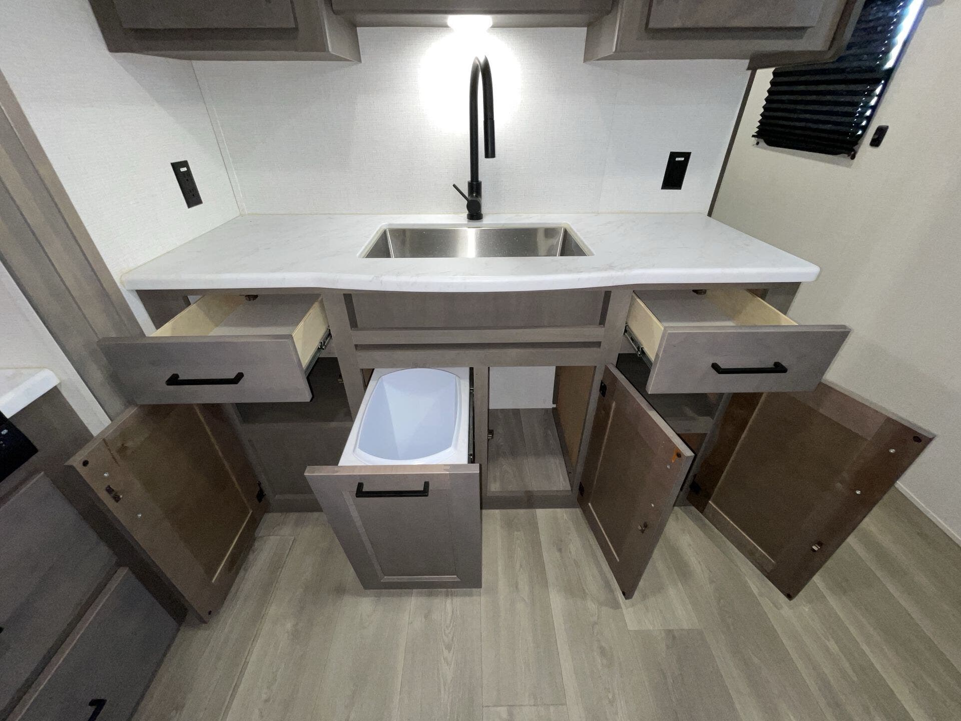 The kitchen is fully equipped for life on the road, while the addition of an outdoor kitchen makes it even easier to cook and enjoy meals outside. The full bathroom with walk-in shower adds convenience and eliminates the need for campground facilities.