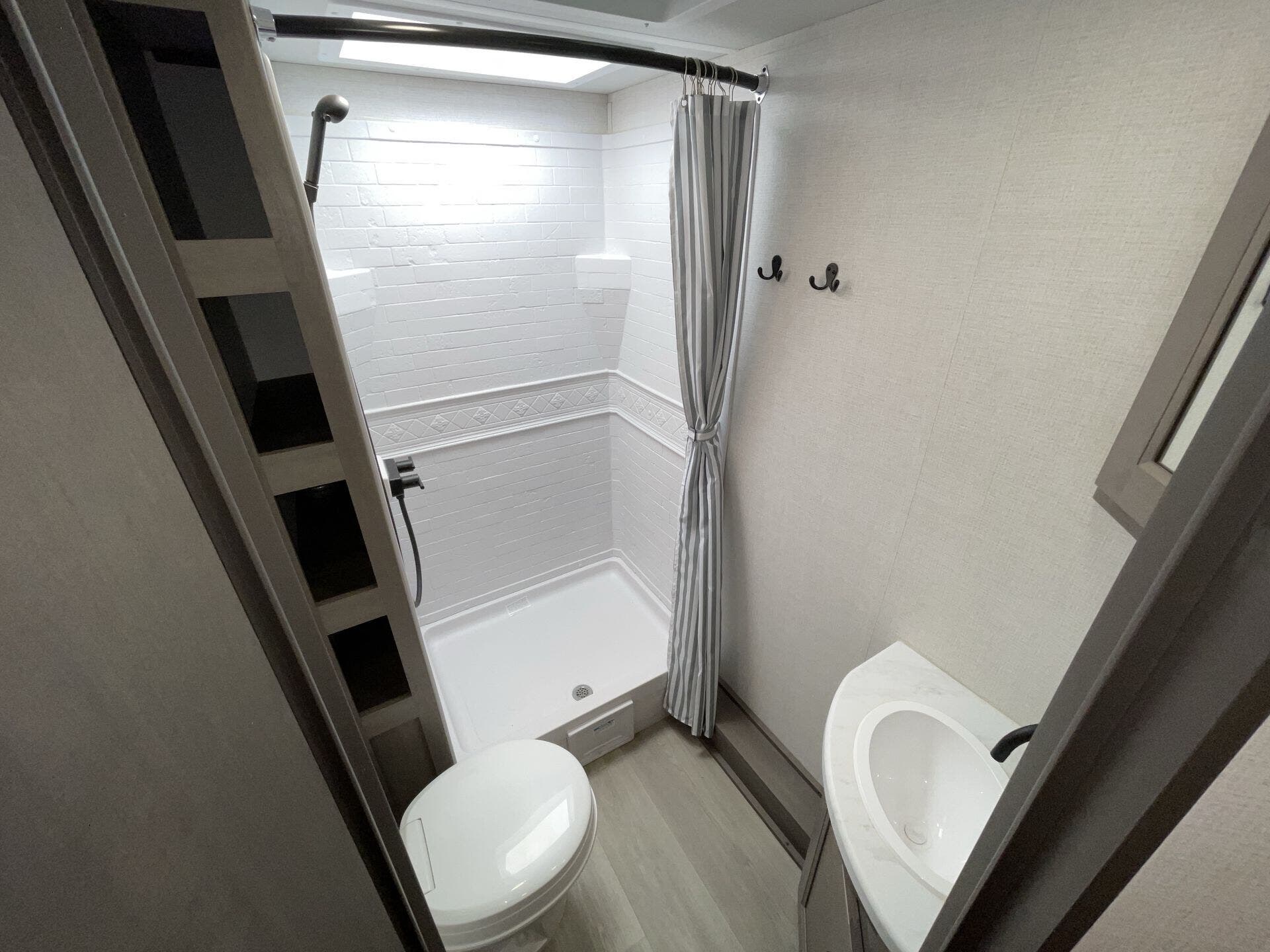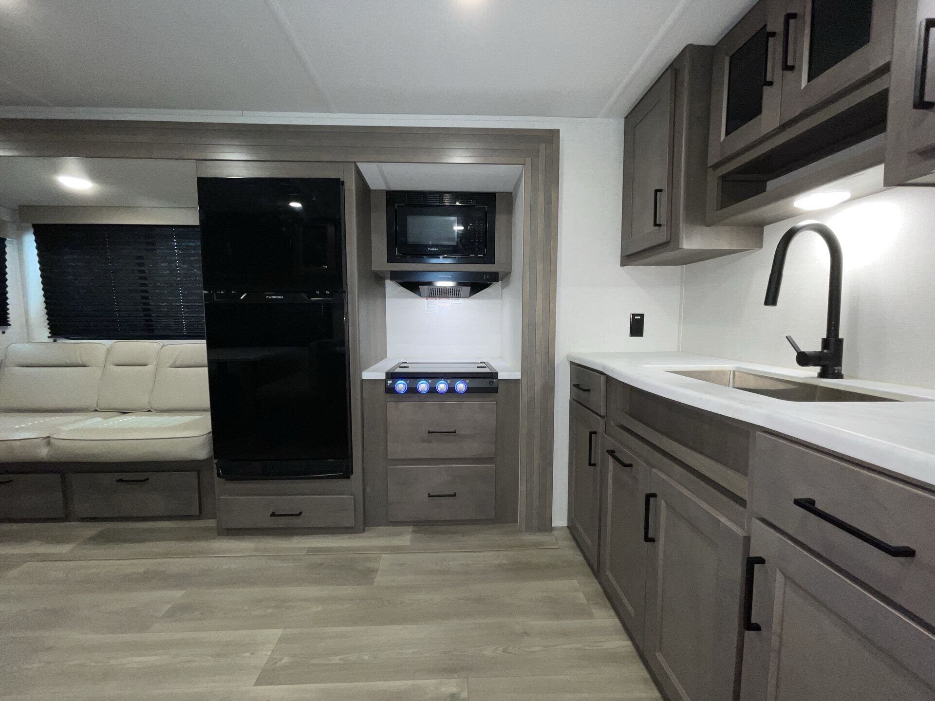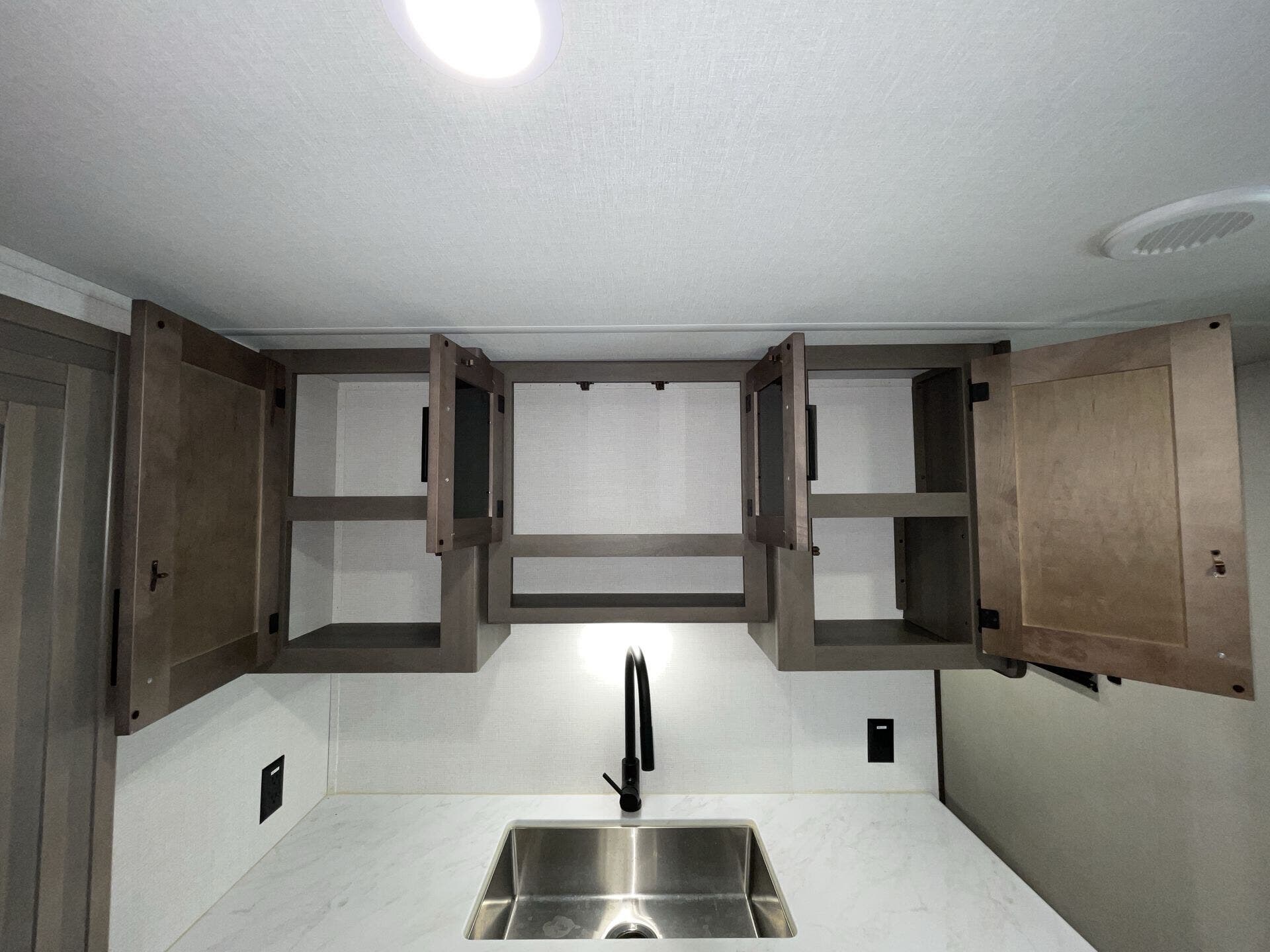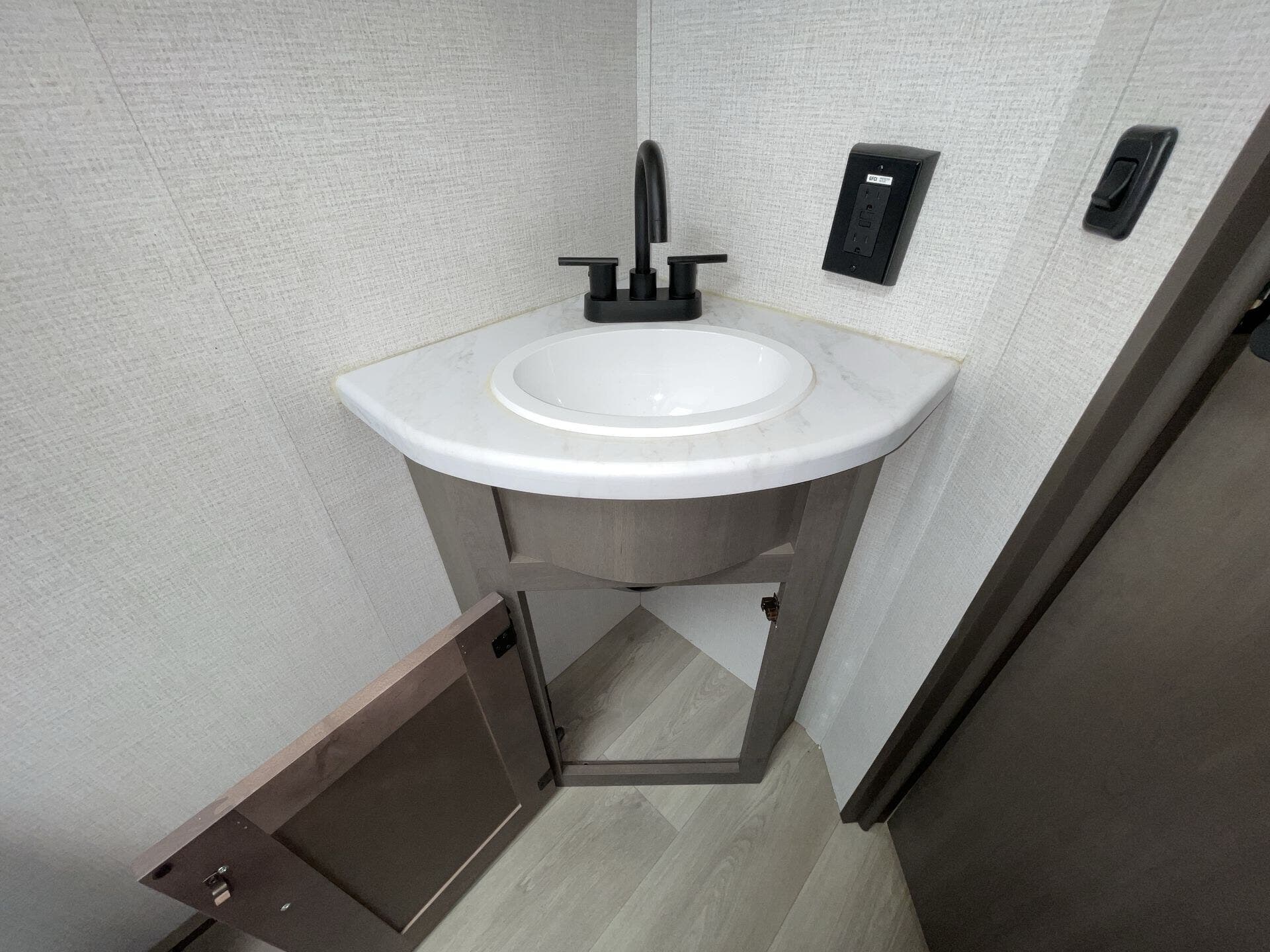The kitchen is fully equipped for life on the road, while the addition of an outdoor kitchen makes it even easier to cook and enjoy meals outside. The full bathroom with walk-in shower adds convenience and eliminates the need for campground facilities.