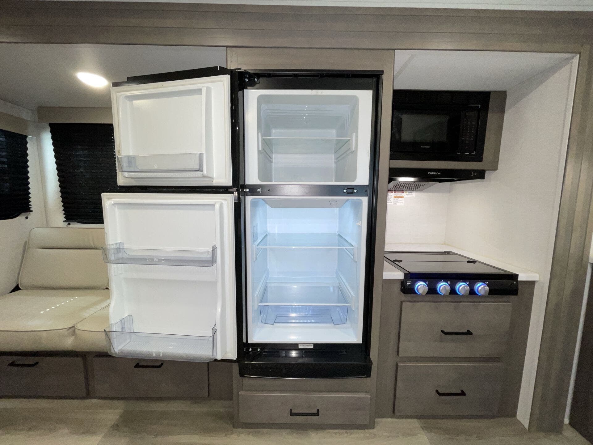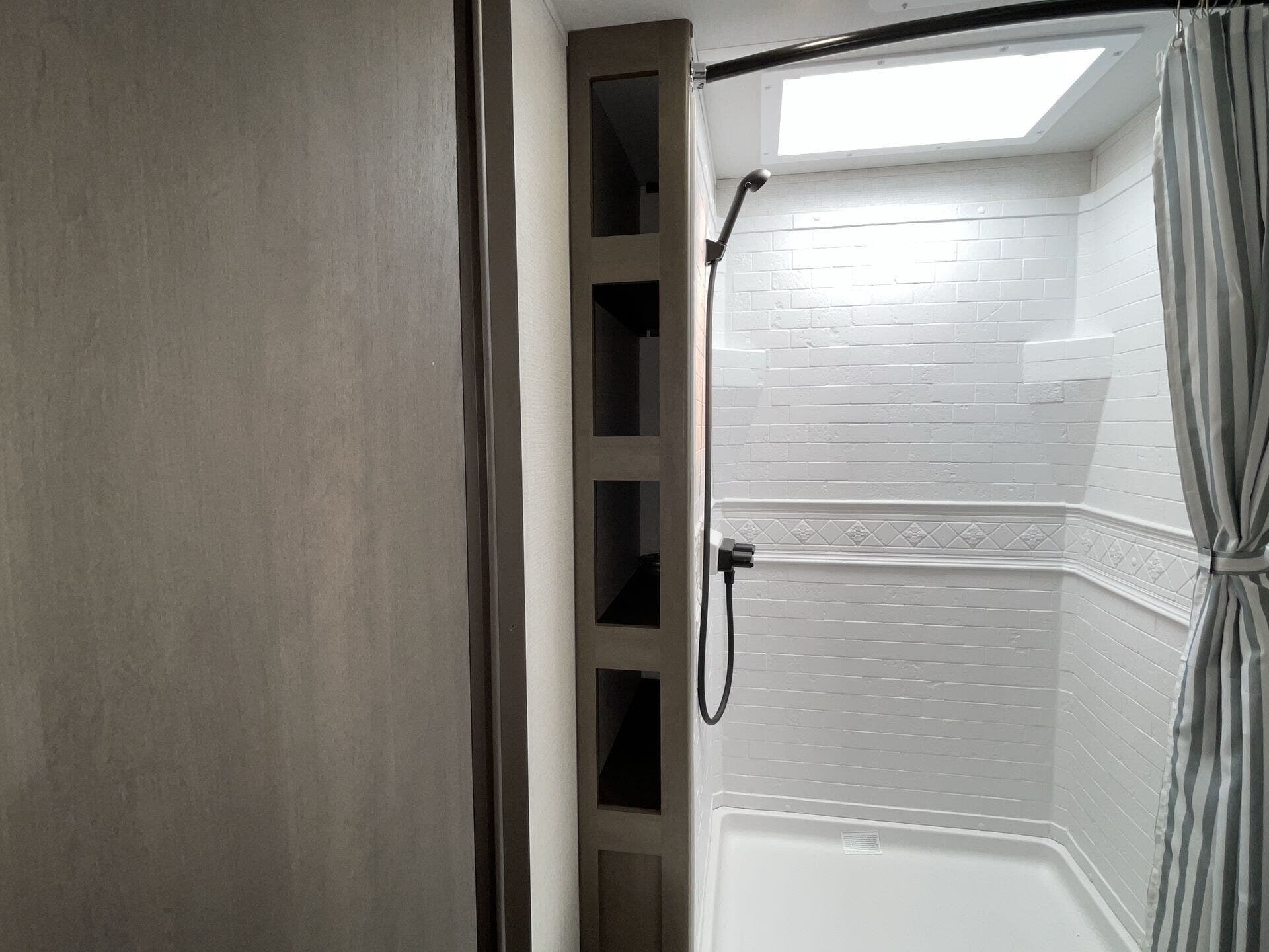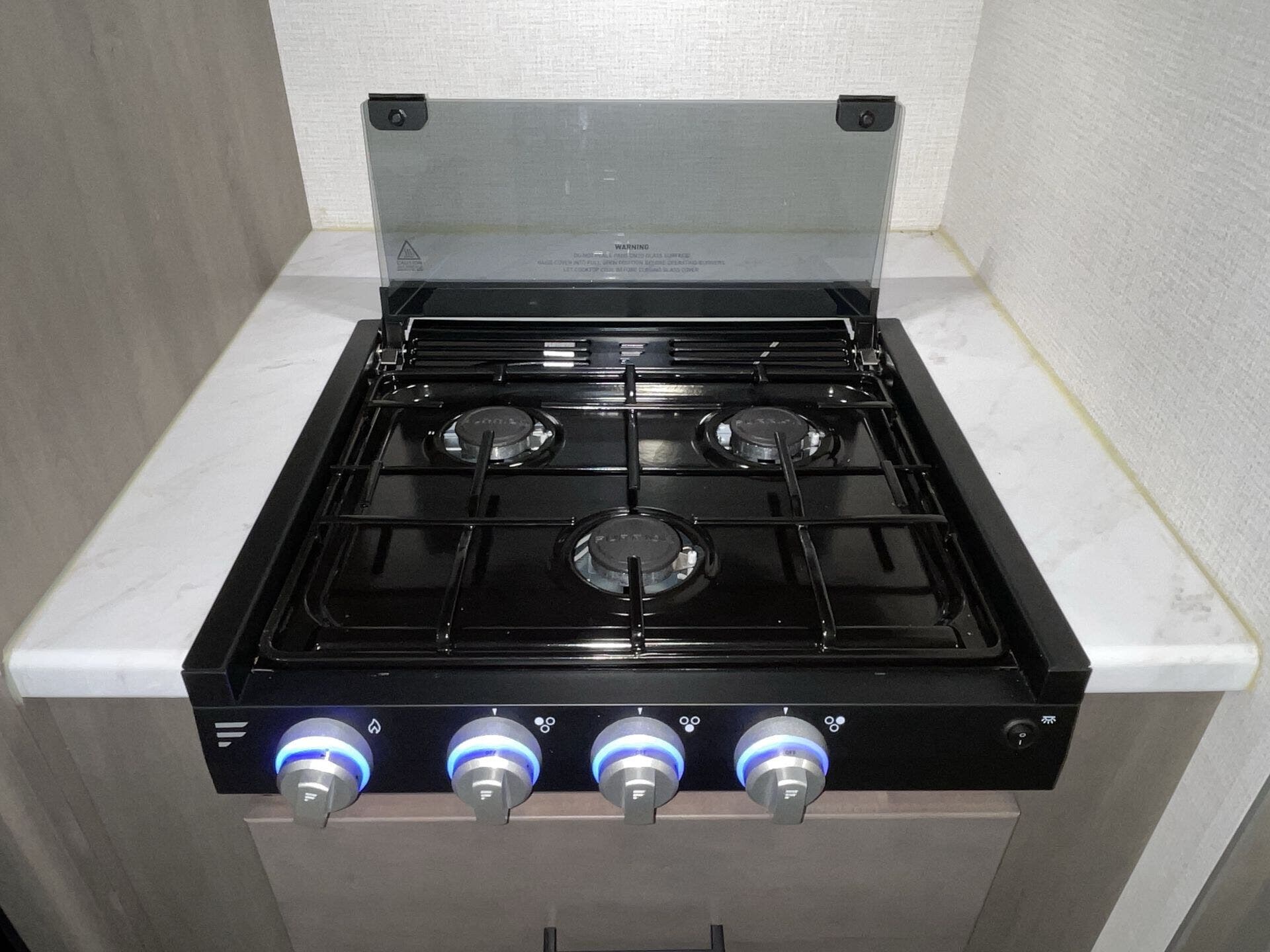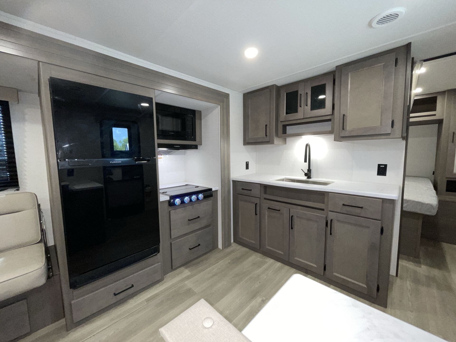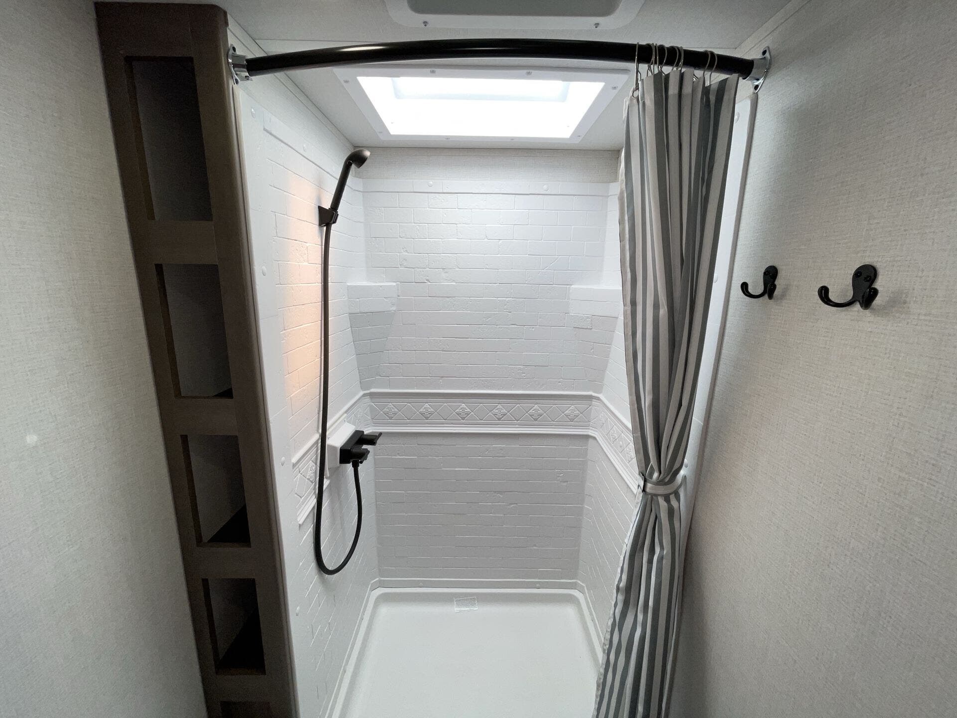 The kitchen is fully equipped for life on the road, while the addition of an outdoor kitchen makes it even easier to cook and enjoy meals outside. The full bathroom with walk-in shower adds convenience and eliminates the need for campground facilities.