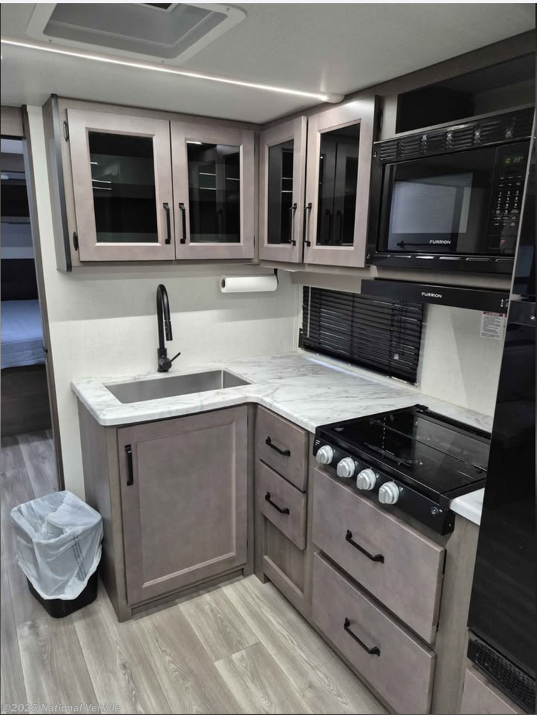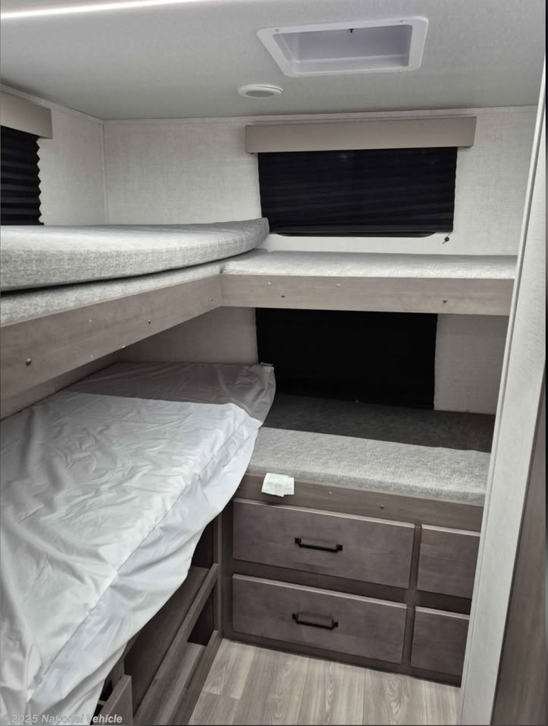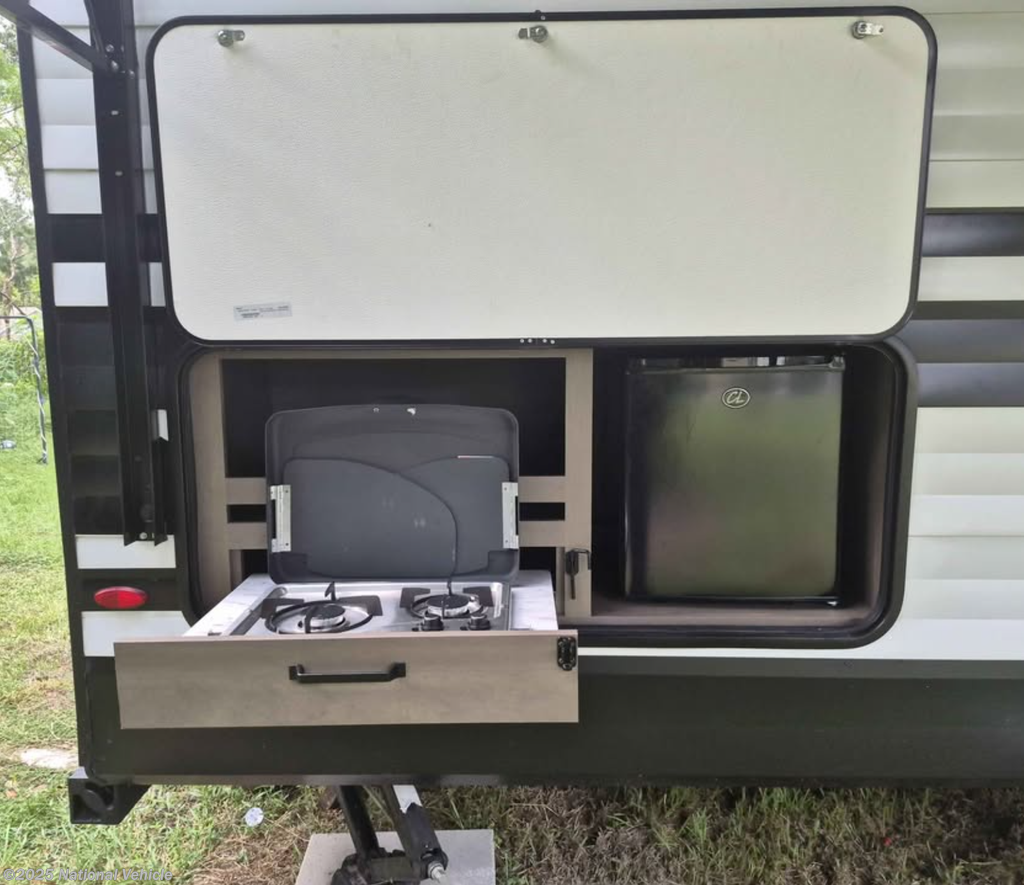 Inside, the rear bunkhouse suite boasts four bunk beds and a half bath, giving kids or guests their own dedicated zone. The main living area features a large slide?out, sleeper sofa, booth dinette, and a 32?inch TV for cozy evenings. The kitchen is laid?out with practical touches ? a three?burner cooktop, deep stainless sink, ample cabinets ? and even includes an exterior kitchen option for outdoor entertaining.