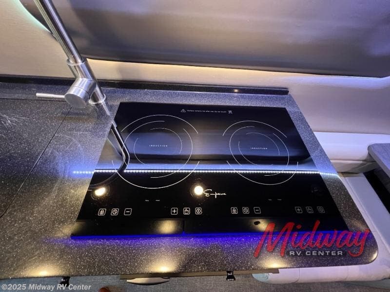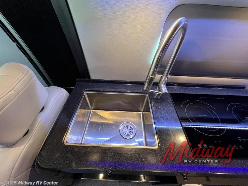 Whether you travel to see mountains, beaches or friends, this coach will provide all the luxury and functionality you will want while on the road! There are two captain's chairs plus two additional chairs right behind with a table to dine at once at your destination. You will find five more seatbelts in the rear seating when you plan a trip for everyone to tailgate at the big game, listen to music at a festival, or watch a club sport in another city. When you need to sleep two, the power sofa bed offers just that, and the private enclosed wet bath also includes a window and privacy shade. The cook can make meals using the galley kitchen with a farmhouse-style sink, combo microwave/convection/air fryer and a two-burner induction cooktop.