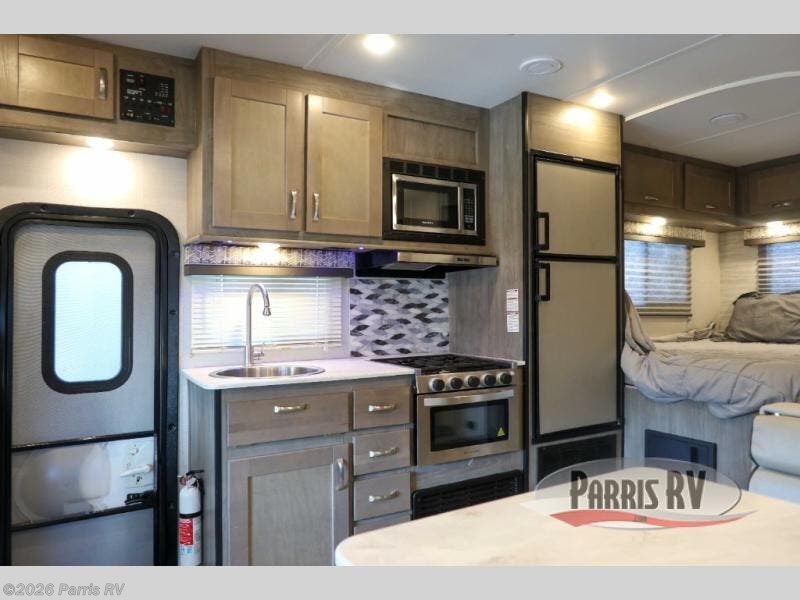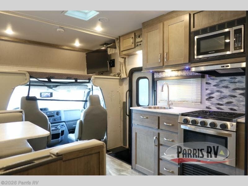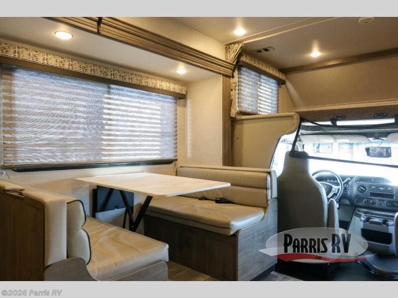If you enjoy traveling the countryside during the day and pulling off into your favorite campground at night, then check out the comfortable accommodations this motorhome has to offer. For your group of five, you will have enough sleeping space between the RV queen bed in the rear, the overhead bunk above the cab, and the booth dinette. The kitchen provides everything you will need to cook all your meals and store leftovers, plus the dinette allows you to eat inside without worrying about bugs swarming you. The electric awning offers another living space outdoors, and it comes with LED lights so that you can party with the neighbors.