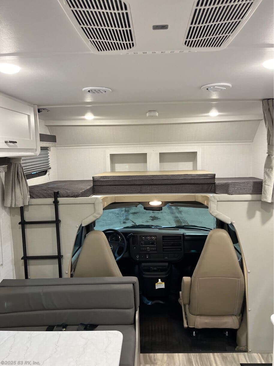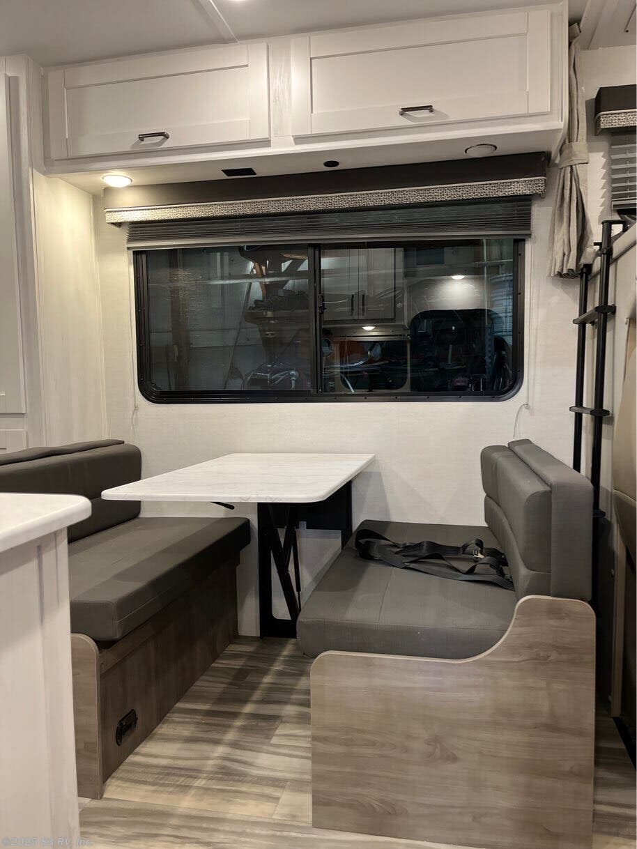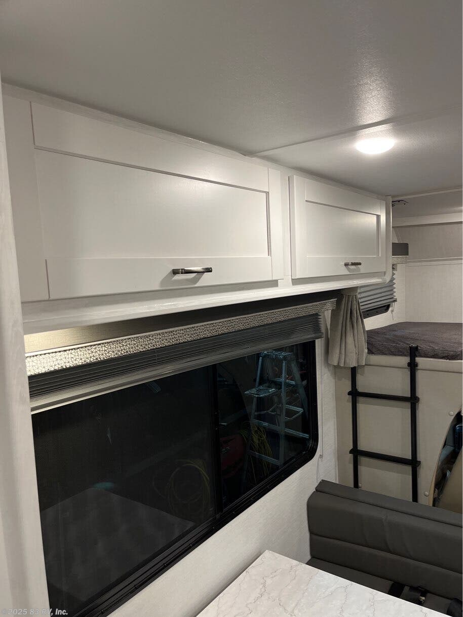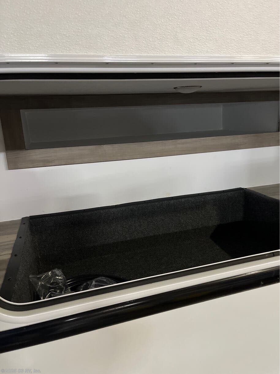 The thoughtfully designed floor plan includes bunk over cab and rear bedroom layouts, marrying function with style. Finished in a sleek white exterior with a stunning grotto interior color, this RV is not just practical but stylish as well. Key features include a flat-screen TV, auxiliary battery charger, and exterior speakers for entertainment during your stops.