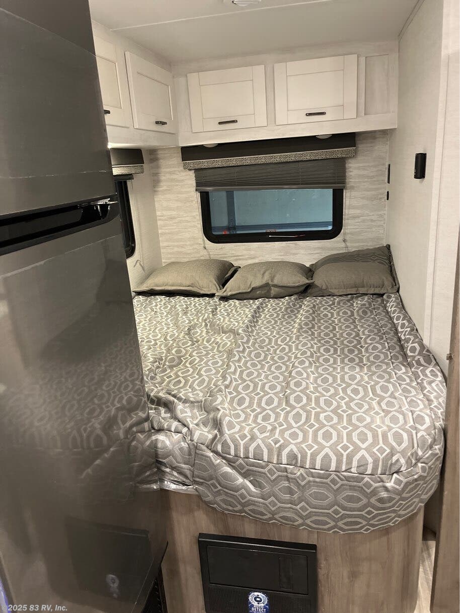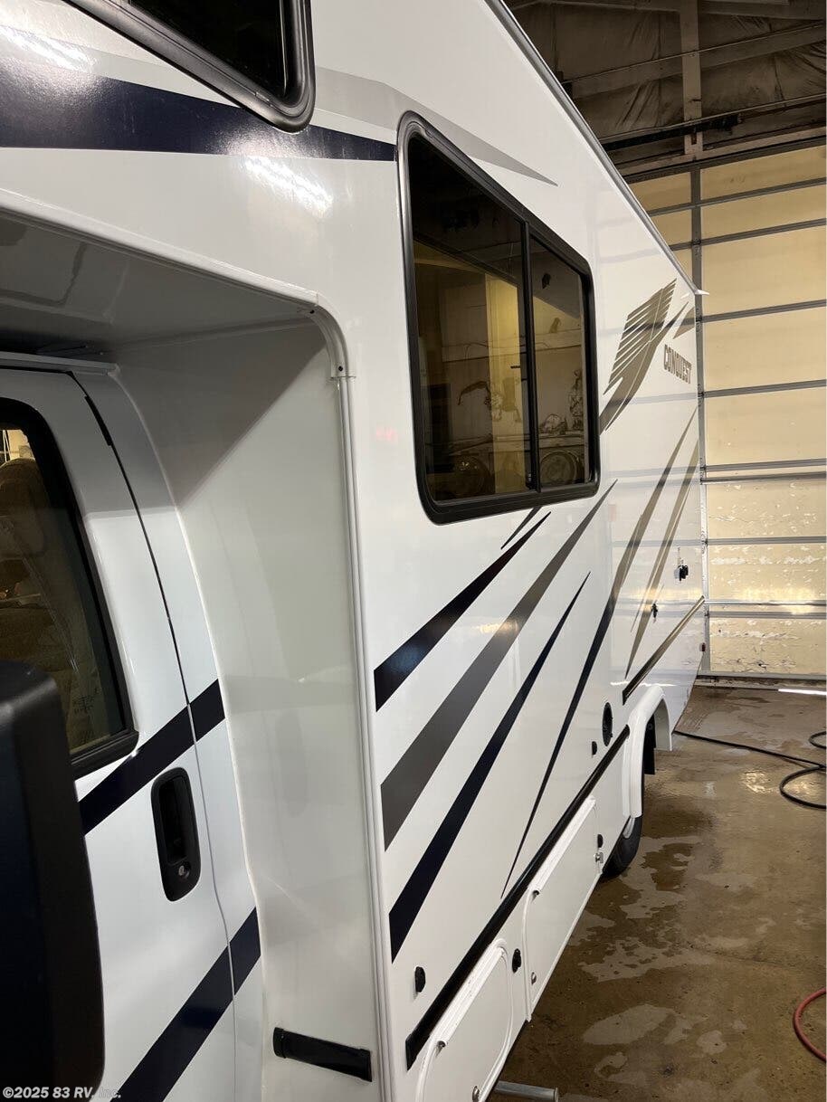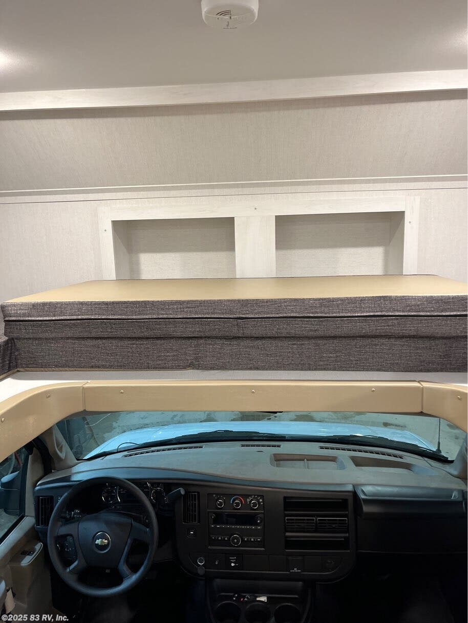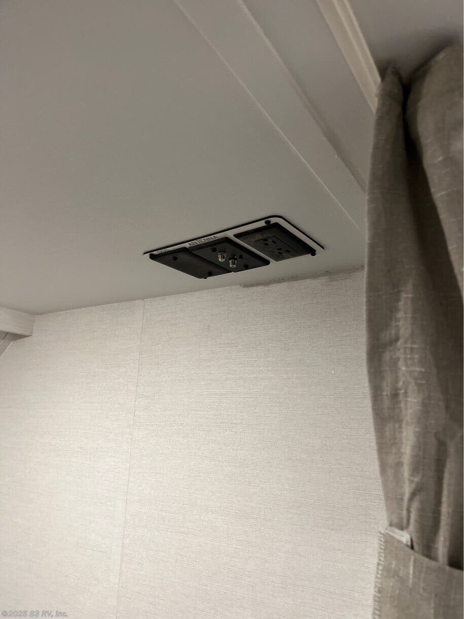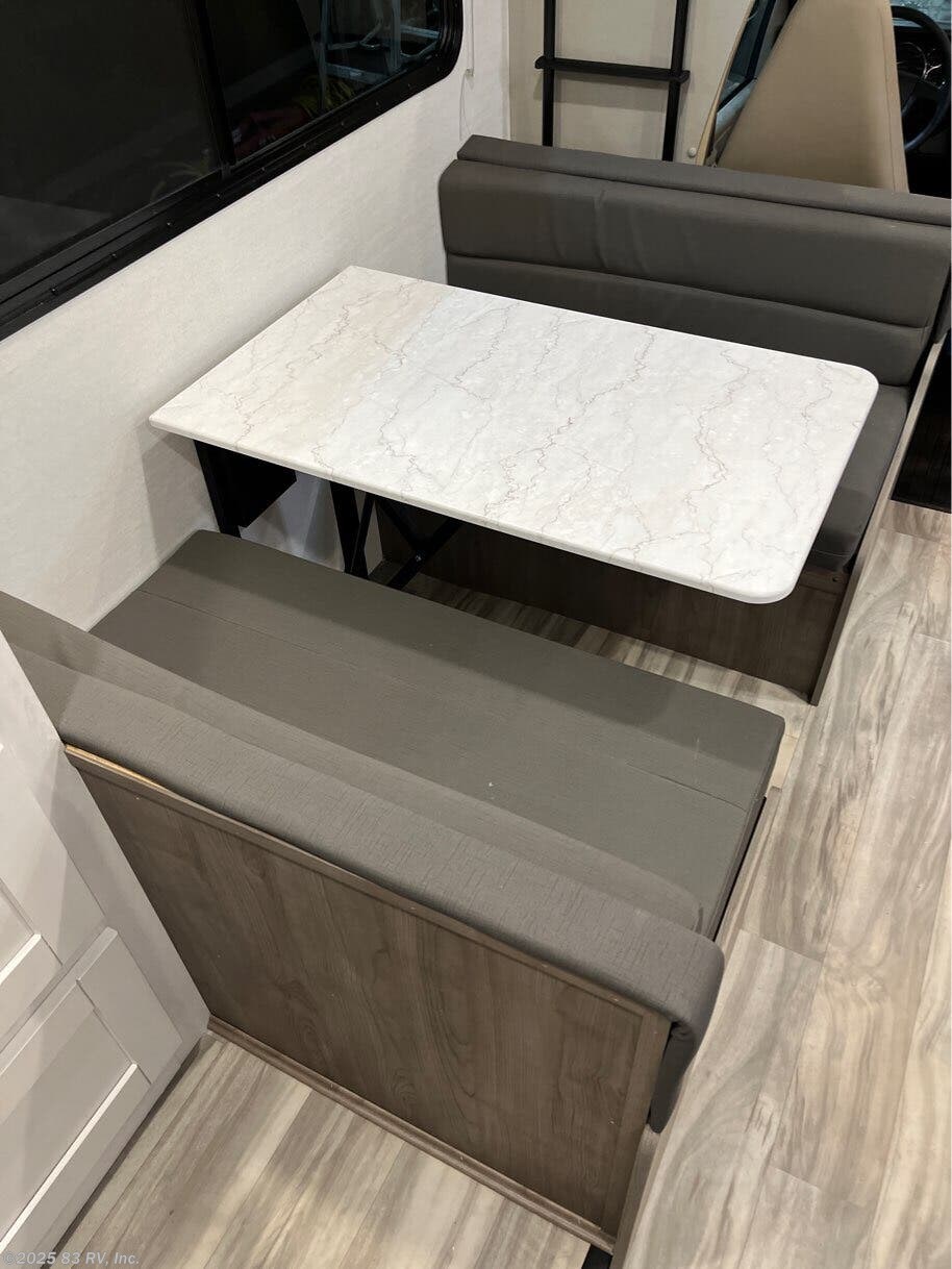 The thoughtfully designed floor plan includes bunk over cab and rear bedroom layouts, marrying function with style. Finished in a sleek white exterior with a stunning grotto interior color, this RV is not just practical but stylish as well. Key features include a flat-screen TV, auxiliary battery charger, and exterior speakers for entertainment during your stops.