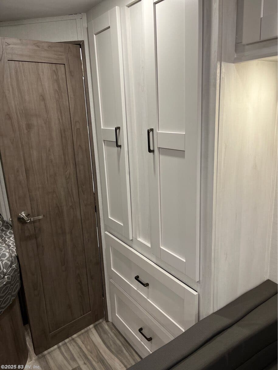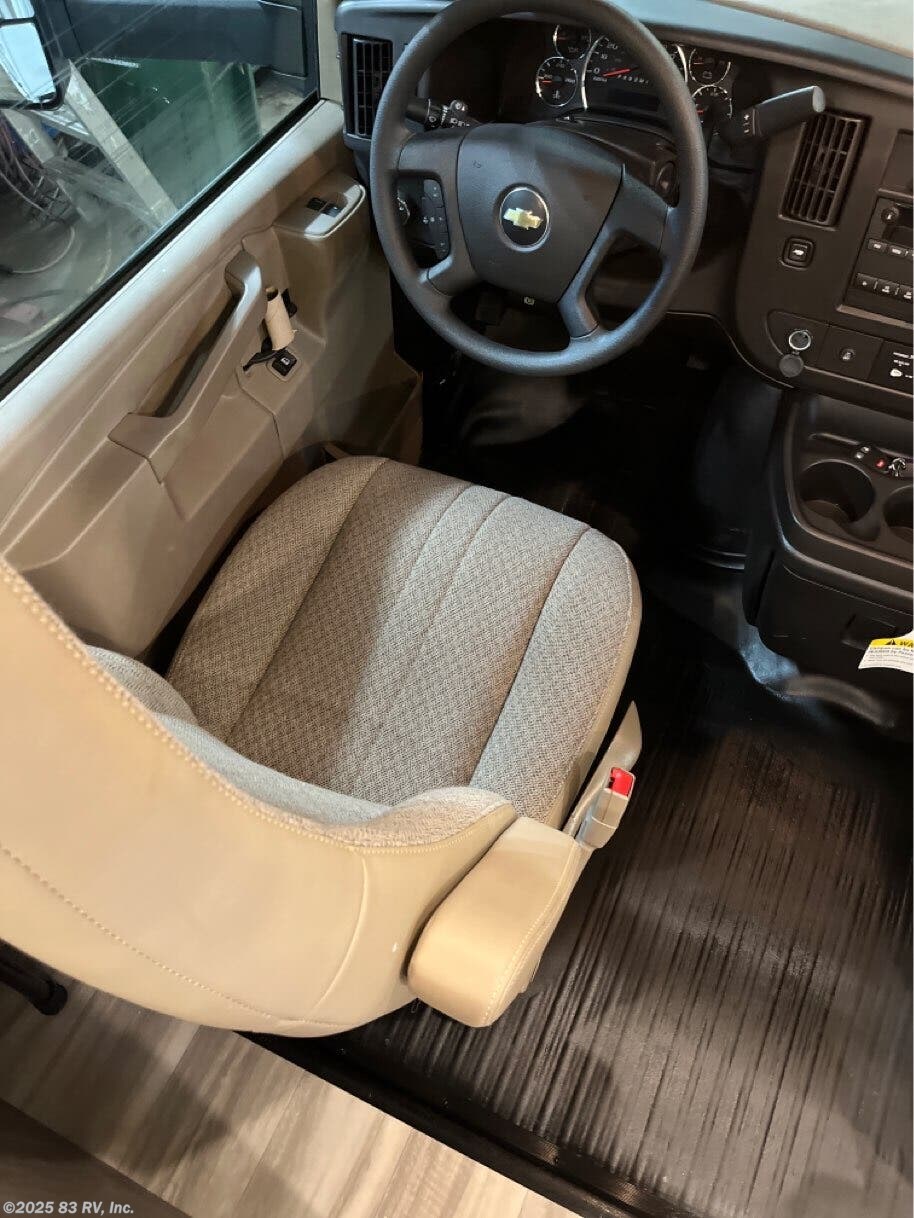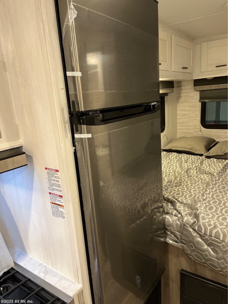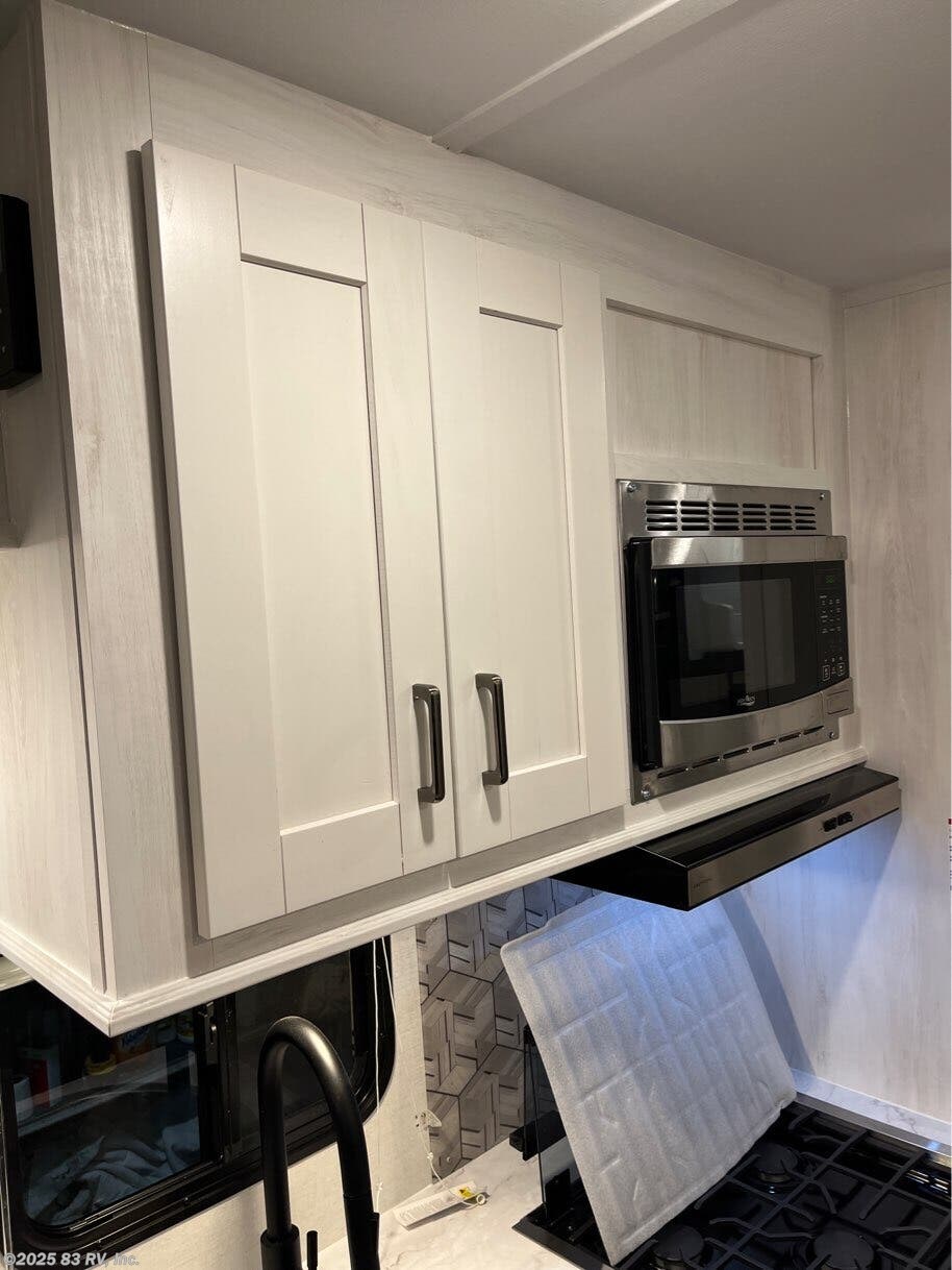 The thoughtfully designed floor plan includes bunk over cab and rear bedroom layouts, marrying function with style. Finished in a sleek white exterior with a stunning grotto interior color, this RV is not just practical but stylish as well. Key features include a flat-screen TV, auxiliary battery charger, and exterior speakers for entertainment during your stops.