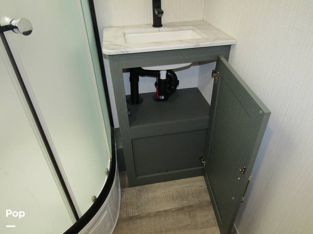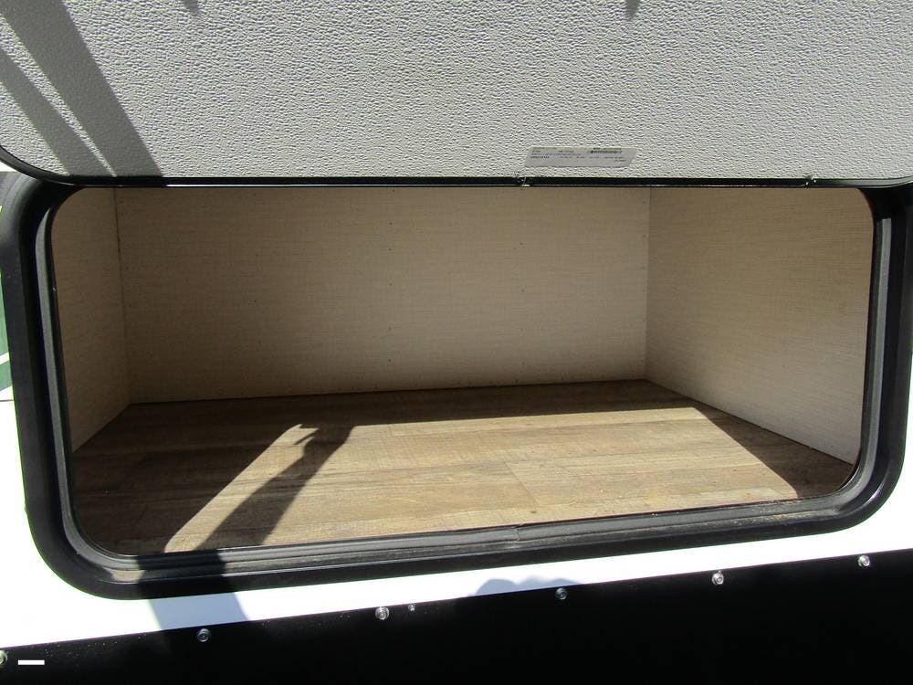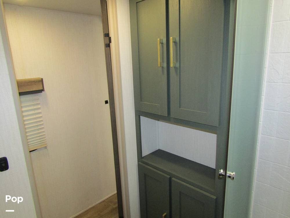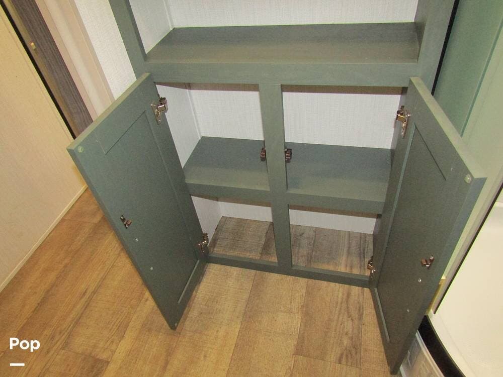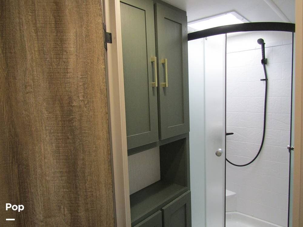 towards the rear of the RV, you'll find a spacious full-size bathroom with a good-size walk-in shower and additional storage. Past that is the master bedroom, with a built-in dresser, a combo washer/dryer, a queen-size bed platform with underbed storage, and a built-in kennel.