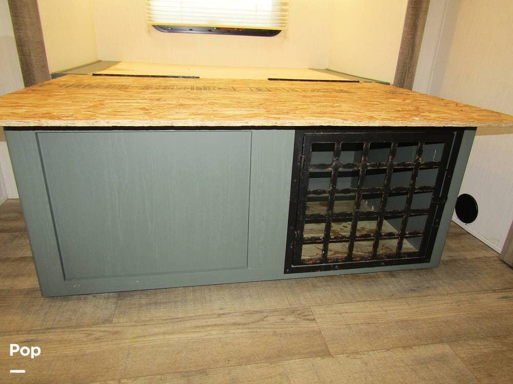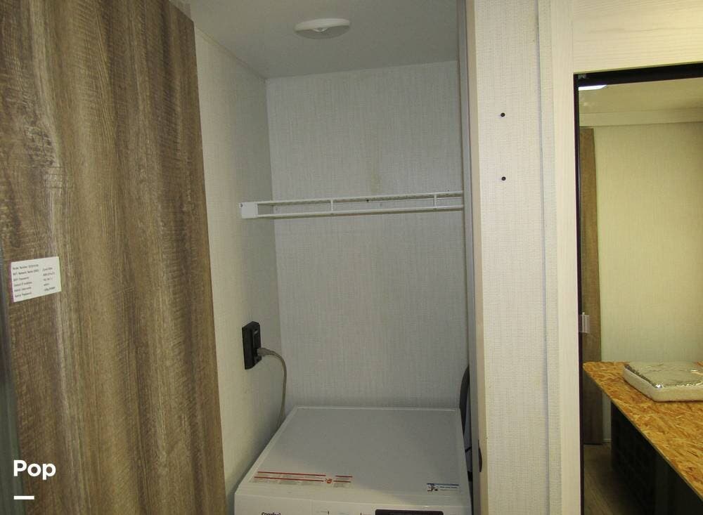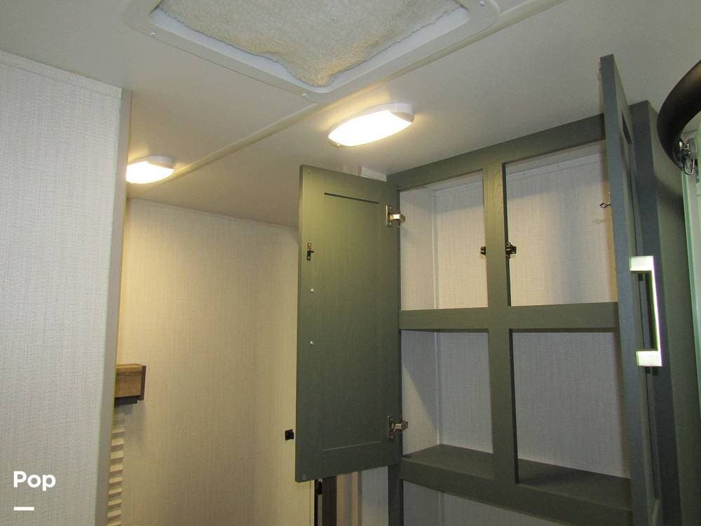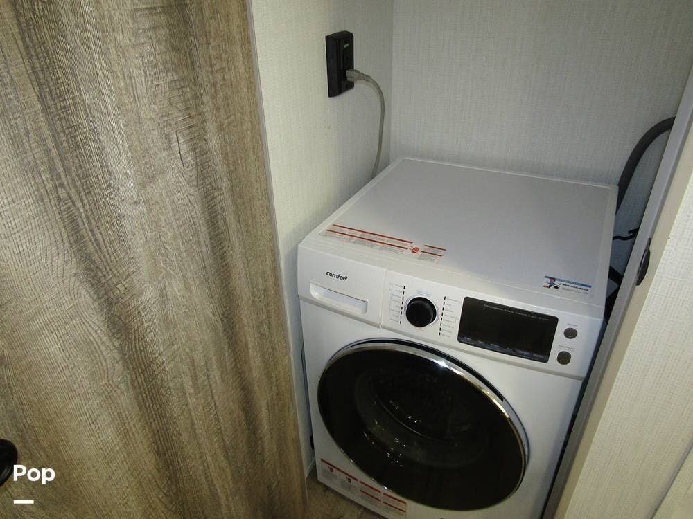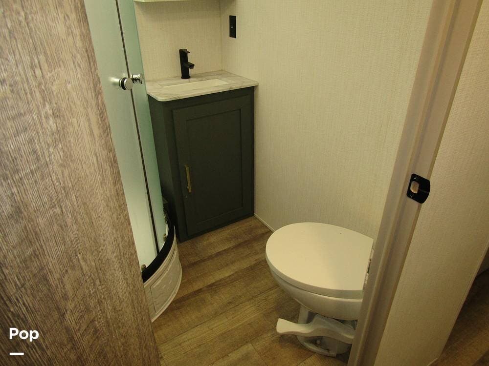 towards the rear of the RV, you'll find a spacious full-size bathroom with a good-size walk-in shower and additional storage. Past that is the master bedroom, with a built-in dresser, a combo washer/dryer, a queen-size bed platform with underbed storage, and a built-in kennel.