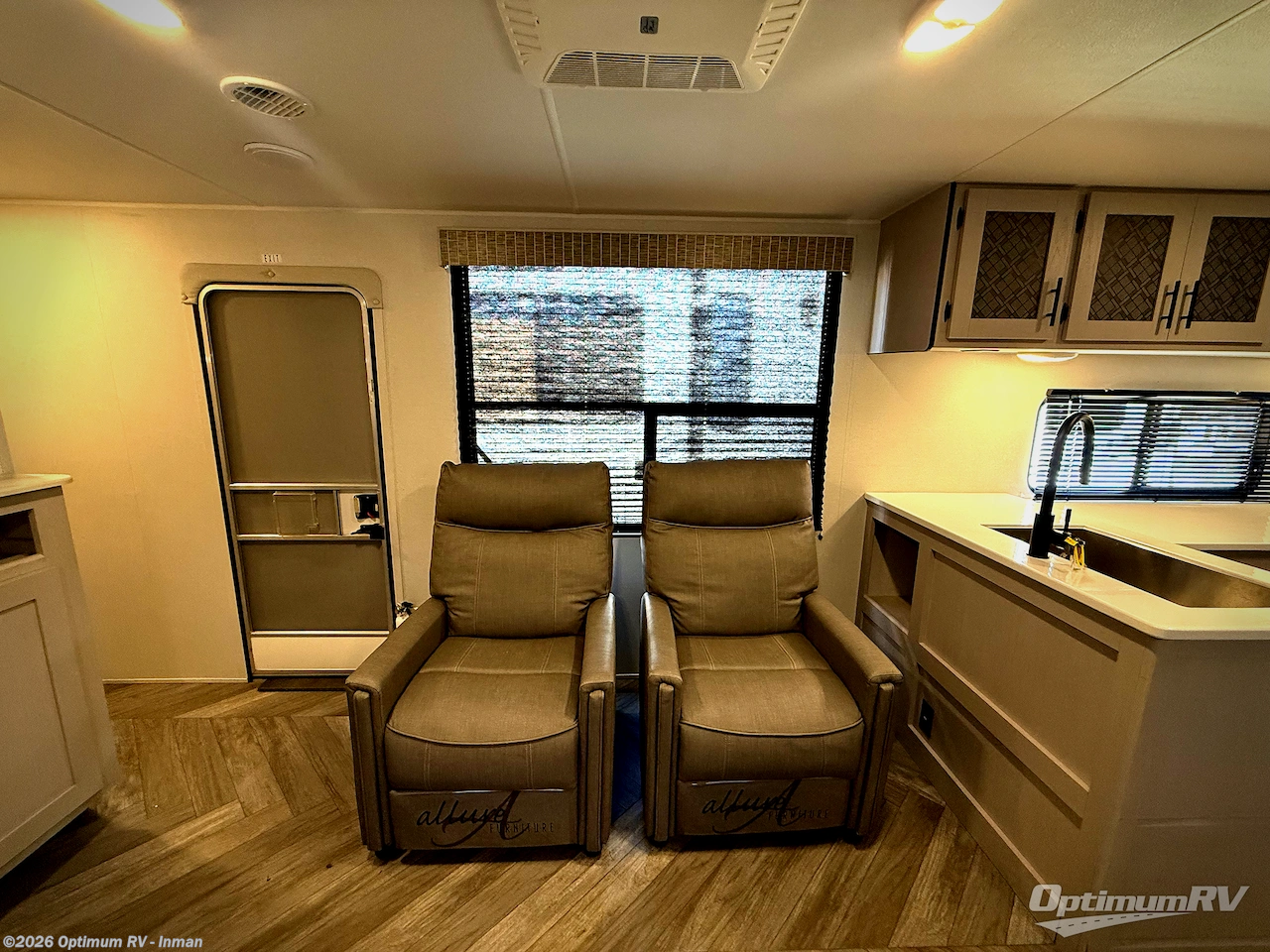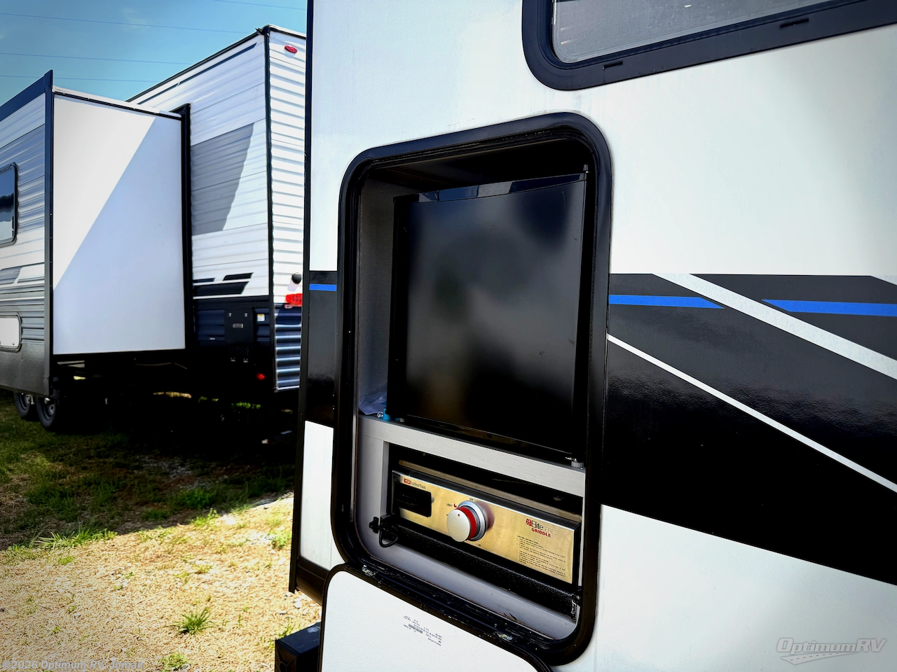 You will feel right at home with this travel trailer! The rear kitchen has plenty of countertop space to prepare your best home cooked meals. The U-shaped dinette is not only great for enjoying meals and playing games, but also for transforming into an extra sleeping space. Relax in true comfort each night on one of the two recliners or sofa by the TV prepped area. Freshen up after a fun filled day with the shower, and then head to the front private bedroom and get a good night's rest on the queen bed. You can even cook in the great outdoors with the outside kitchen that comes with a griddle and refrigerator to enjoy a cold beverage while you flip burgers!