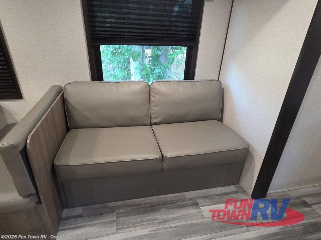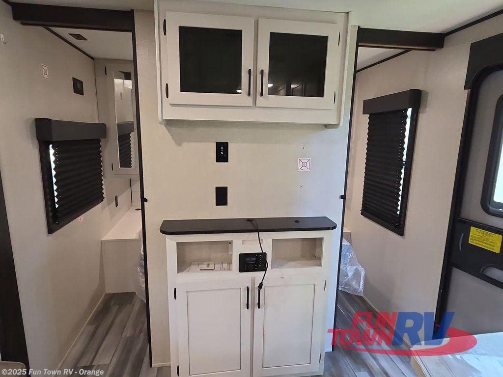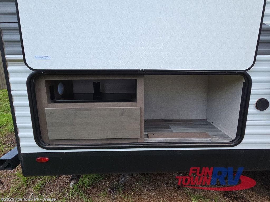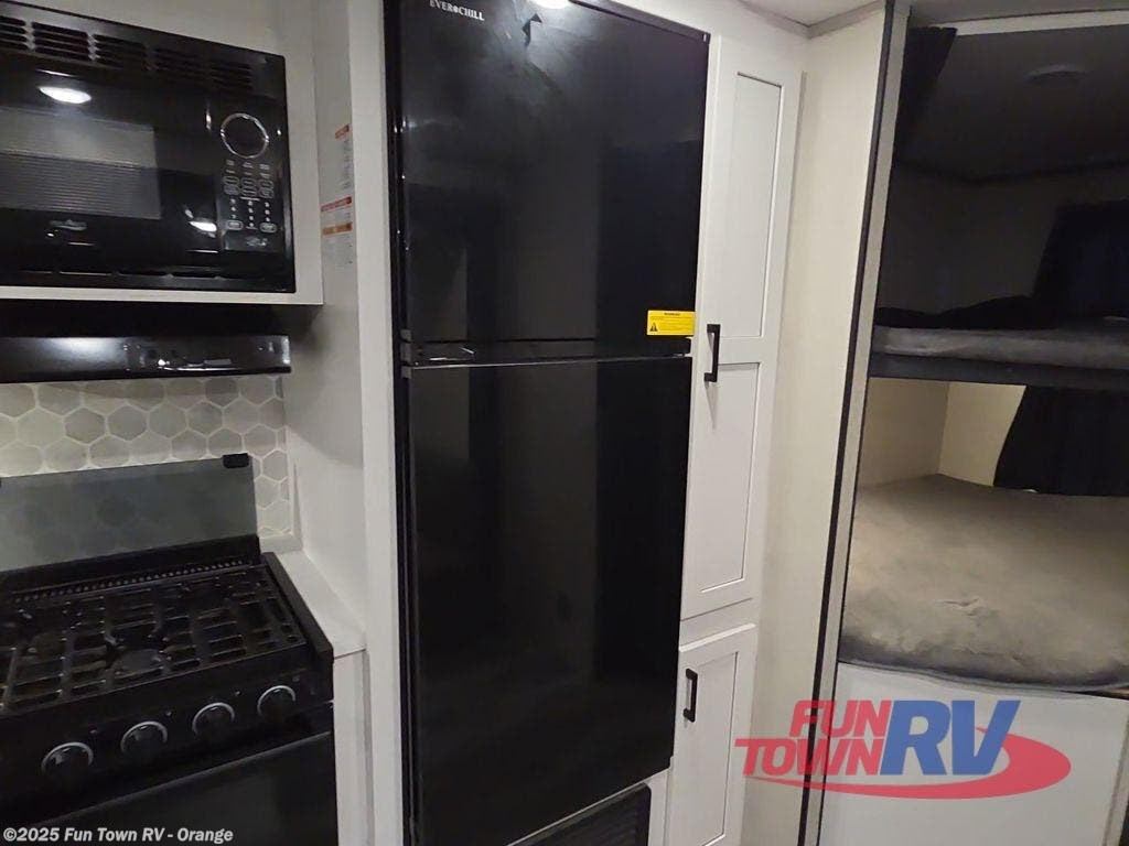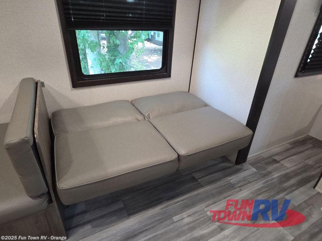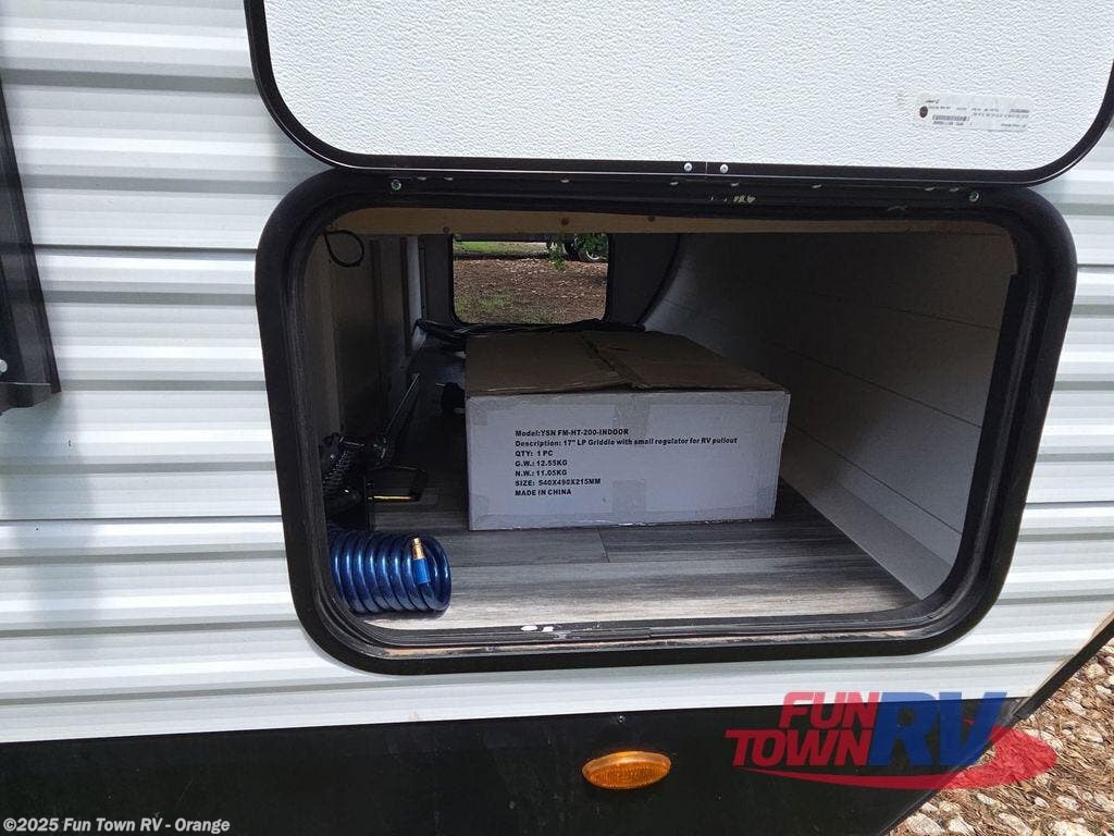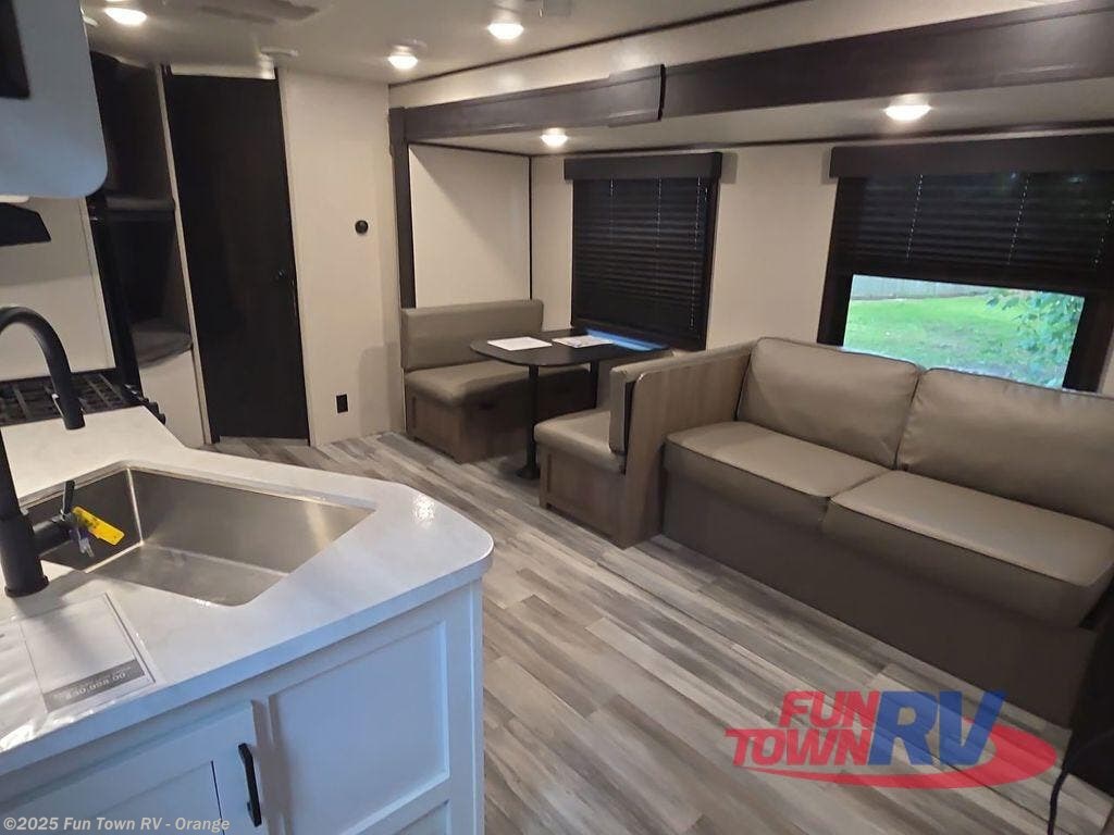 You're going to love every minute spent in this spacious travel trailer. The booth dinette and jack-knife sofa within the large slide out will be perfect for meal times, relaxing, and additional sleeping space. Add the optional Smart TV to the entertainment center and you're set up for movie night! This model includes an outside kitchen with a griddle and a refrigerator for cold drinks, plus indoor appliances if the rain has ruined your plans for the day. You will enjoy your own bedroom up front with space-saving sliding doors and two wardrobes for your clothes.