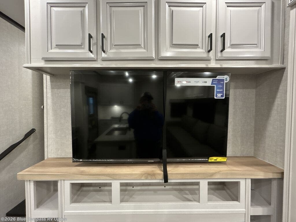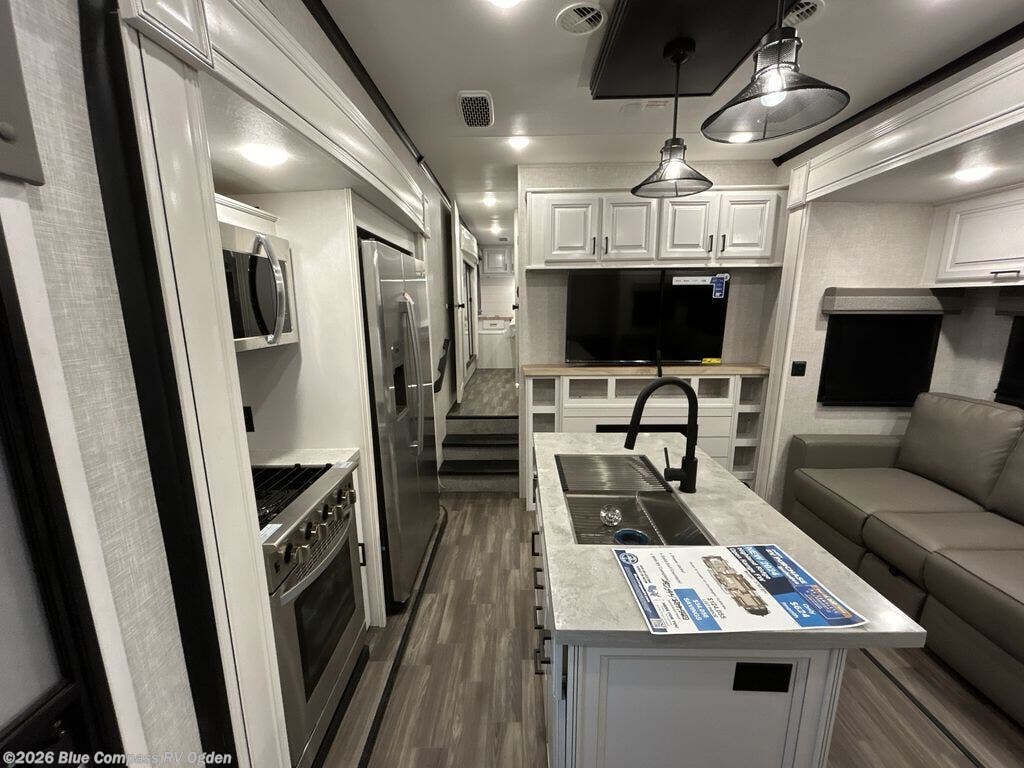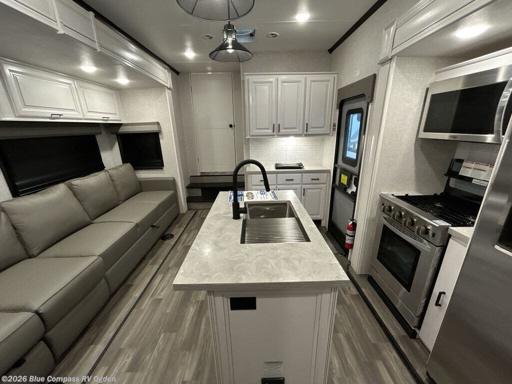 Searching for a fifth wheel that allows you to utilize every room to its fullest? You're going to love this front living area that includes two tri-fold sofas, a 40" TV, a refrigerator, plus a half bath for guests! The main living and kitchen area is spacious with dual opposing slides, and includes a kitchen island, a residential convection microwave and a 23 in. Insignia stove with a three burner range. You can even watch the 50" Smart HDTV with a fireplace below while sitting at the mega lounge with two tables. This seating can provide sleeping space as well, or you might choose the theater seats and table with chairs option in its place. And the rear bedroom offers a walk-around queen bed, a mirrored wardrobe slide out, plus a full bathroom just steps away!