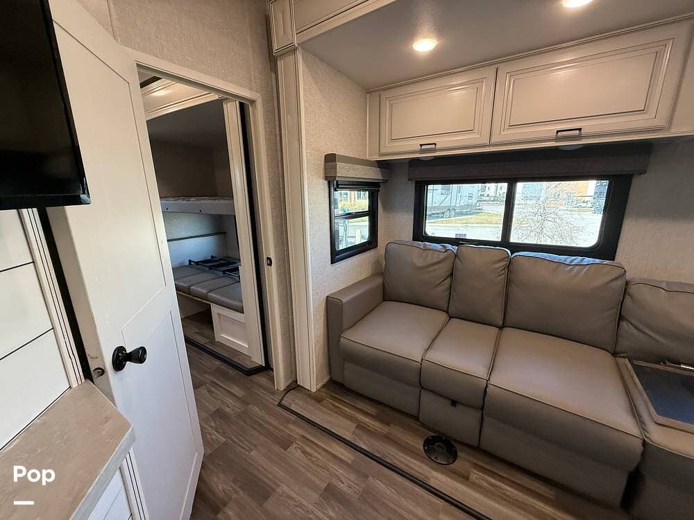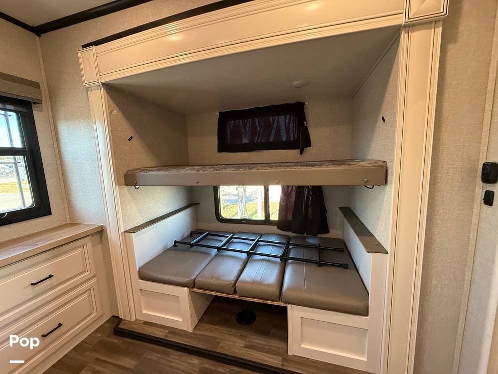 The 2024 Highland Ridge Open Range 395BHS is a luxury wide-body fifth wheel with over 43 feet of living space. This layout features a cozy bunkhouse suite, a kitchen island, and a family-friendly design. Perfect for making memories together!