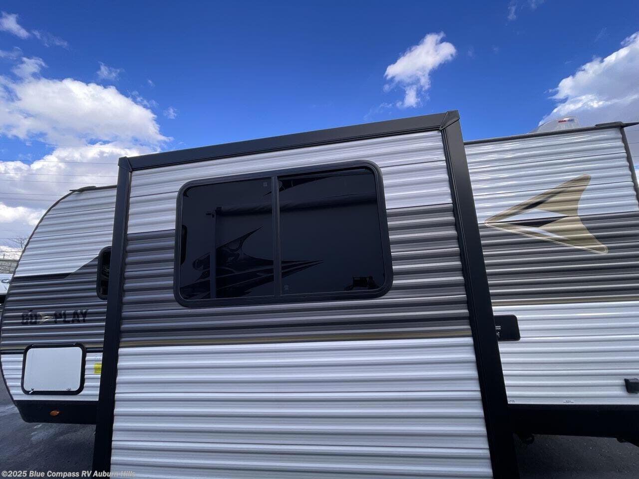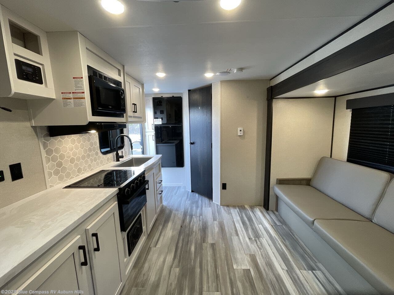 This is the perfect couple's trailer for room for an overnight guest on the jack-knife sofa. You'll appreciate a table in front of the sofa where you can enjoy eating together, and the slide out provides more space to move about. This model includes a front bedroom with a privacy curtain and dual wardrobes to store your clothes for the week, plus there is a full bath towards the back of the unit to stay clean each day. Snacks and paper goods can go in the entryway pantry, and camp gear can be kept in the outdoor storage!
