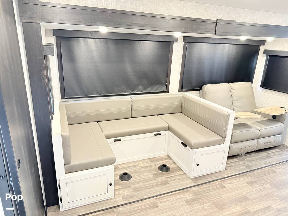 Large spacious interior living area with large U- shape dinette and a comfy sleeper sofa, creating a Great-Room environment, for entertaining or watching your late-night movie. Immediately adjacent is a large galley/Kitchen.
