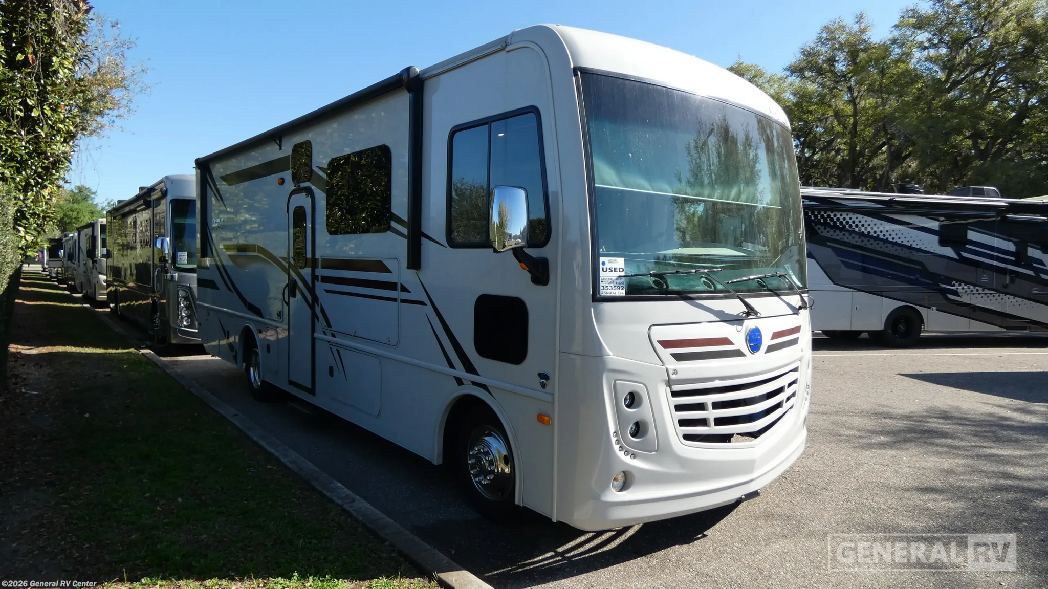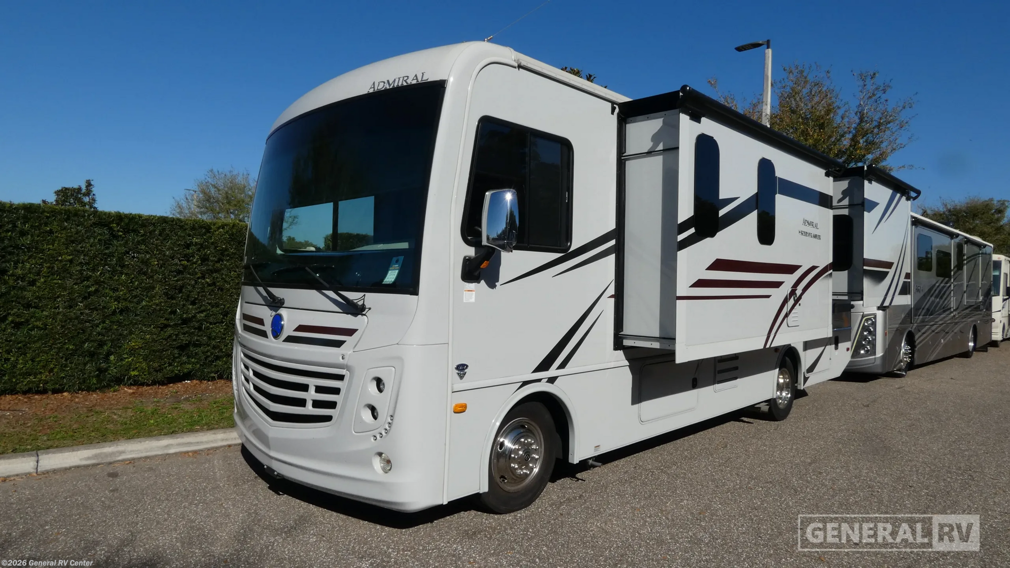 Experience the open road like never before with the 2024 Holiday Rambler Admiral 28A. This motorhome is expertly designed to offer both luxury and practicality, making it the perfect choice for families and adventurers alike. With a spacious interior that sleeps up to eight, you'll find a serene king bed in the rear bedroom and a cozy queen hide-a-loft electric drop-down bed in the front, ensuring restful nights wherever you travel. The convertible dream dinette and jackknife sofa add versatility, transforming living spaces into additional sleeping areas with ease. The Admiral 28A boasts a thoughtfully arranged center kitchen, equipped with a three-burner cooktop and a full-size refrigerator powered by electric and propane options. Whether you're whipping up a quick meal or preparing a family feast, this kitchen is ready for all your culinary adventures. The front living area offers a welcoming space to relax, complete with an LED TV for entertainment on the go. The rear bath, with its sleek plastic/glass shower, provides a private retreat after a day of exploration. Outside, the 20 ft. powered retractable awning creates the perfect outdoor living space, complemented by an exterior entertainment center. Built on a robust Ford F53 chassis with a powerful 335 horsepower engine, the Admiral 28A ensures a smooth and reliable journey. With a towing capacity of 8,000 lbs and ample storage, your adventures are limitless. Discover the freedom of the road with the Holiday Rambler Admiral 28A, and visit your nearest General RV dealership to explore this exceptional RV in person.